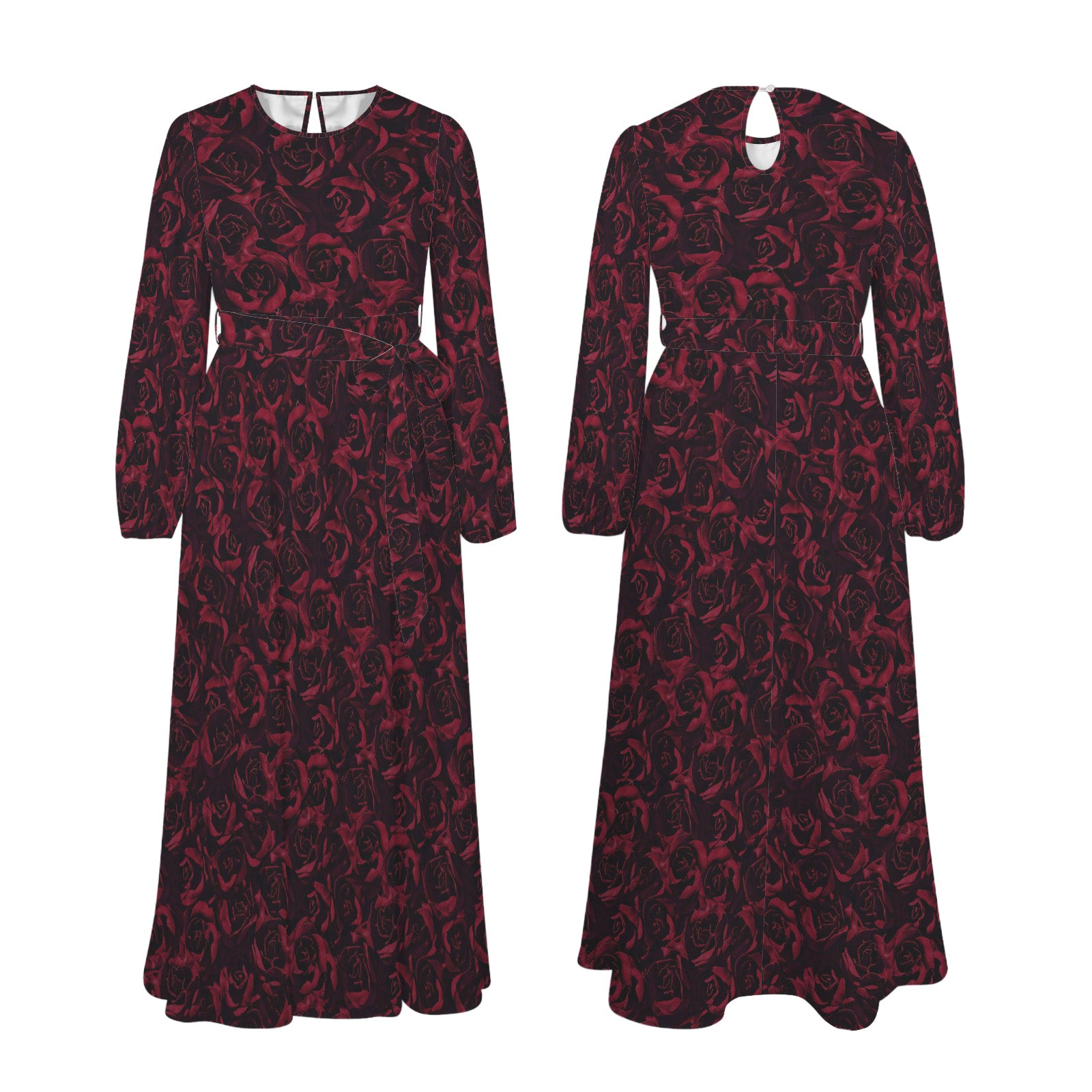 Embrace dark romance and timeless elegance with the ANTIBrand Blood Roses Maxi Dress. This full-length gown features a deep red rose motif on a black backdrop, capturing the beauty of decay and desire. With a round neckline, flowing sleeves, and a matching belt to cinch the waist, it’s a perfect blend of gothic sophistication and comfort.