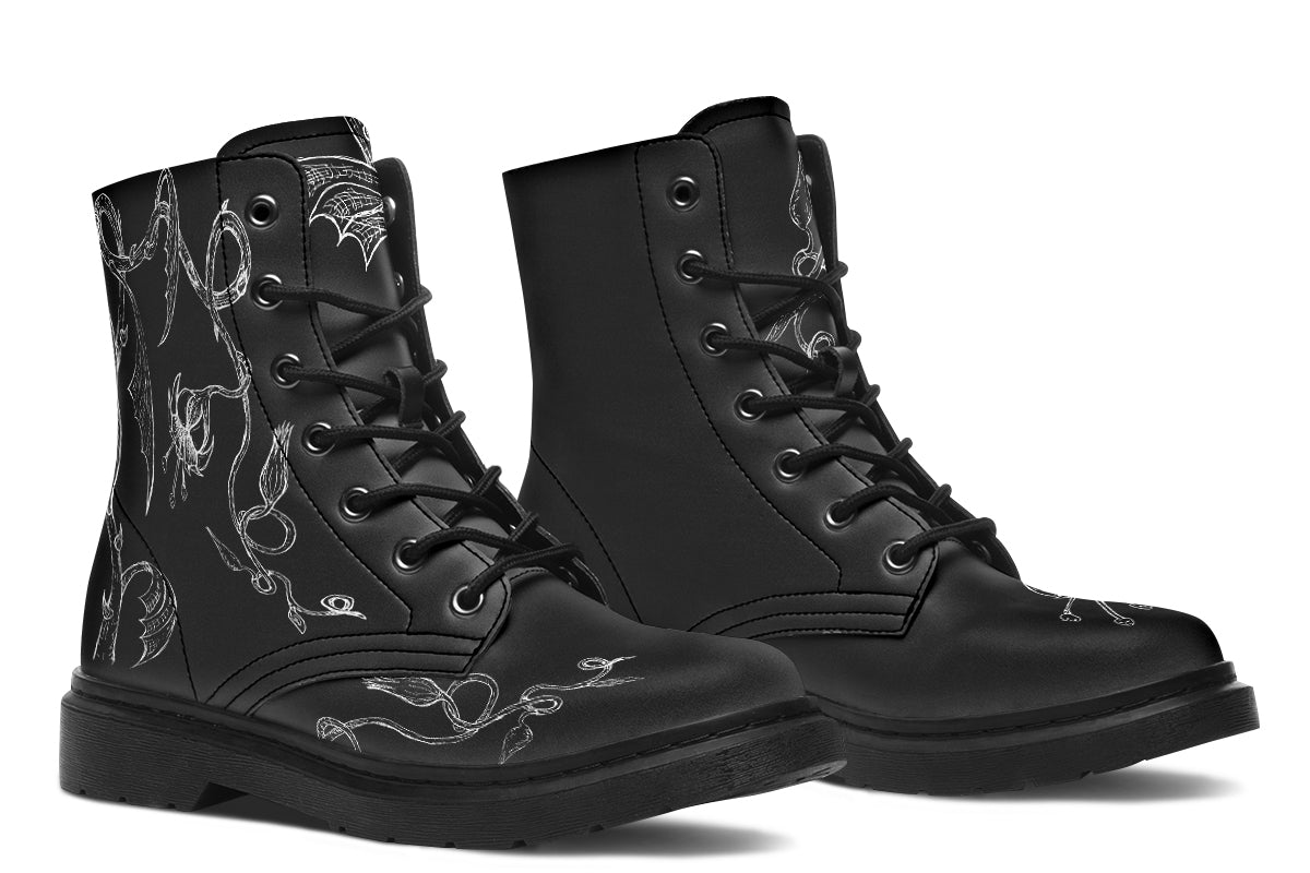 March through midnight in art you can wear. These gothic combat boots are wrapped in Kate’s hand-drawn Soul Flower—a strange bloom with spiky petals, tiny skull stamens and wing-like leaves—etched in chalky white across jet-black vegan leather. Built for daily stomping with a wider fit and solid support, they deliver statement style that’s comfortable from the first step.