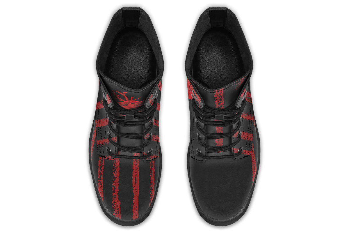 Unleash what beats beneath. The Uncaged Heart combat boots feature Kate’s hand-painted design — vivid red anatomical hearts paired with dark crimson stripes scarring across matte black vegan leather. A striking blend of strength and vulnerability, these boots embody the spirit of rebellion and self-expression that defines ANTIBrand.