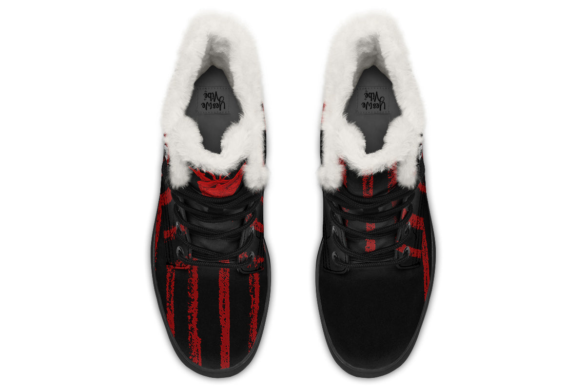 Keep your heart warm while you walk the darker path. The Uncaged Heart fleece-lined boots wrap Kate’s bold red heart and stripe artwork around soft black micro suede, finished with a plush faux-fur interior for comfort that doesn’t compromise attitude. Fierce, warm, and unashamedly goth.