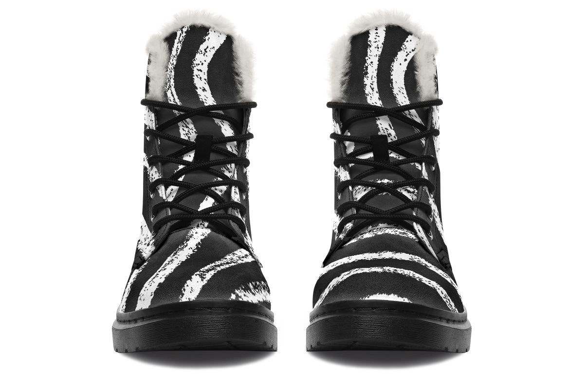 Cold-weather goth style just levelled up. These fleece-lined combat boots are wrapped in Kate’s hand-painted White Stripes Done Right artwork — raw, chalk-textured white stripes over matte black micro suede — and finished with a soft faux-fur interior for all-day comfort and warmth.