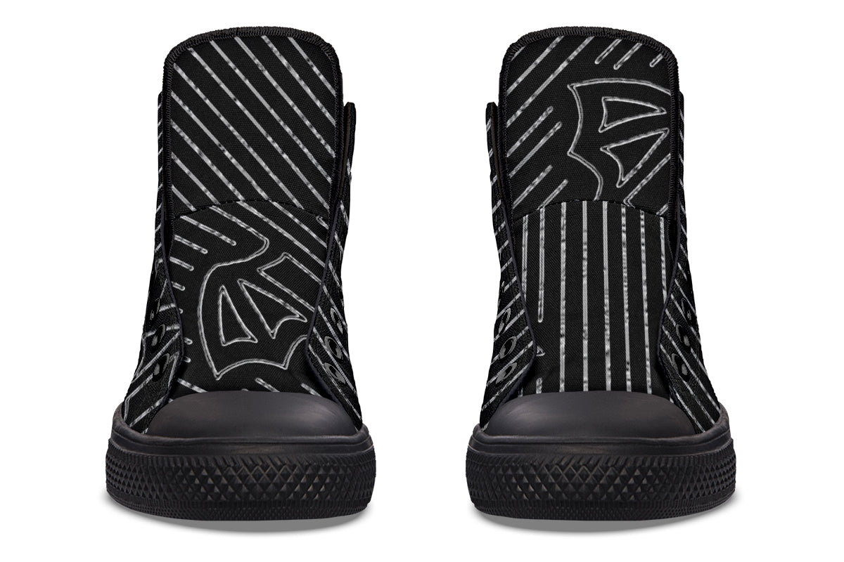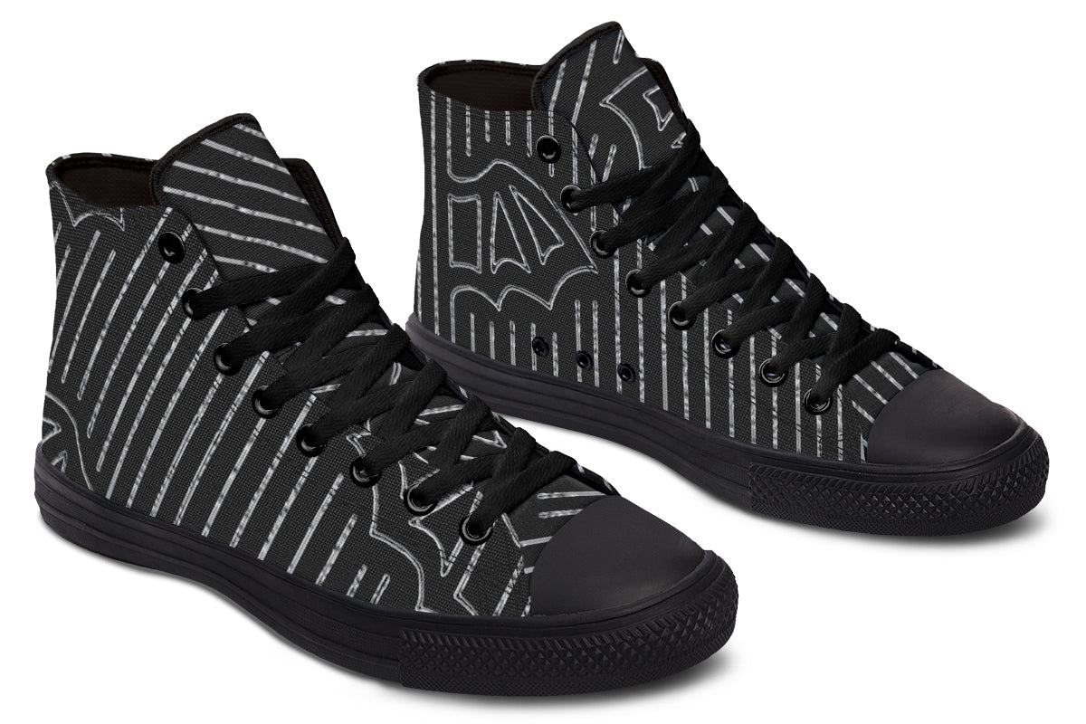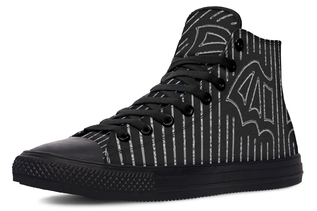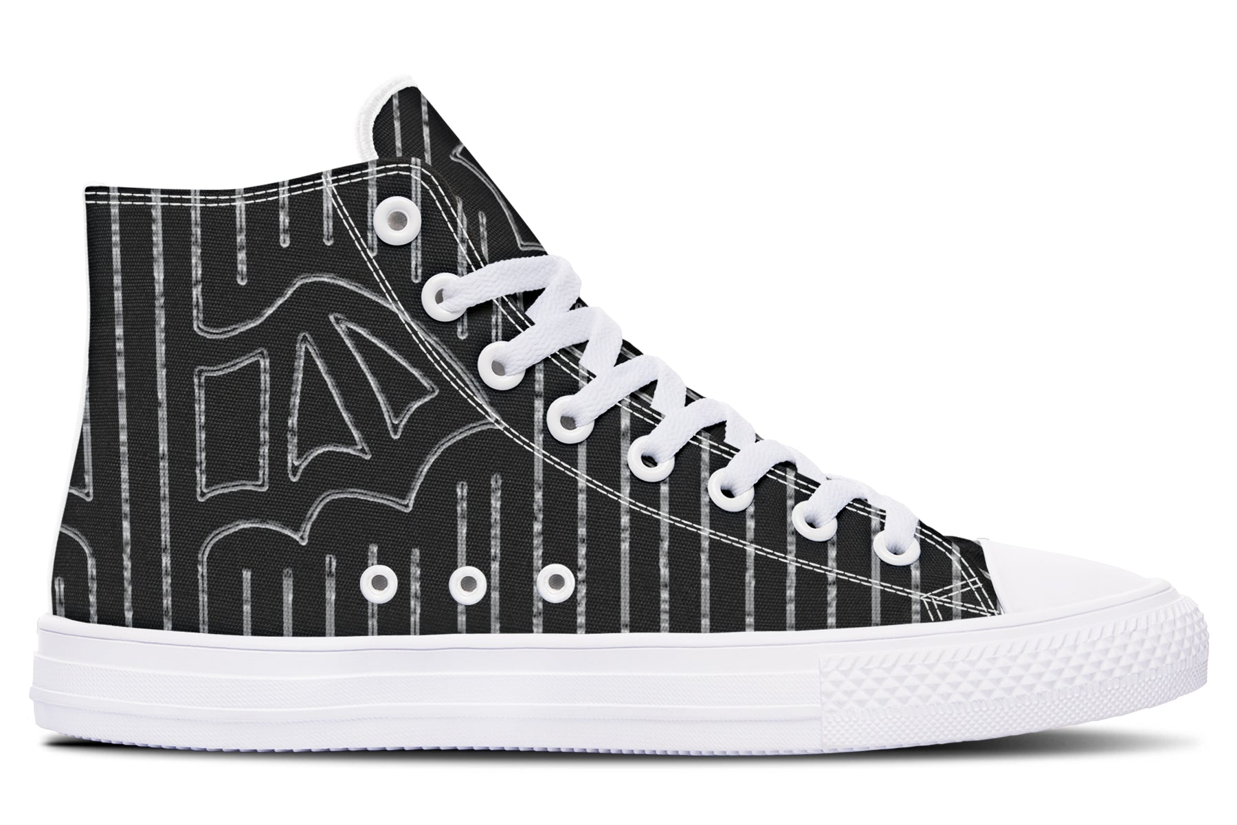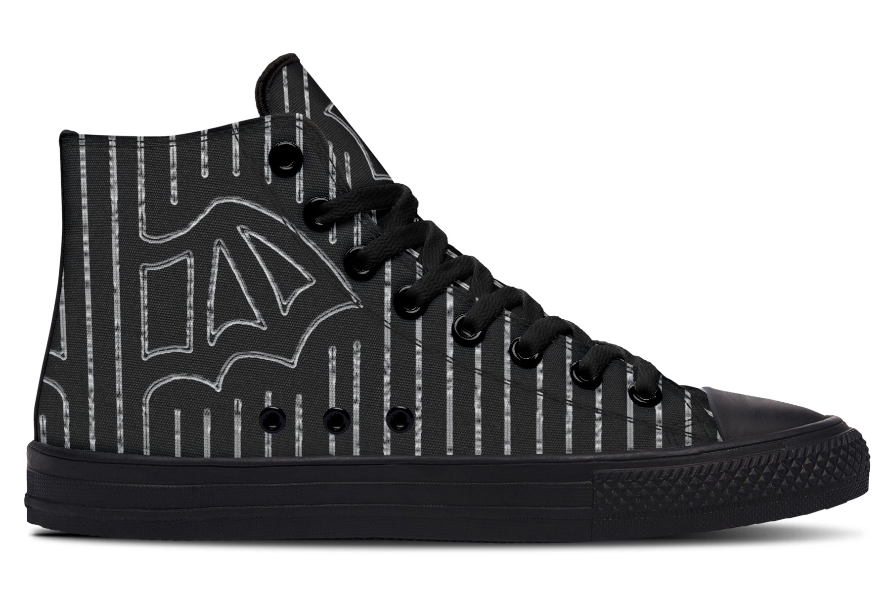 Bring your goth aesthetic to the streets with the ANTIBrand Big Bat Haus Pinstripe High Tops – Black. Designed with bold white gothic patterns and pinstripe detailing, these trainers combine dark minimalism with alternative streetwear edge. Their high-top construction provides support, while the durable canvas ensures they’re made to last.