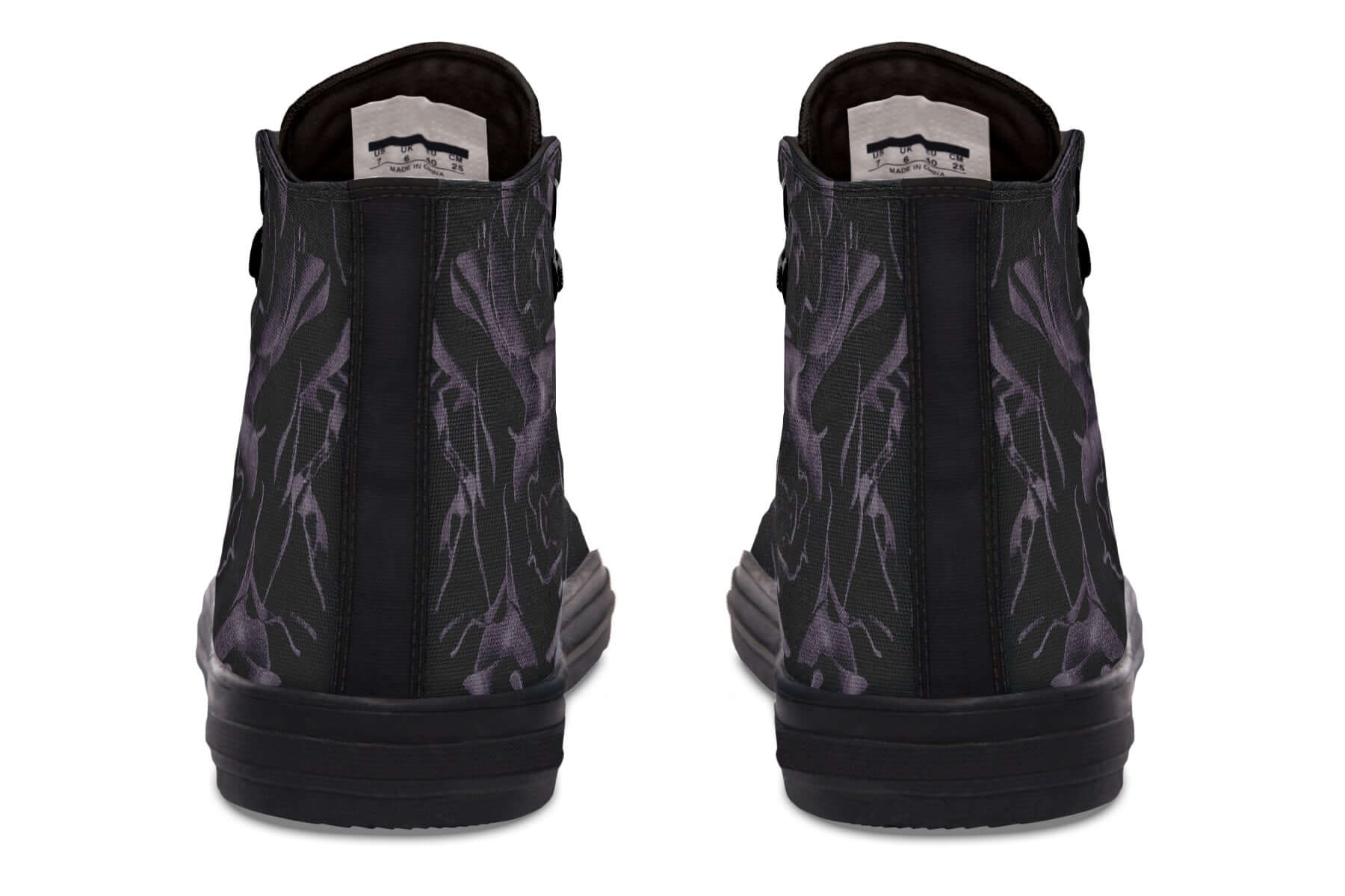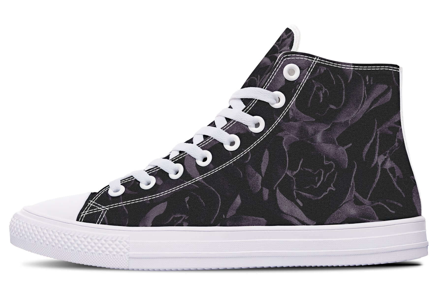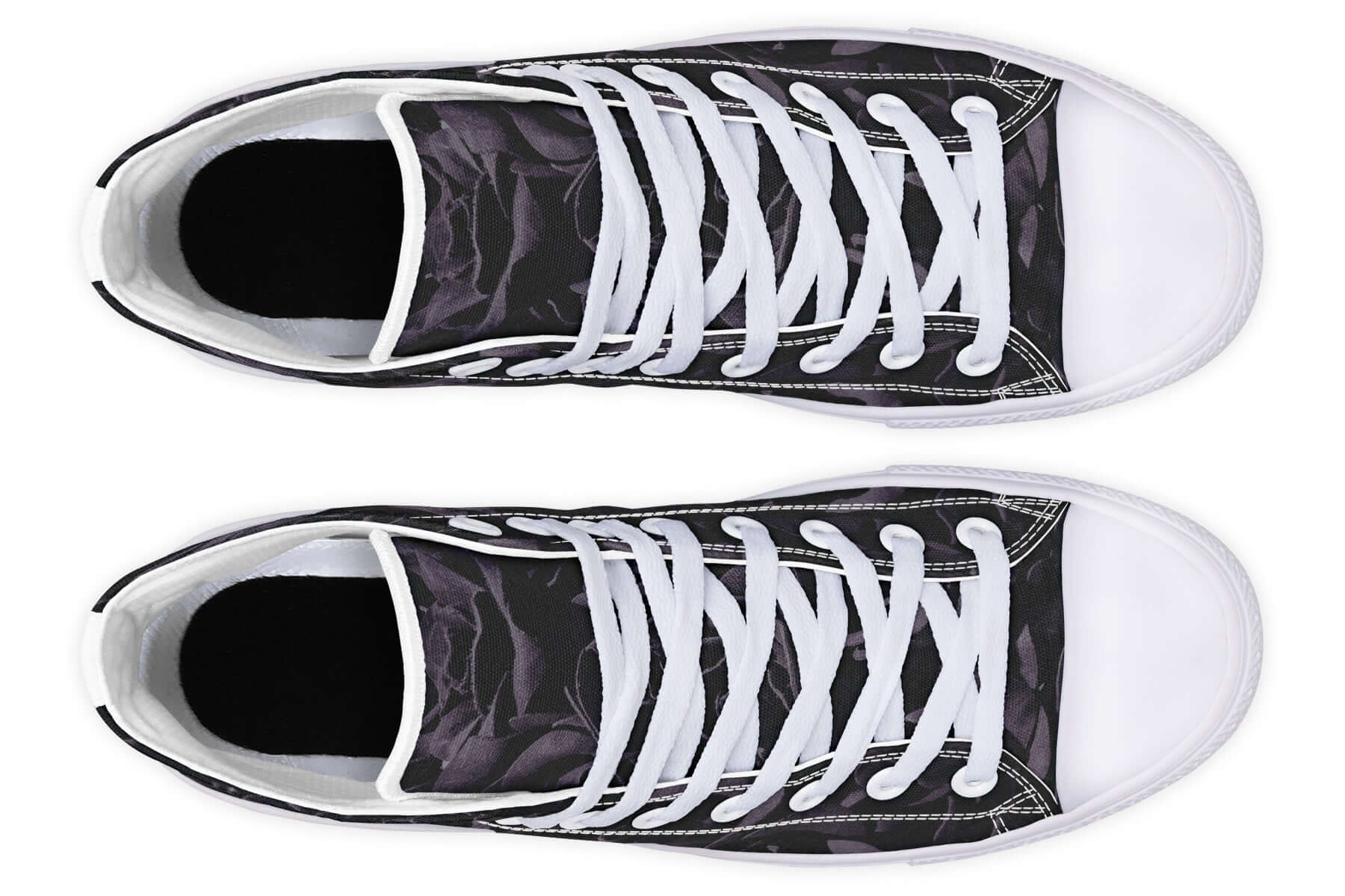 Elegantly dark. The Blackest Roses High Tops feature a ghostly violet rose print that reveals itself subtly on a jet-black canvas. Perfect for those who appreciate quiet drama and deep florals with a gothic twist.