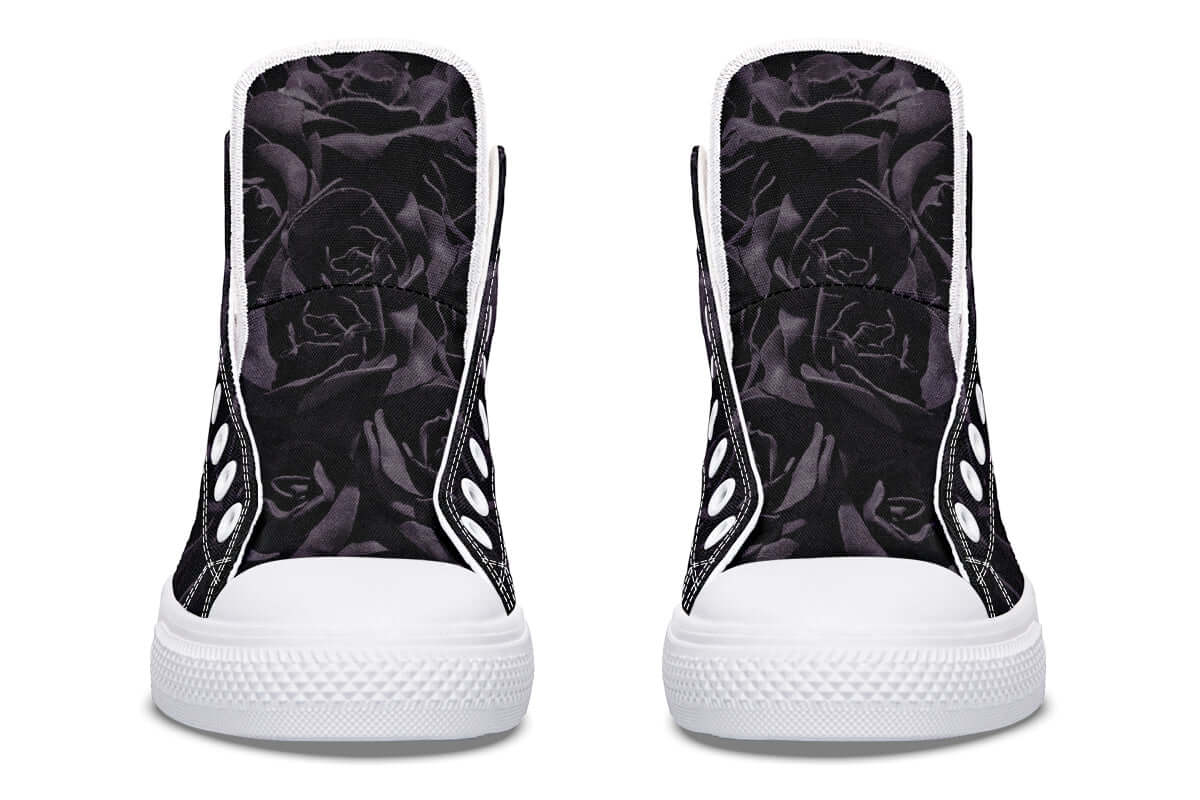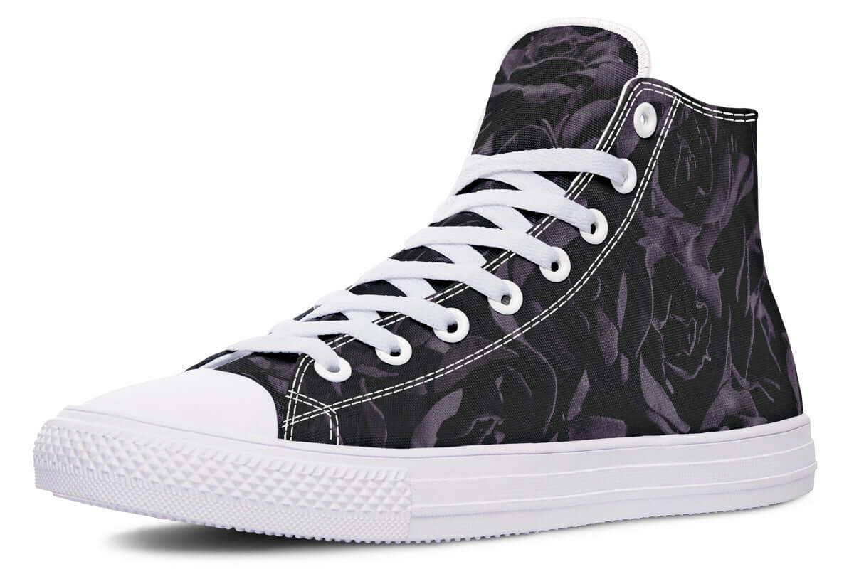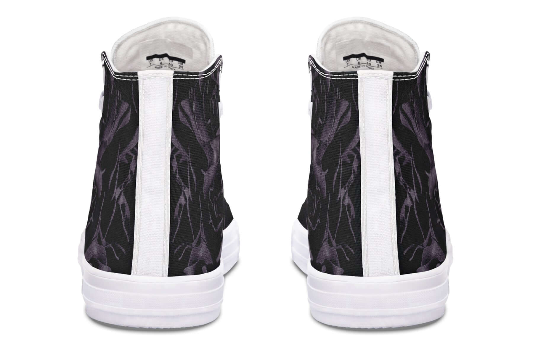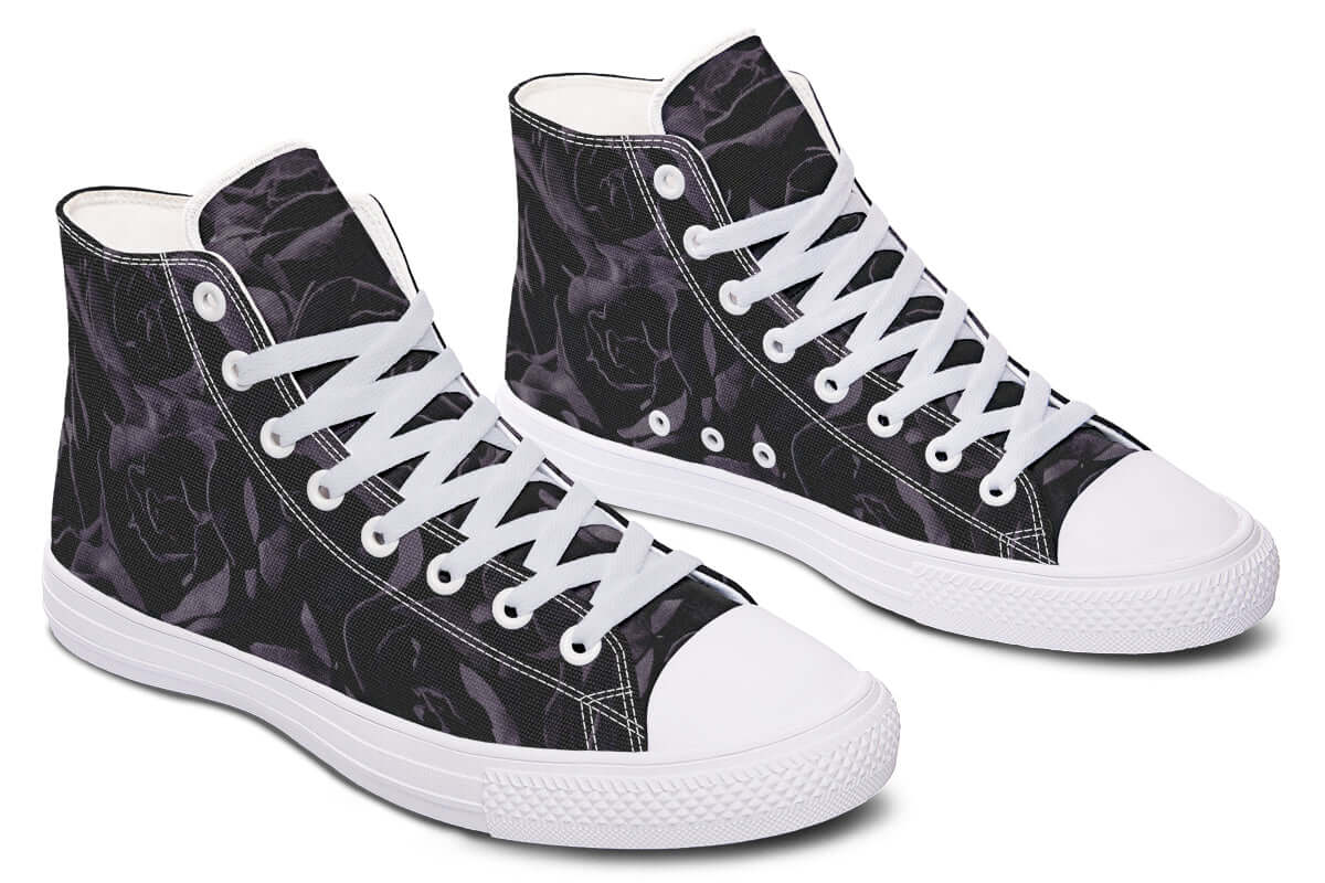 Elegantly dark. The Blackest Roses High Tops feature a ghostly violet rose print that reveals itself subtly on a jet-black canvas. Perfect for those who appreciate quiet drama and deep florals with a gothic twist.