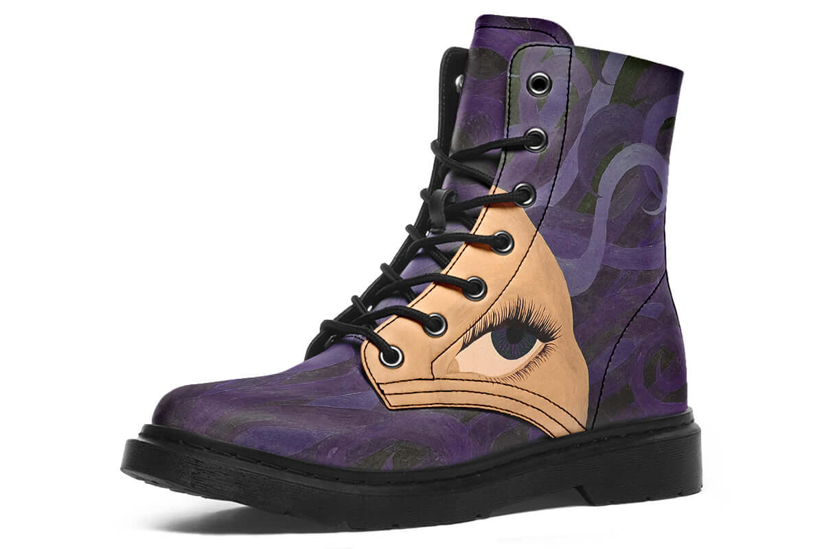 Step into wearable art with the “Side-Eye” Boots from ANTIBrand, featuring original artwork by Kate — digitally adapted from her own hand-painted canvas. These statement lace-up boots are fierce, unforgettable, and built for comfort as well as impact.