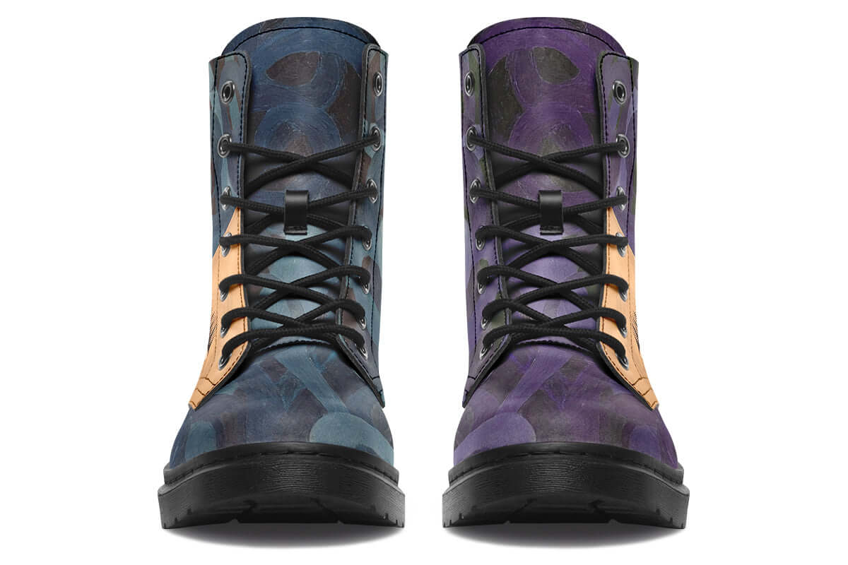 Each pair is mismatched by design: the left boot in rich violet purple, the right in moody turquoise, both swirling with stylised, brushstroke-like hair and anchored by a bold sideways eye graphic. It's gothic surrealism in motion — expressive, curious, and unapologetically individual.