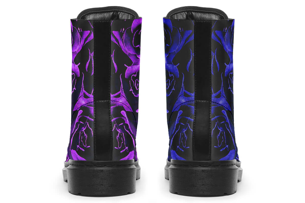 Stand tall in bloom and rebellion with the Purple & Indigo Roses Vegan Combat Boots by ANTIBrand. A hypnotic blend of twilight purple and electric indigo roses wraps these combat boots in unapologetic floral darkness.