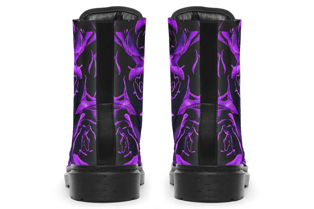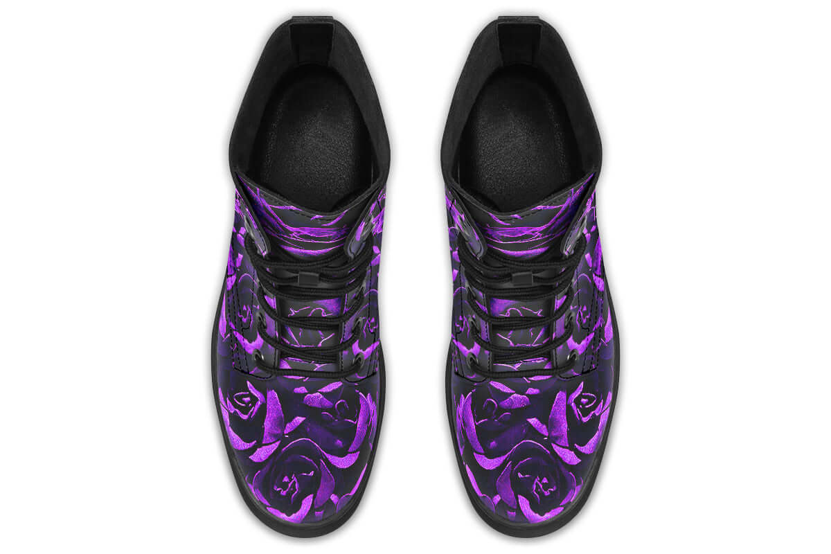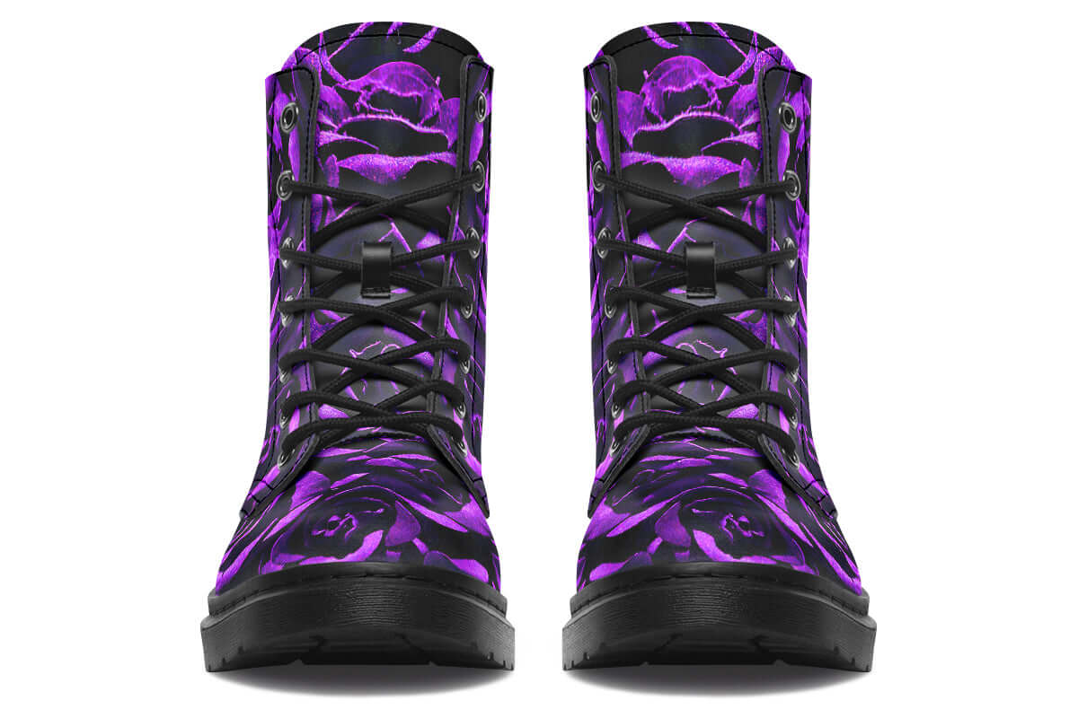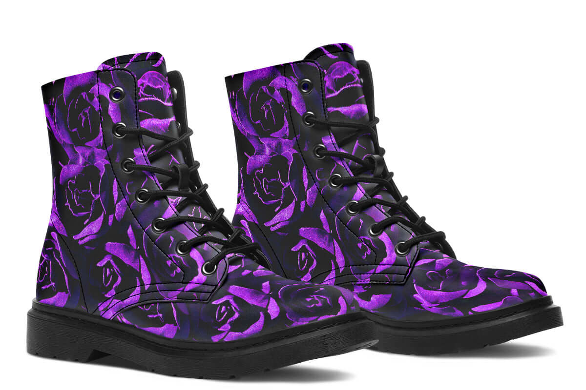 Step into botanical darkness with the Purple Roses Vegan Combat Boots by ANTIBrand. Designed for gothic romantics, these boots showcase an all-over vivid purple rose print against a black base, blending fierce beauty with conscious craftsmanship.