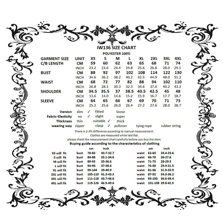 XXL: Bust 114, Waist 94, C/B Length 68