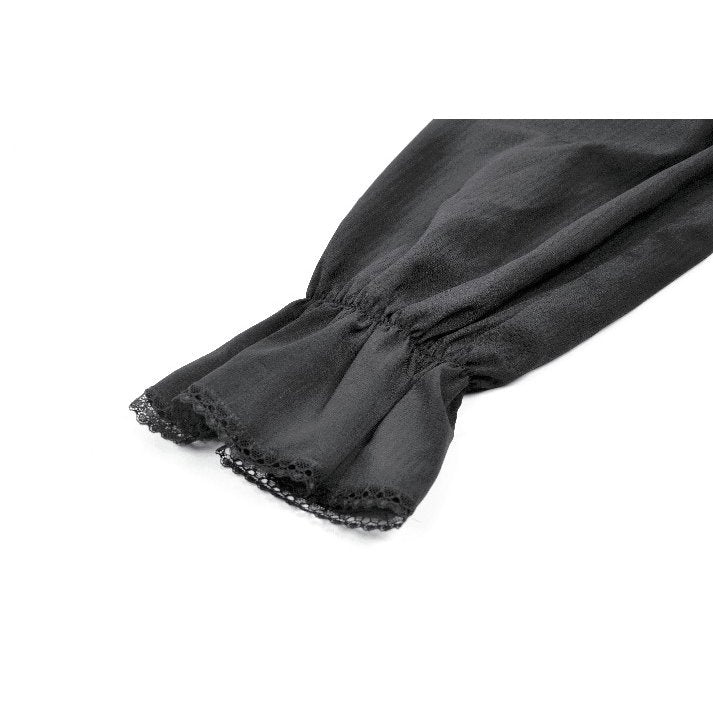 Channel your inner dark romantic with the Desdemona Victorian Mini Dress by Dark in Love. This elegant black dress features long bishop sleeves with ruffled cuffs, a detailed lace trim hem, and delicate embroidery running down the bodice. The button-down front and mandarin collar lend a regal Victorian air, while the tiered lace skirt gives the silhouette a youthful, dolly-goth edge.