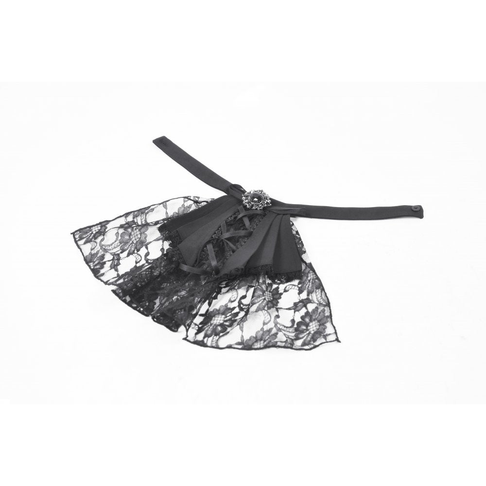- Elegant ruffle bib with black lace and corset-style ribbon detail