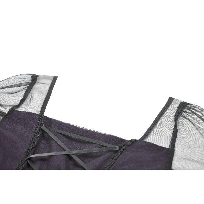 Make an entrance in this breathtaking Gothic maxi dress from Dark in Love. Crafted in layers of flowing black mesh and deep plum fabric, this showstopping design features dramatic tiered bell sleeves, delicate lace trim, and a corset-inspired bodice with faux pearl detailing. The squared neckline and sheer mesh sleeves exude elegance, while the full-length skirt adds timeless drama. Ideal for gothic events, elegant soirées, or simply expressing your dark romantic aesthetic.