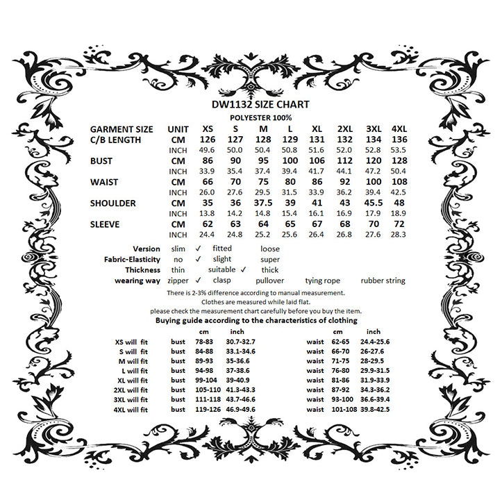 Loved this dress , it looked amazing on and was more detailed than expected . The fit was true to size as was the length and I had loads of compliments as a spider queen , I also ordered last minute and the customer service was brilliant and it arrived in time . An all round great experience not just for Halloween but for my ever increasing goth wardrobe thanks
