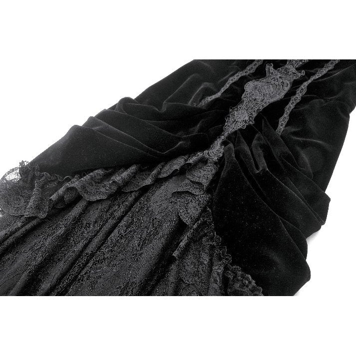 Turn heads in dramatic dark elegance with the Dark in Love Vampiress Royal Velvet and Lace Maxi Dress. This exquisite piece features a luxurious black velvet bodice adorned with intricate grey embroidery, accentuating your silhouette with corset-inspired panel shaping. The elegant gathered drape leads into a full-length sheer lace skirt that sways with every step, adding gothic drama to your look. Perfect for gothic queens, dark fairies, or anyone craving romance with a regal twist.