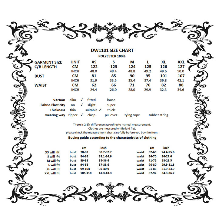Refer to the size chart image for detailed garment measurements in cm and inches. Garment runs fitted with slight elasticity and features a zipper closure. Choose your size based on bust and waist for the best fit.