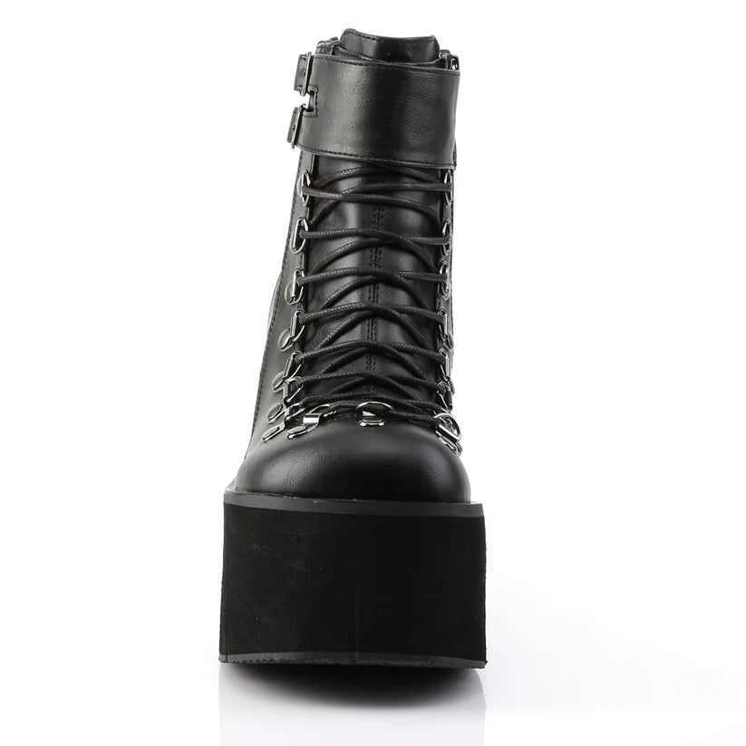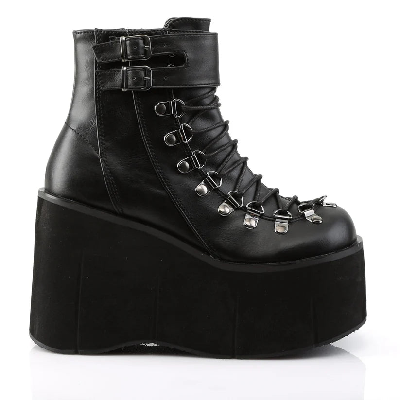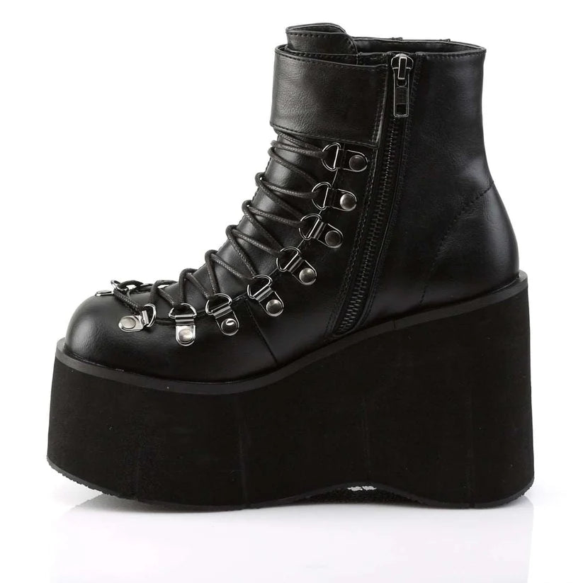 Step out with attitude in the Demoniacult Rague Women's Ankle Boots. These faux lace-up boots feature a 4 1/2" (11.4cm) heel that adds a bold lift, while the adjustable ankle cuff ensures a perfect fit. The convenient side zip makes slipping them on a breeze. Perfect for turning heads and adding a playful edge to any outfit!