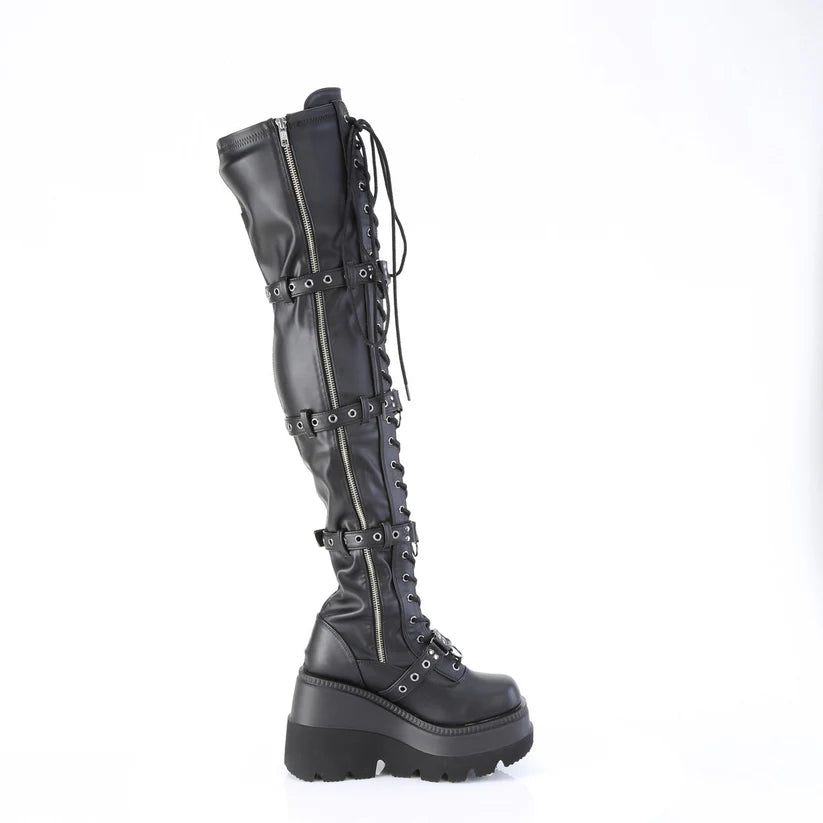 Step into bold style with the Demoniacult Railey Women's Over-the-Knee Boots. Featuring a 4 1/2" wedge platform and a front lace-up design, these thigh-high boots bring fierce attitude to any outfit. Quadruple skull buckle straps and ornamental zip details add edgy flair, while the full inner side zip ensures easy wear. Perfect for making a statement with every step!