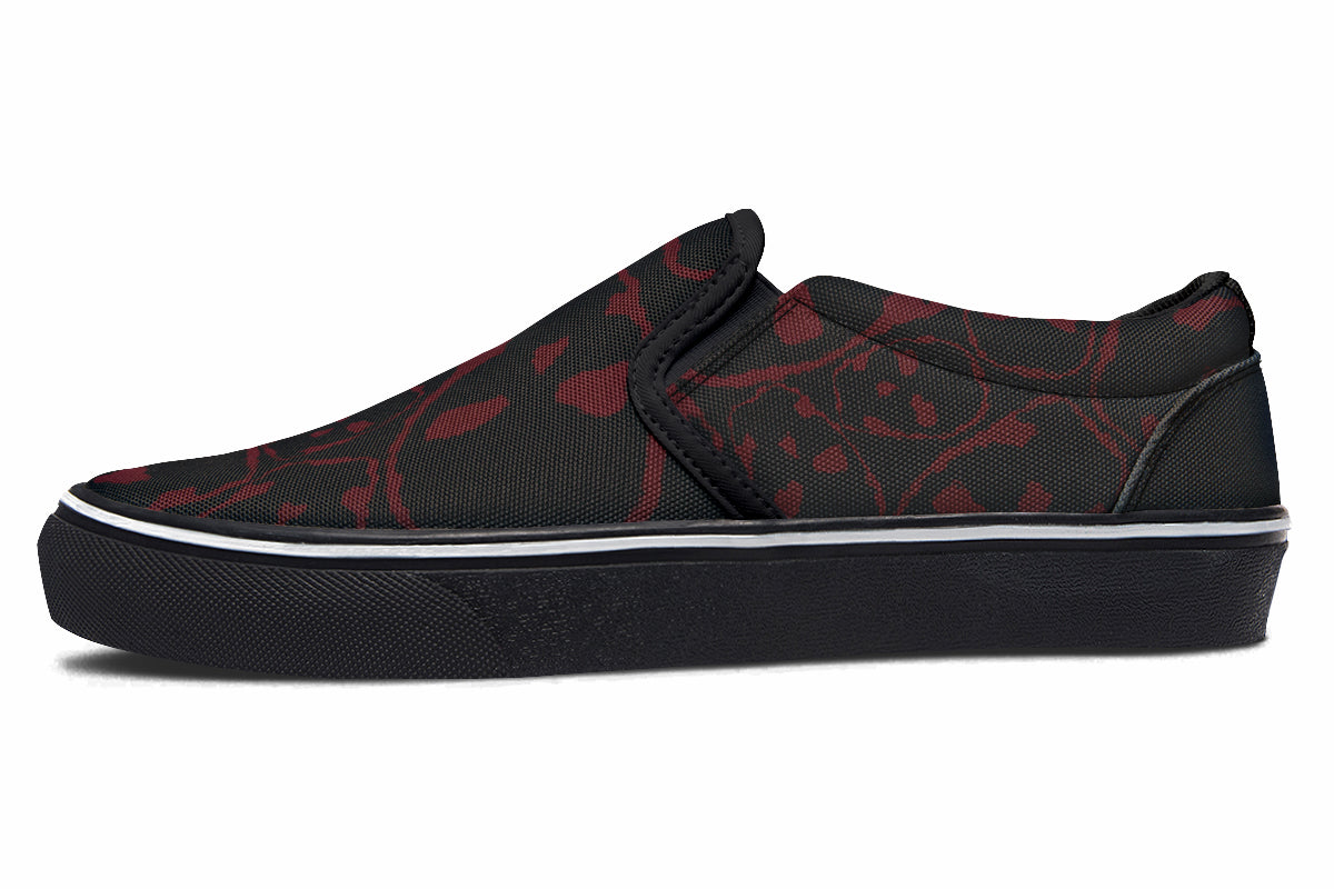 The ANTIBrand Gothic Attitude The Tumbling Blood Skulls Slip-On Shoes – Black/Red make a statement with cascading skull patterns in deep blood red. Perfect for goths who like their footwear bold, these slip-ons mix striking visuals with everyday comfort, offering a cushioned removable insole and durable construction.