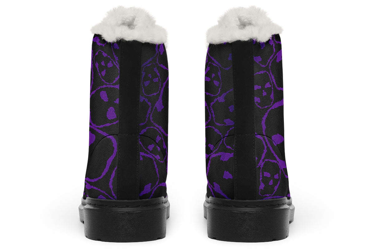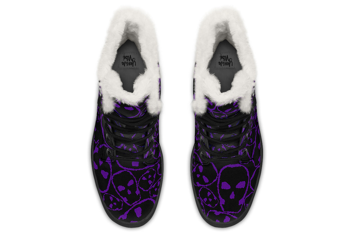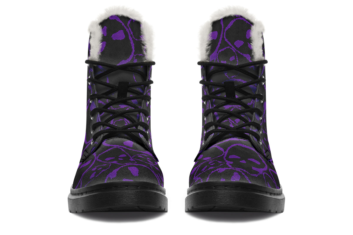 Turn every step into a gothic statement with the ANTIBrand Tumbling Purple Skulls Fleece Lined Boots. These striking boots showcase vibrant purple skull outlines against a black backdrop, making them impossible to ignore. Inside, a fleece lining provides ultimate warmth and comfort, perfect for braving cold nights with dark elegance.