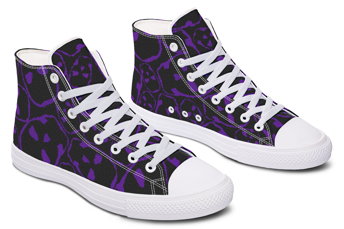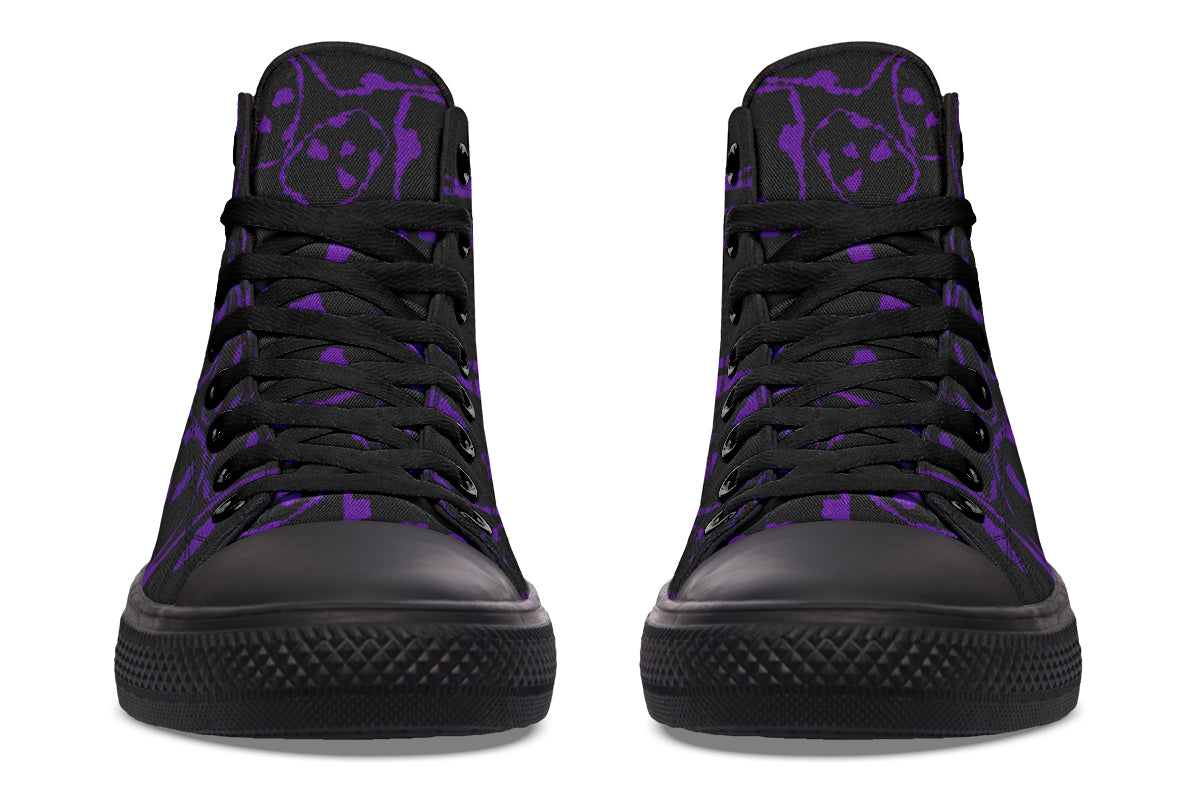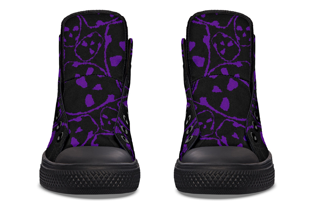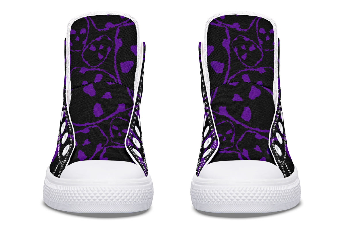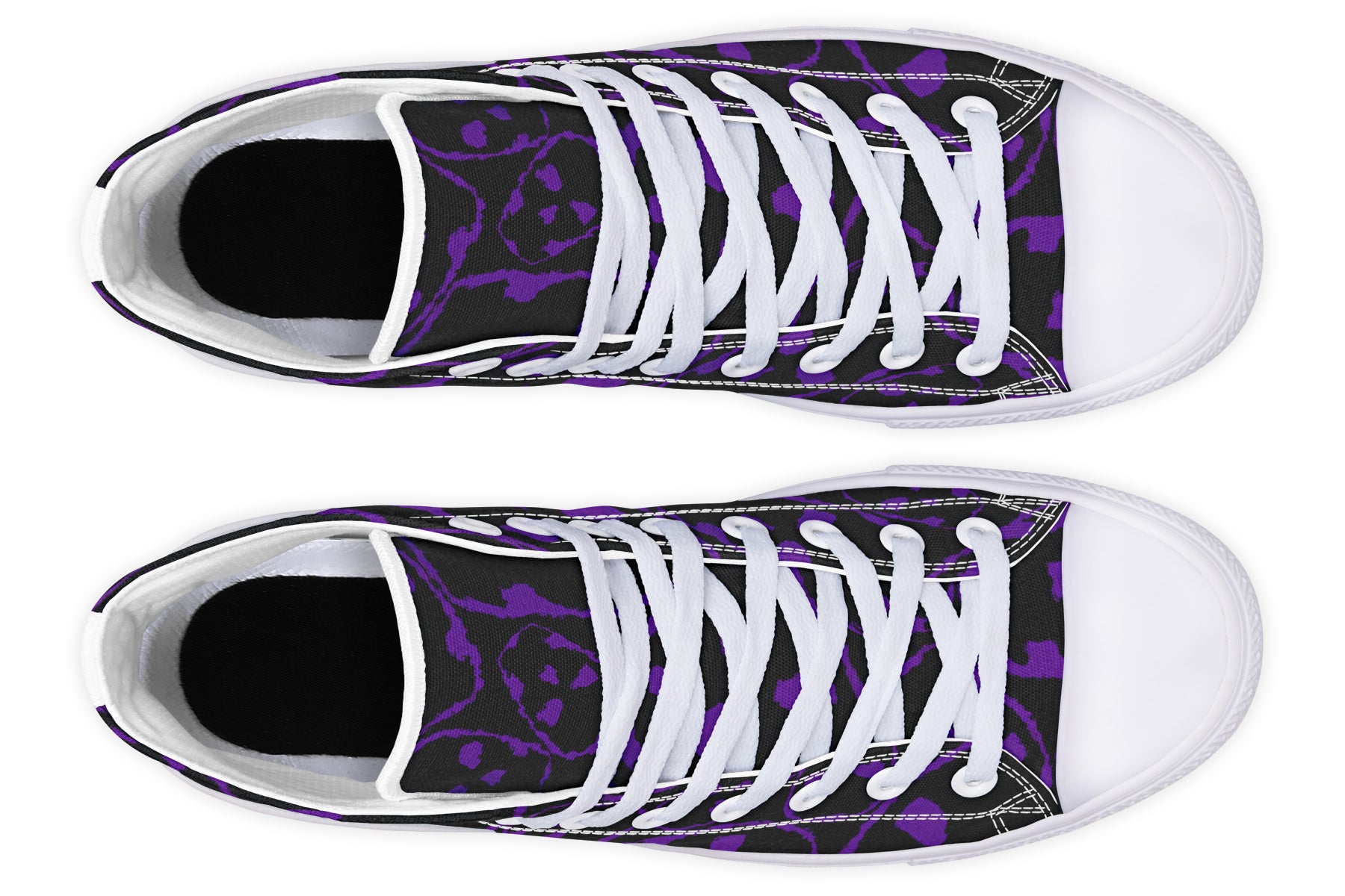 Add a bold twist to your gothic footwear with the ANTIBrand Tumbling Purple Skulls High Tops – Black. Showcasing an all-over skull design in vibrant purple against a black canvas base, these high tops make a striking statement for any alternative outfit. Built for both comfort and edge.