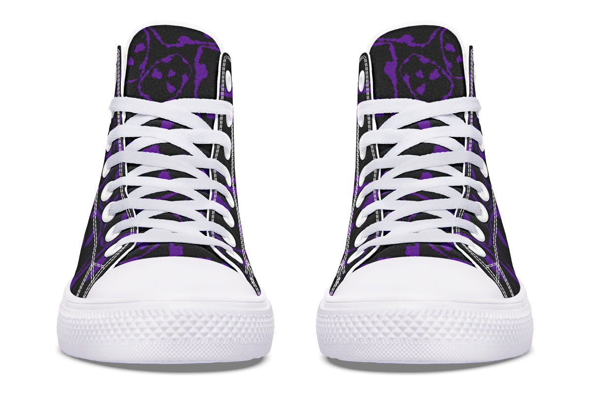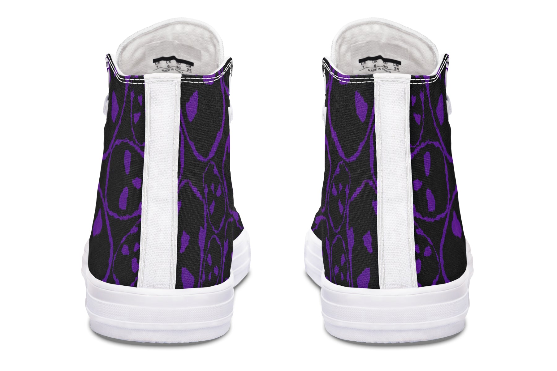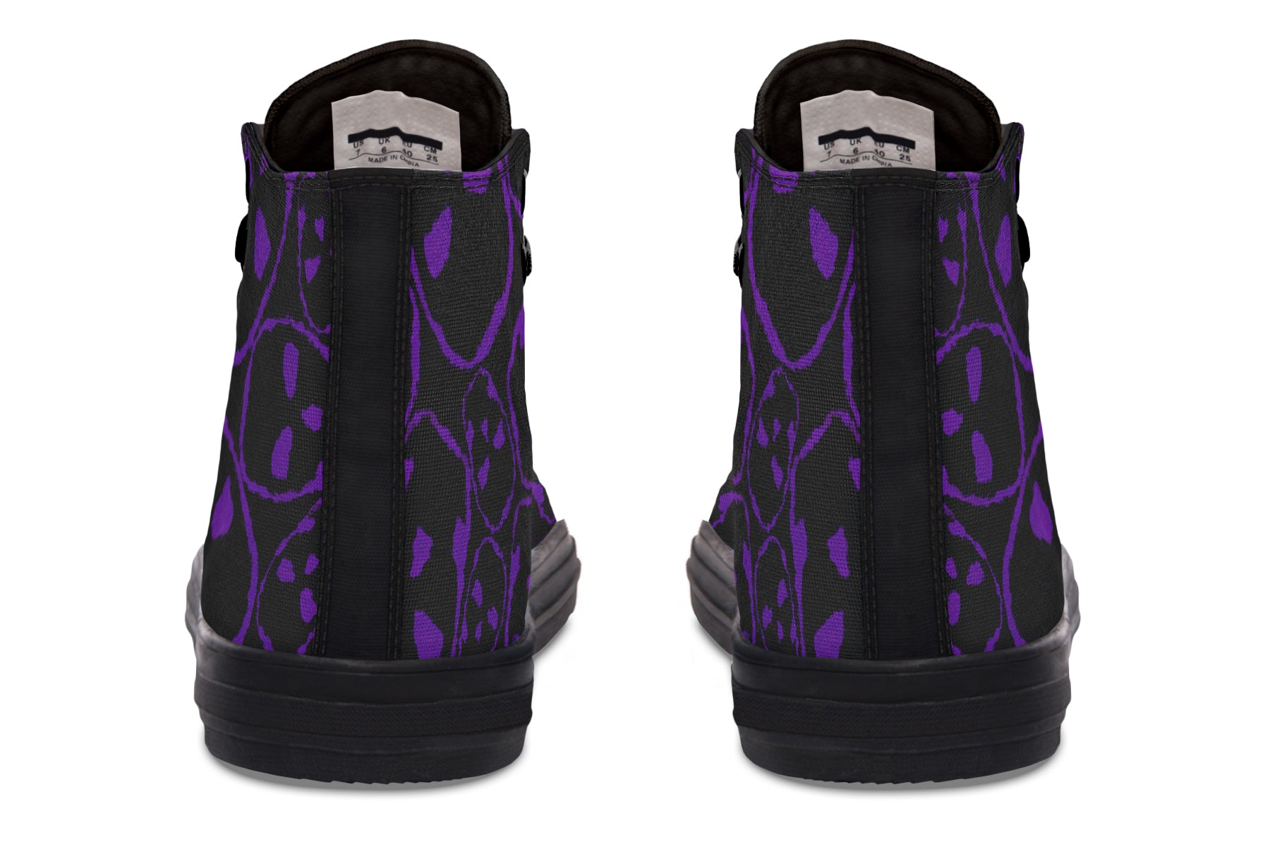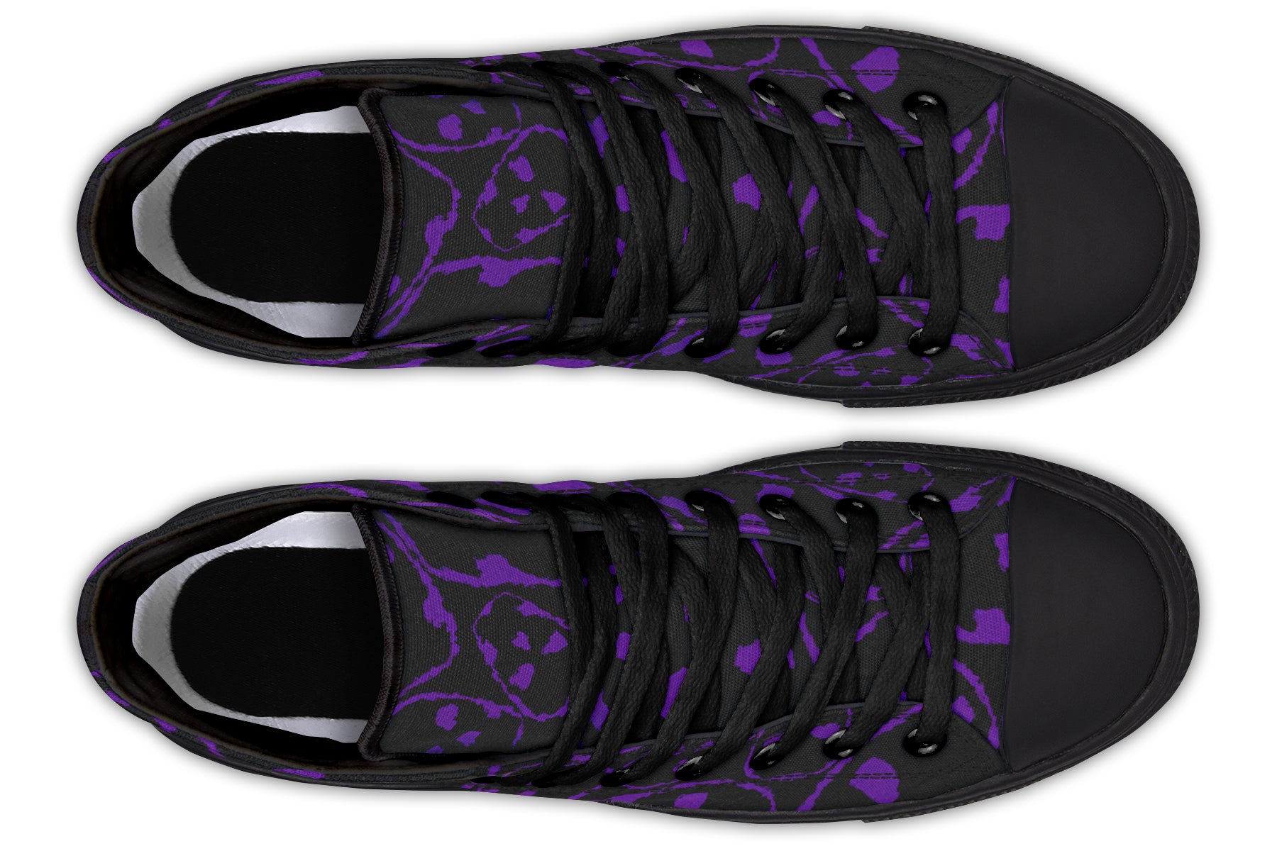 Add a bold twist to your gothic footwear with the ANTIBrand Tumbling Purple Skulls High Tops – Black. Showcasing an all-over skull design in vibrant purple against a black canvas base, these high tops make a striking statement for any alternative outfit. Built for both comfort and edge.
