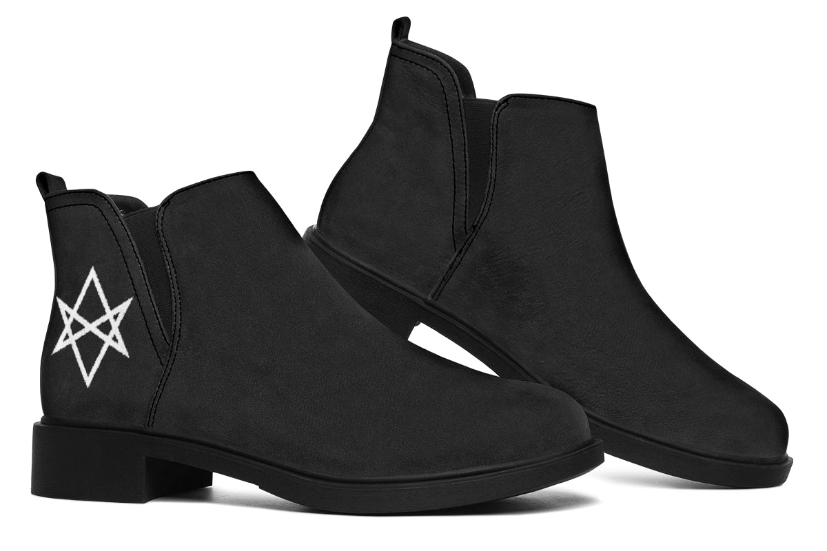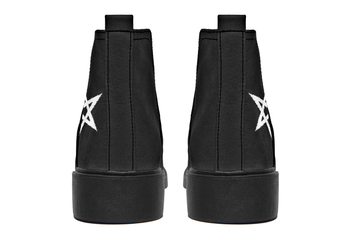 Step into mystical style with the ANTIBrand Unicursal Hexagram Protection Chelsea Boots. These sleek black boots are adorned with the iconic Unicursal Hexagram, a symbol of unity and spiritual strength. Designed to pair effortlessly with your goth and alternative wardrobe, they provide both durability and standout style.