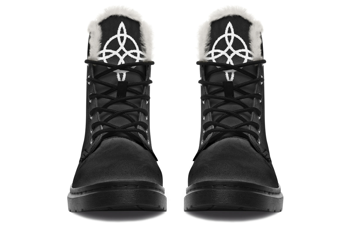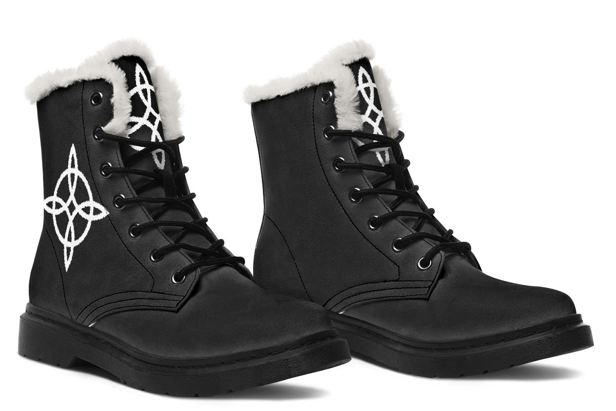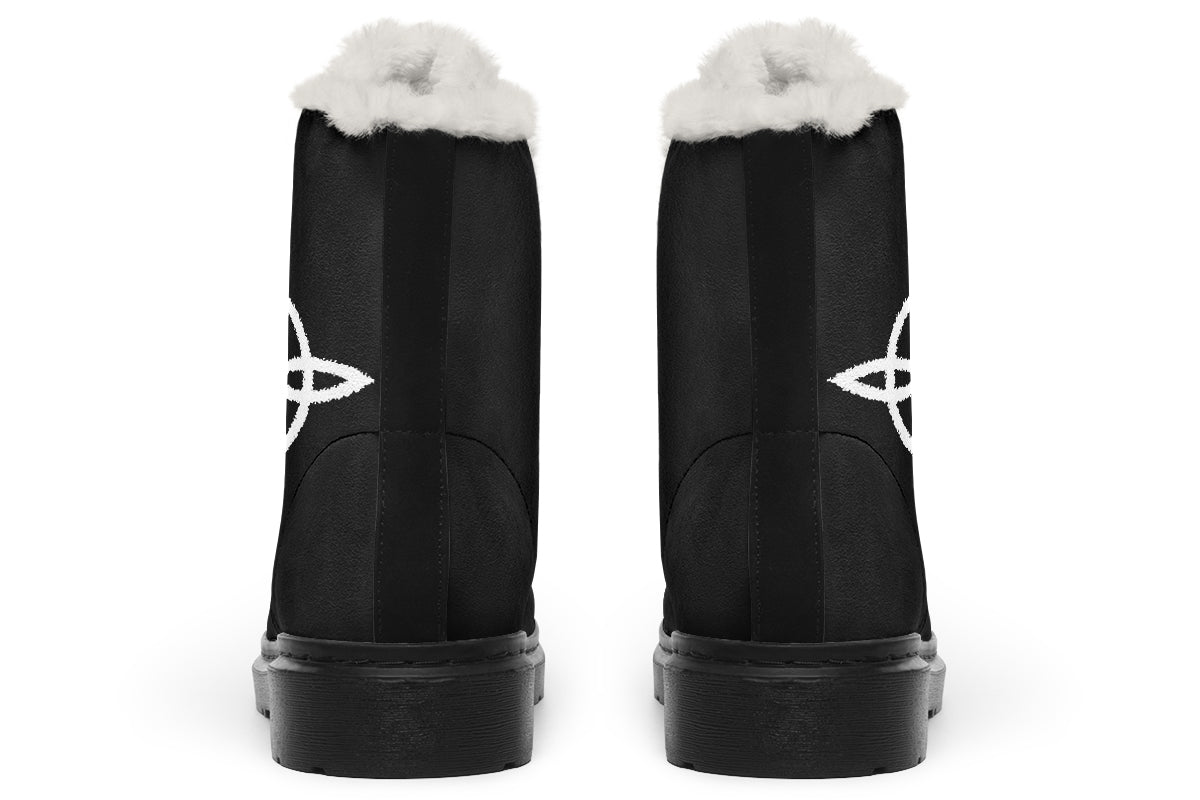 Channel protective energy with the ANTIBrand Witches Knot Protection Fleece Lined Boots – Black. Adorned with a bold white witches knot sigil on sleek black vegan leather, these boots blend gothic symbolism with cosy practicality. Fleece lining ensures warmth, while the sturdy black sole keeps them durable and wearable. Perfect for witches, goths, and alternative souls who love symbolic style.