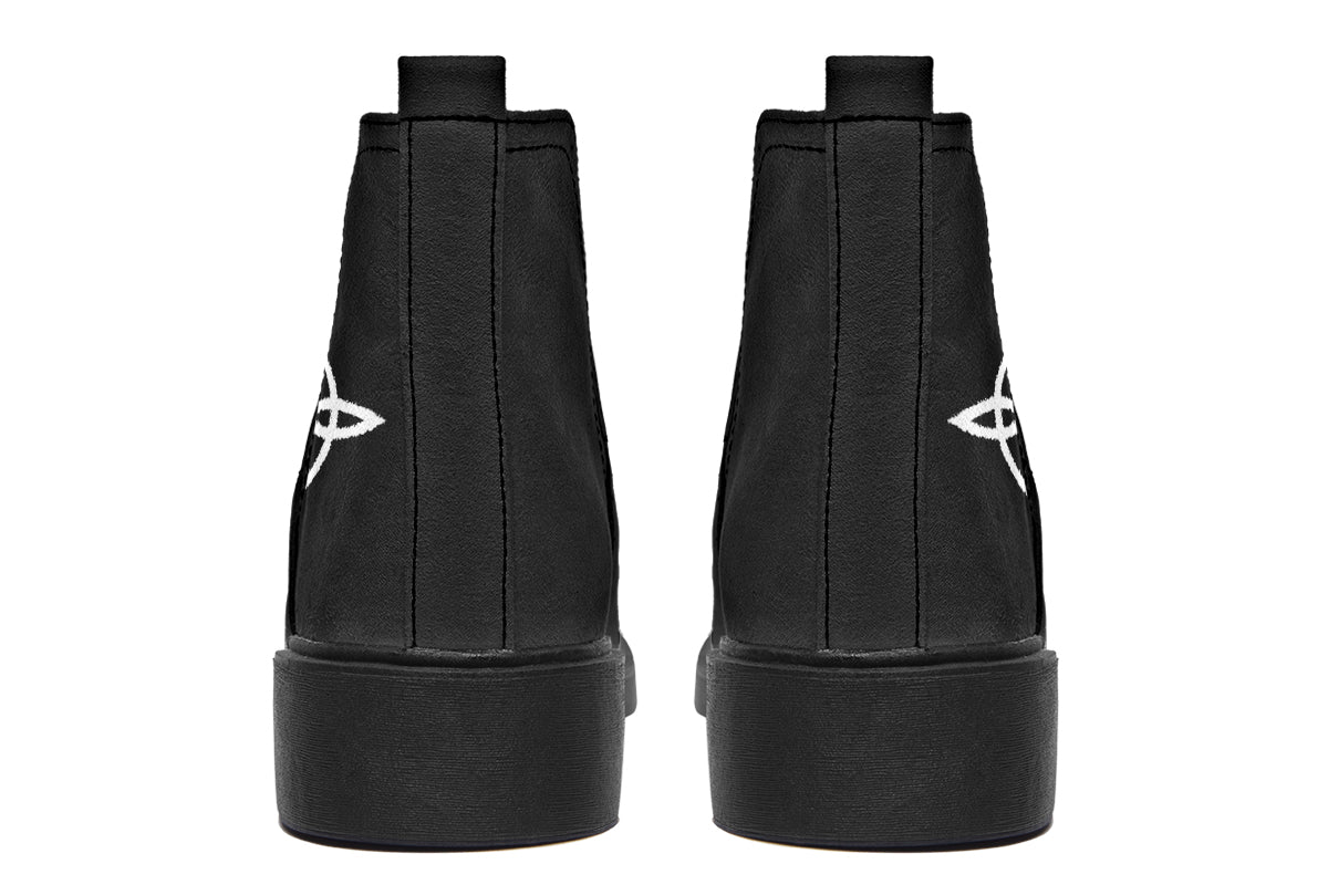 Walk with protection and power in the ANTIBRAND Witches Knot Protection Chelsea Boots. Featuring the symbolic white witches knot emblem on a sleek black canvas, these boots combine spiritual symbolism with wearable gothic style. Perfect for adding meaning and edge to your alternative wardrobe.