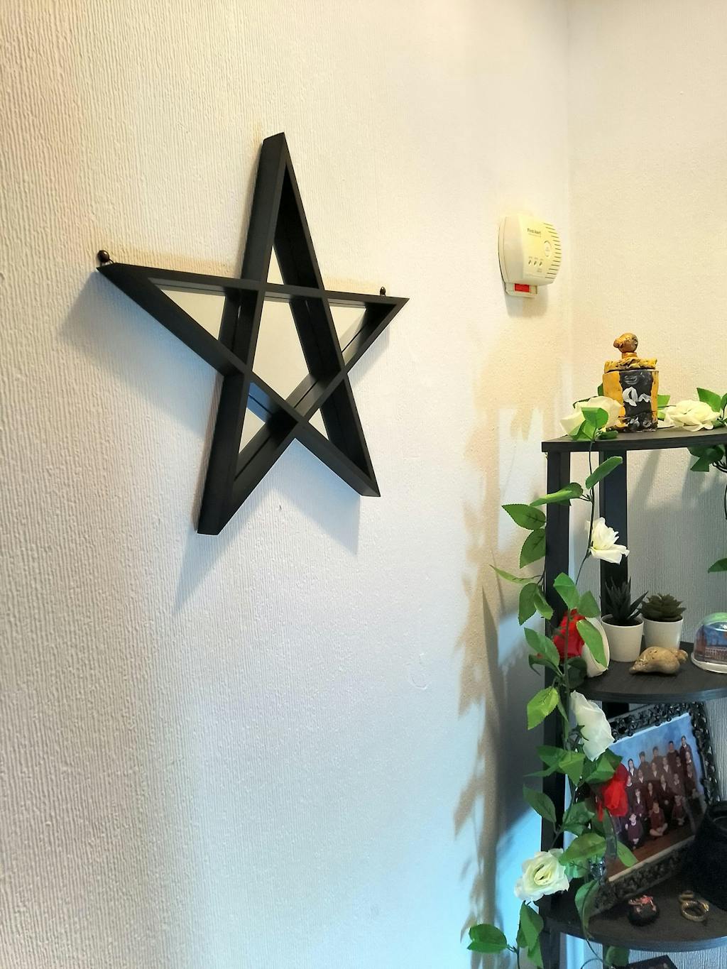 Stunning pentagram shaped mirror framed in black MDF with triangular hanging hooks attached. Measures 40cm x 40cm approximately.