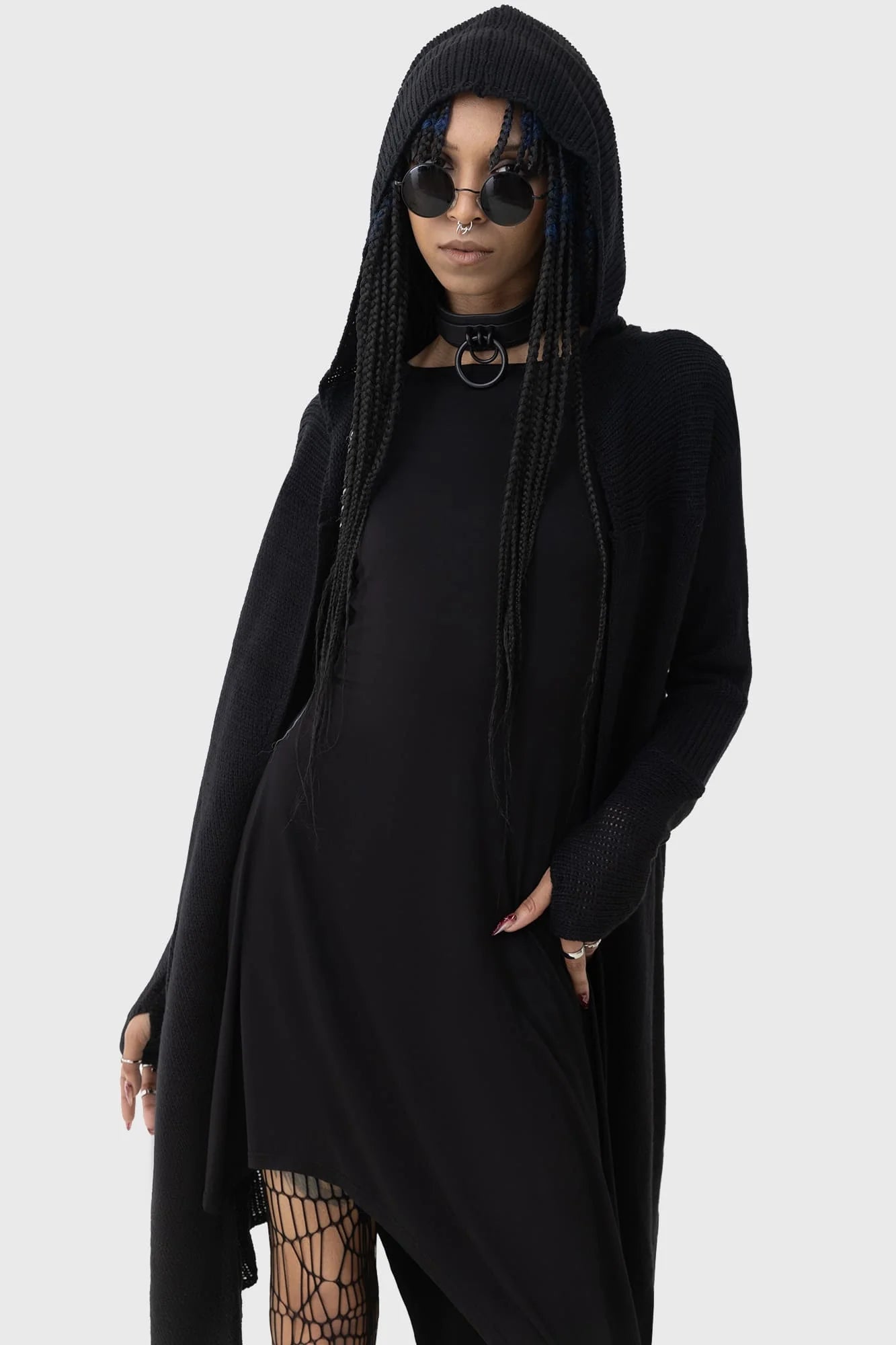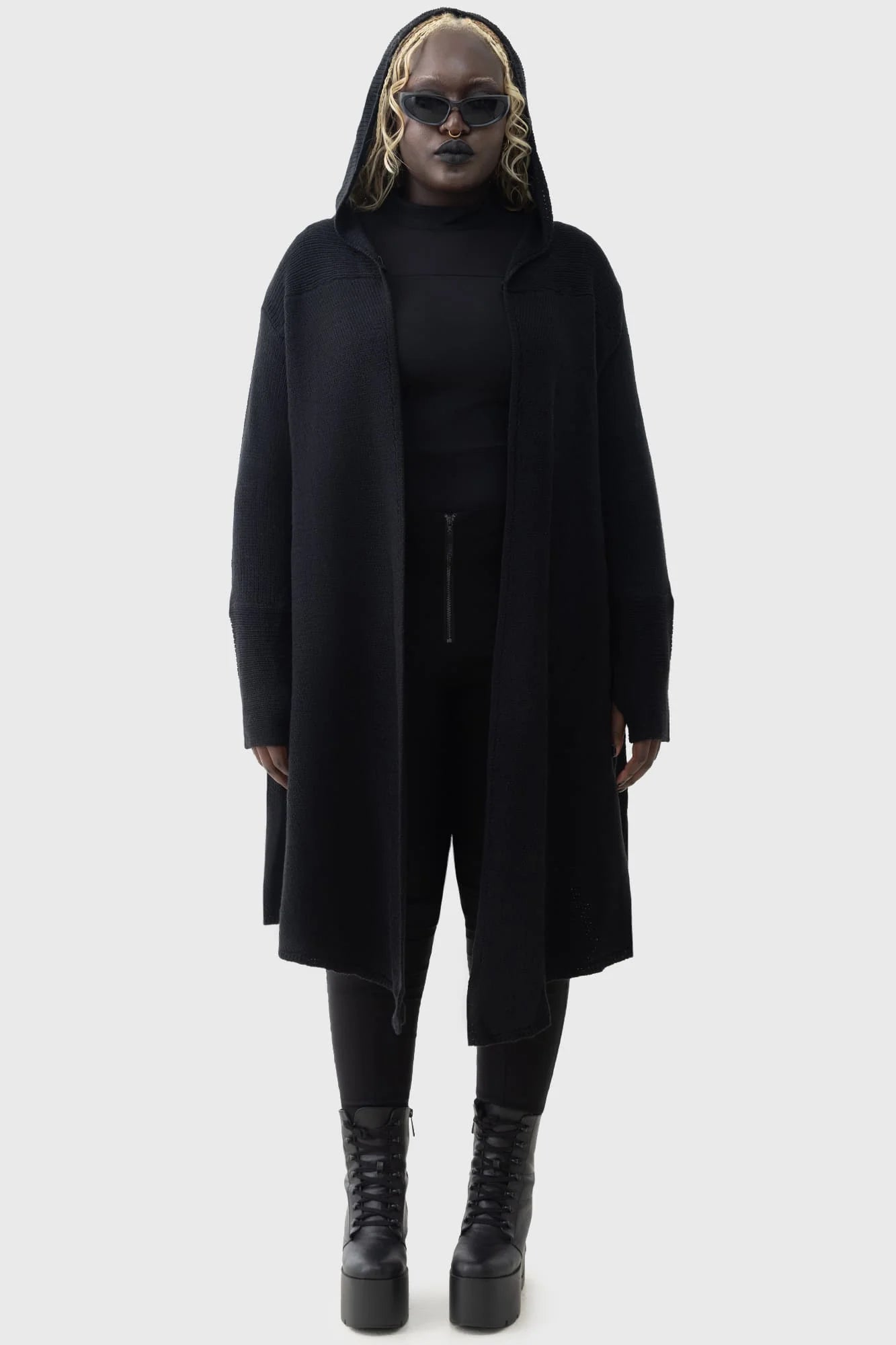 Wrap yourself in dark comfort with the Killstar Last Quarter Hooded Cardigan – a soft, lightweight knit layer designed for effortless gothic style. Featuring an oversized hood, long sleeves, and dramatic side dip hems, this relaxed-fit cardigan is perfect for layering over your favourite outfits, from casual daytime looks to night-time rituals.