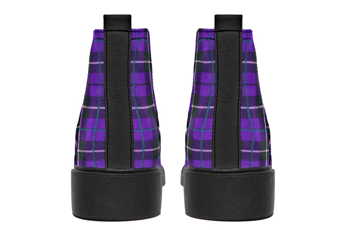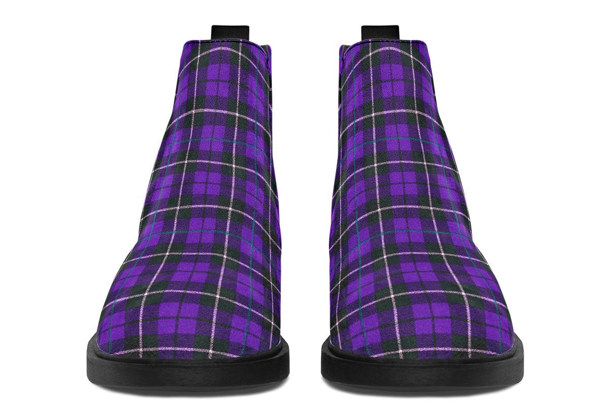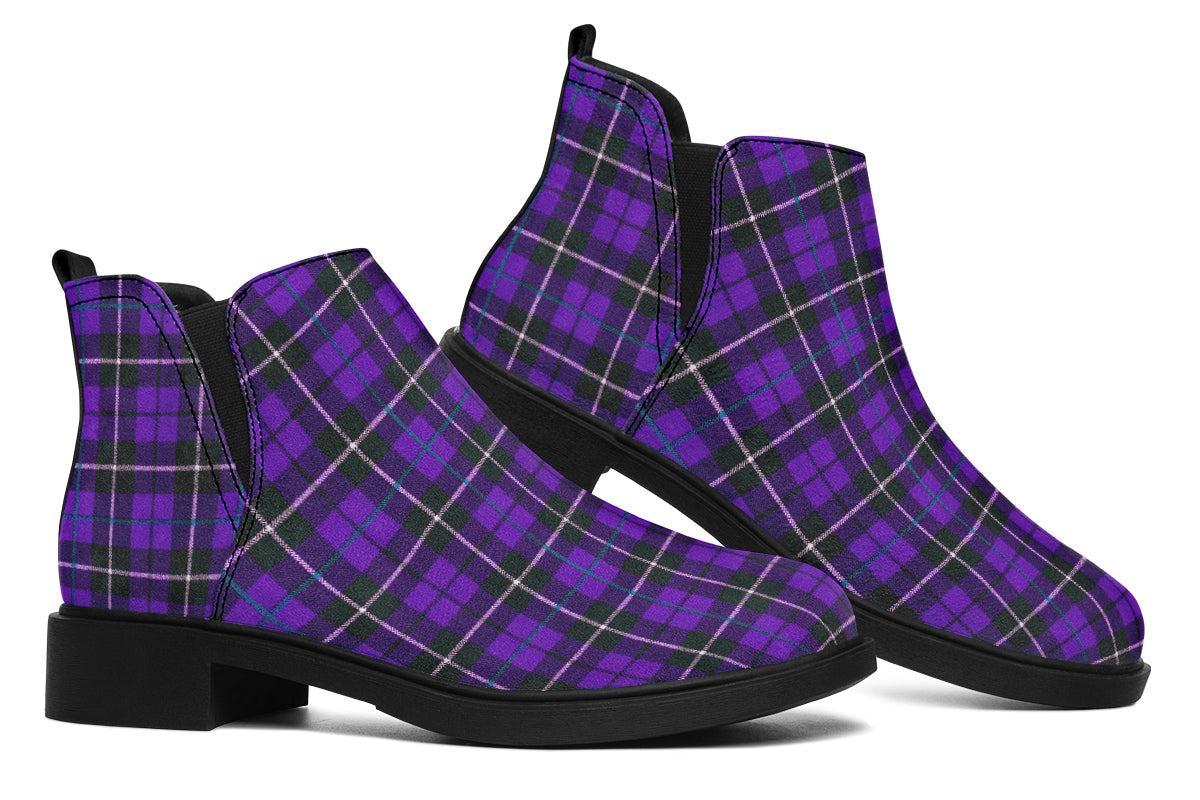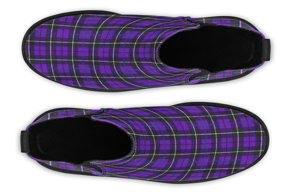 Channel punk attitude with the ANTIBrand Purple Tartan Chelsea Boots. The bold purple check pattern is a standout design perfect for alt and goth-inspired wardrobes. With a sleek Chelsea cut and durable construction, these boots combine rebellious style with lasting wearability. Pair with black layers or statement accessories for an authentic alternative finish.