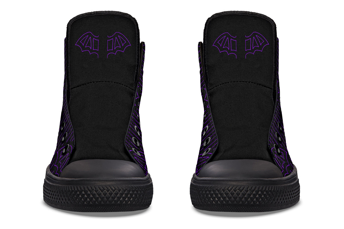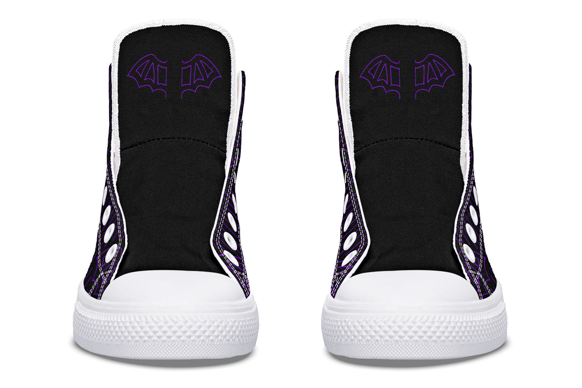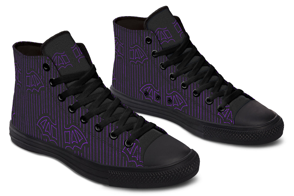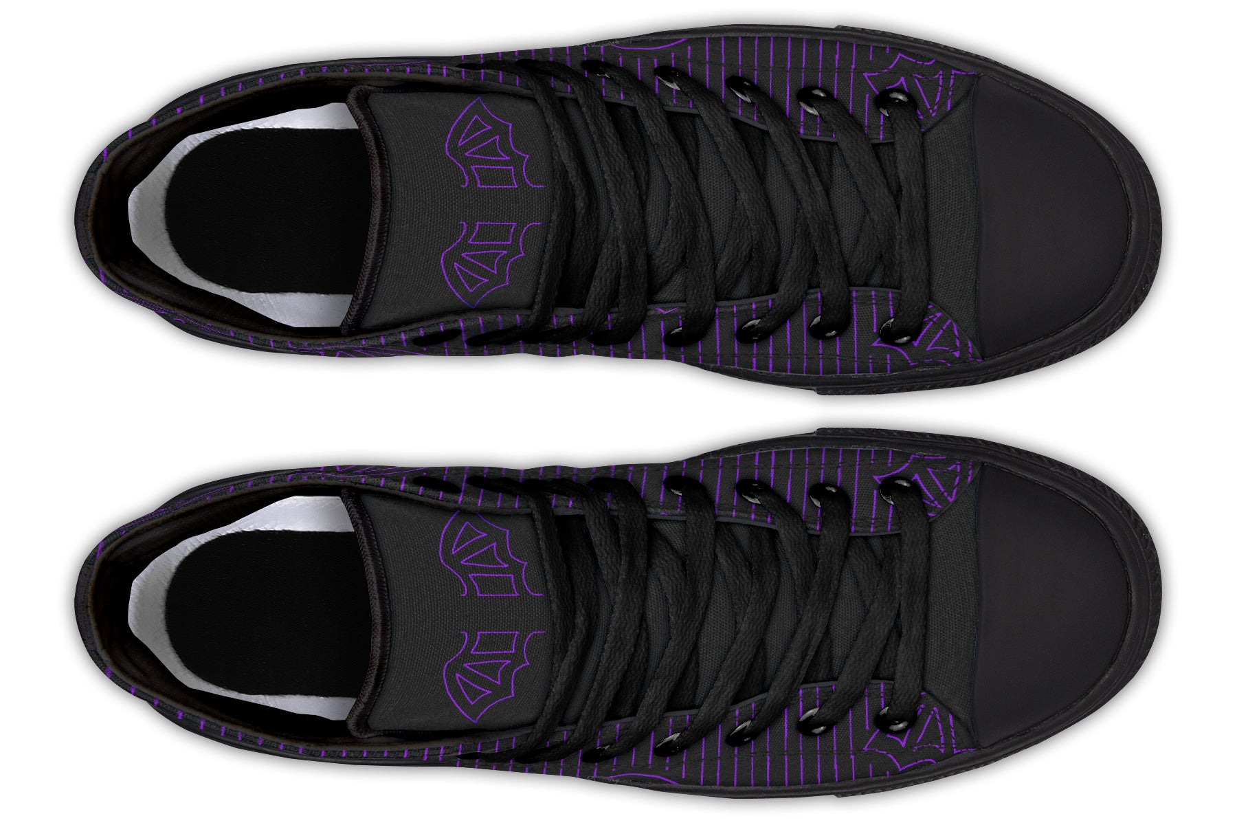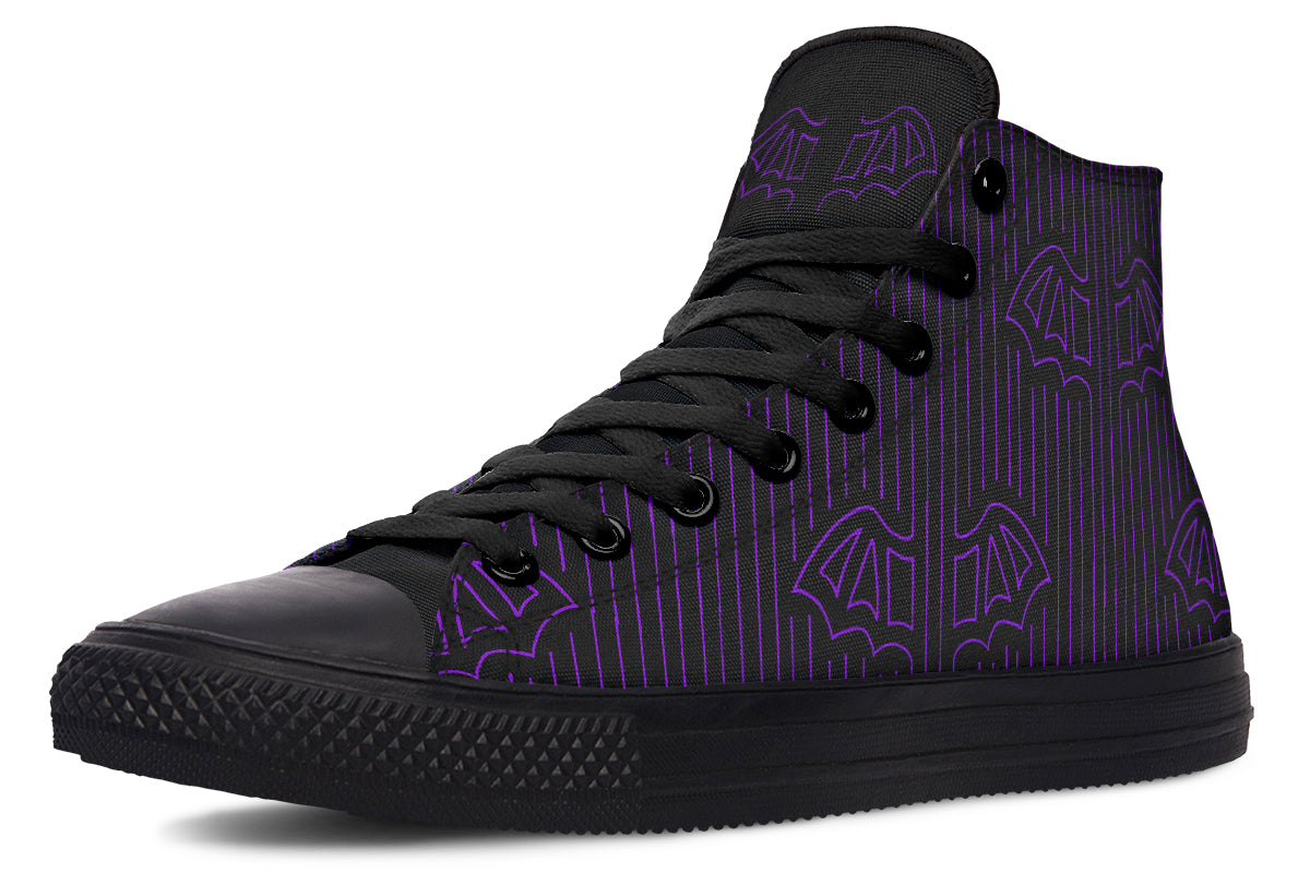 Elevate your everyday alt look with the ANTIBrand Nocturne Lines High Tops. Featuring a striking vertical pinstripe base and bold bat-inspired motifs, this pair channels pure goth streetwear energy. The all-black canvas is brought to life with subtle purple accents, making them versatile yet unapologetically alternative. Durable and lightweight, these trainers deliver comfort and attitude in one.