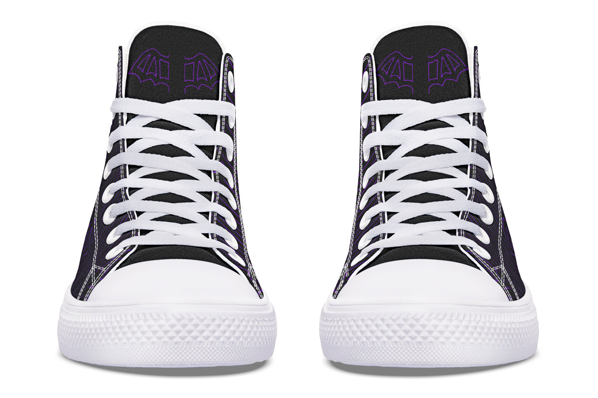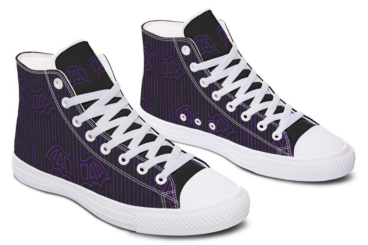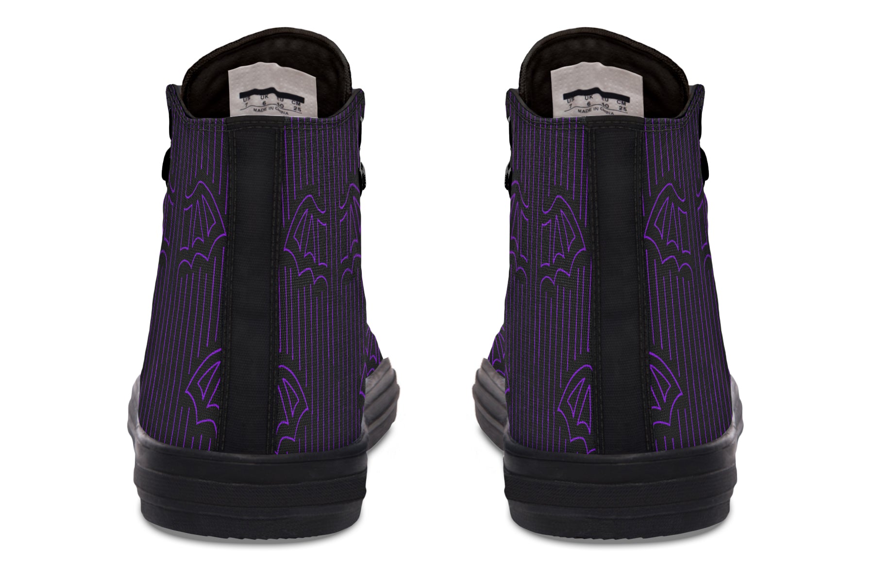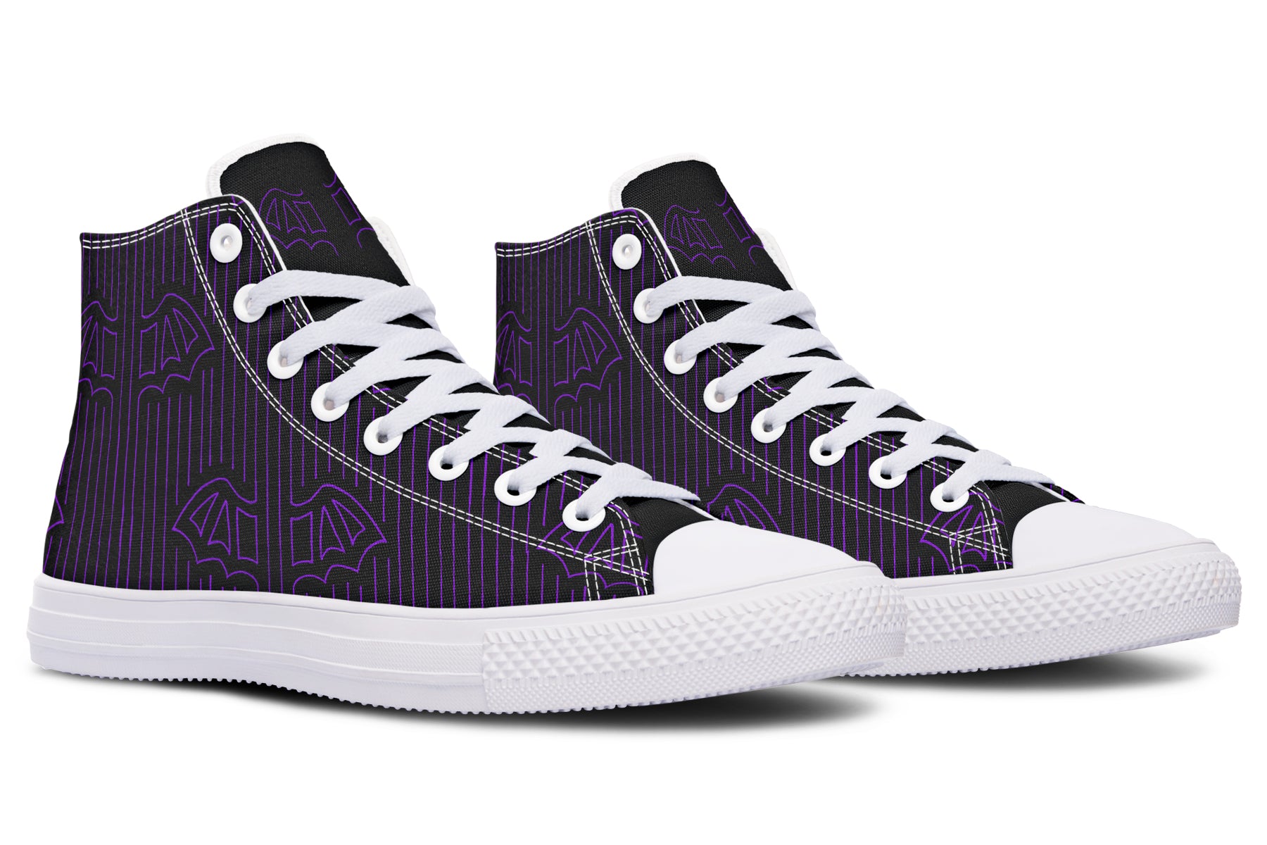 Elevate your everyday alt look with the ANTIBrand Nocturne Lines High Tops. Featuring a striking vertical pinstripe base and bold bat-inspired motifs, this pair channels pure goth streetwear energy. The all-black canvas is brought to life with subtle purple accents, making them versatile yet unapologetically alternative. Durable and lightweight, these trainers deliver comfort and attitude in one.