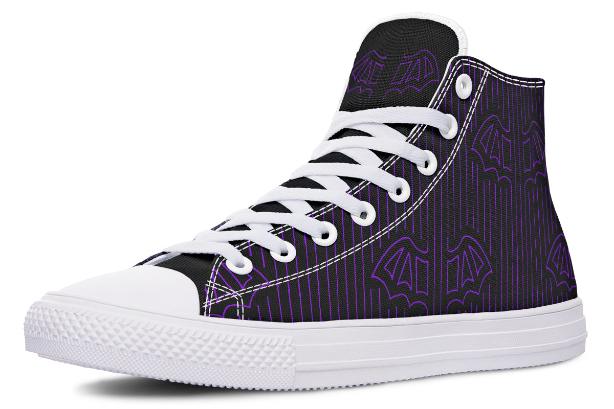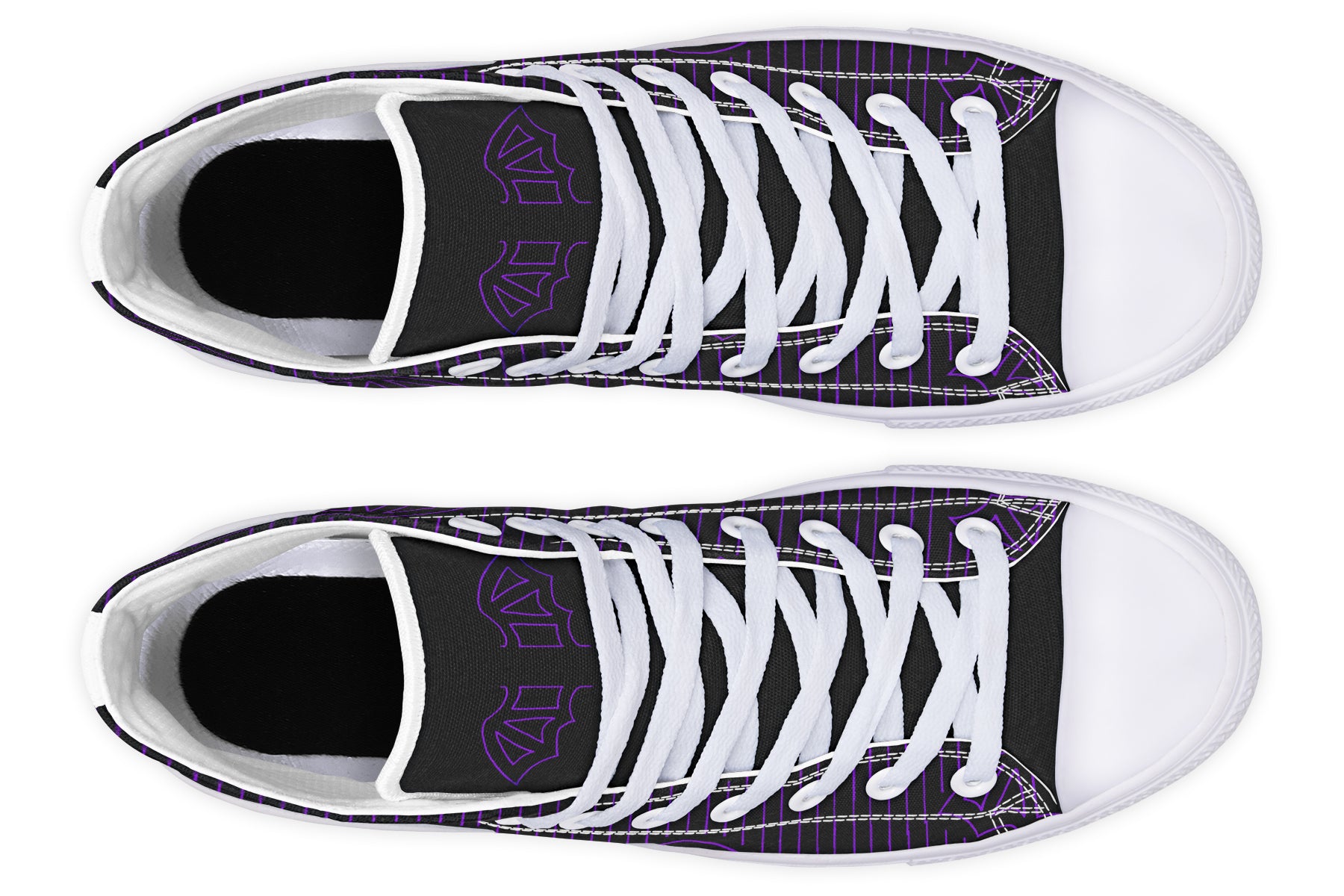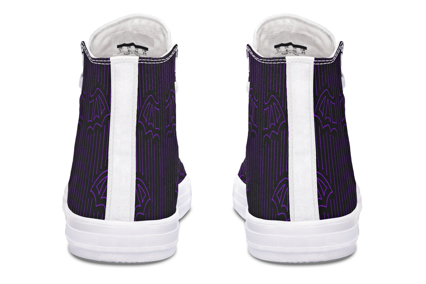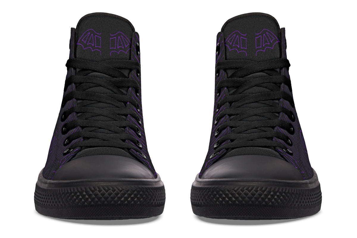 Elevate your everyday alt look with the ANTIBrand Nocturne Lines High Tops. Featuring a striking vertical pinstripe base and bold bat-inspired motifs, this pair channels pure goth streetwear energy. The all-black canvas is brought to life with subtle purple accents, making them versatile yet unapologetically alternative. Durable and lightweight, these trainers deliver comfort and attitude in one.