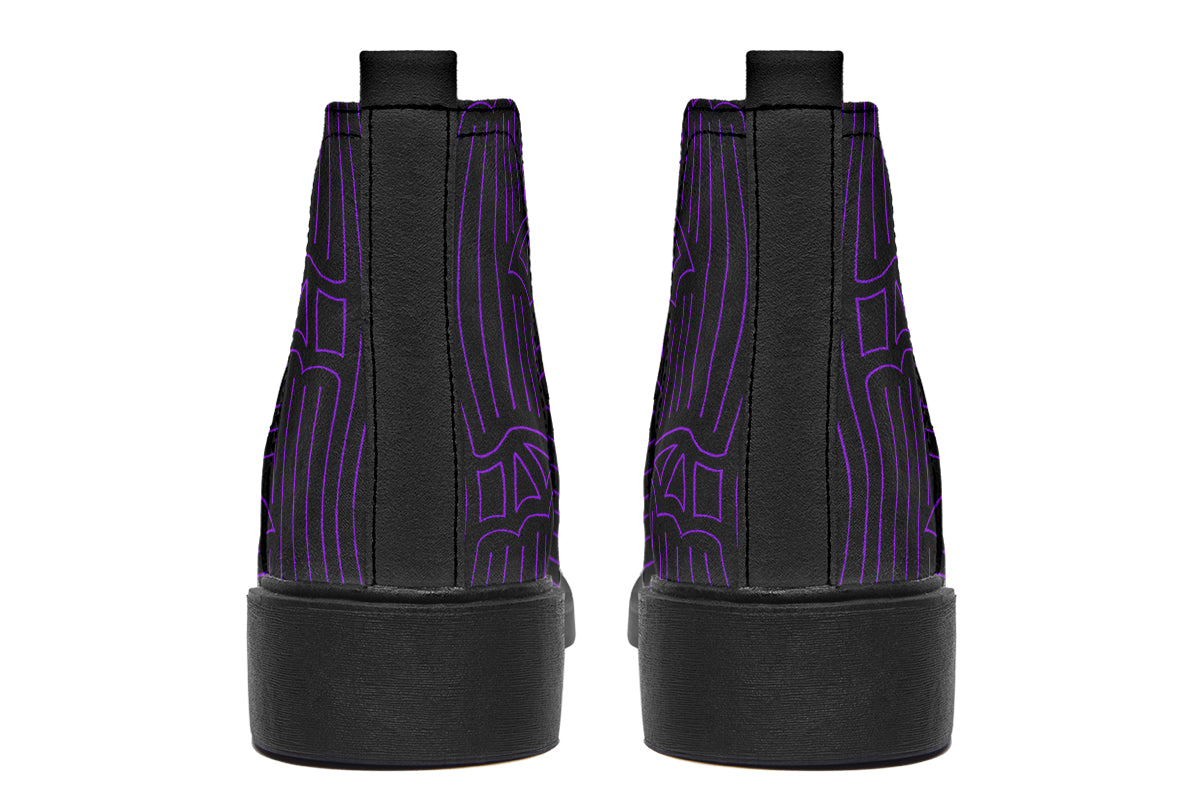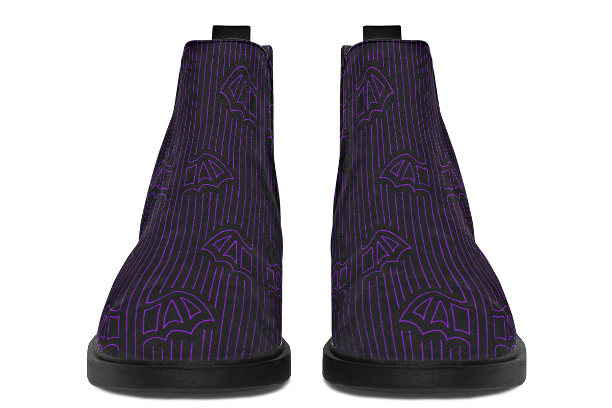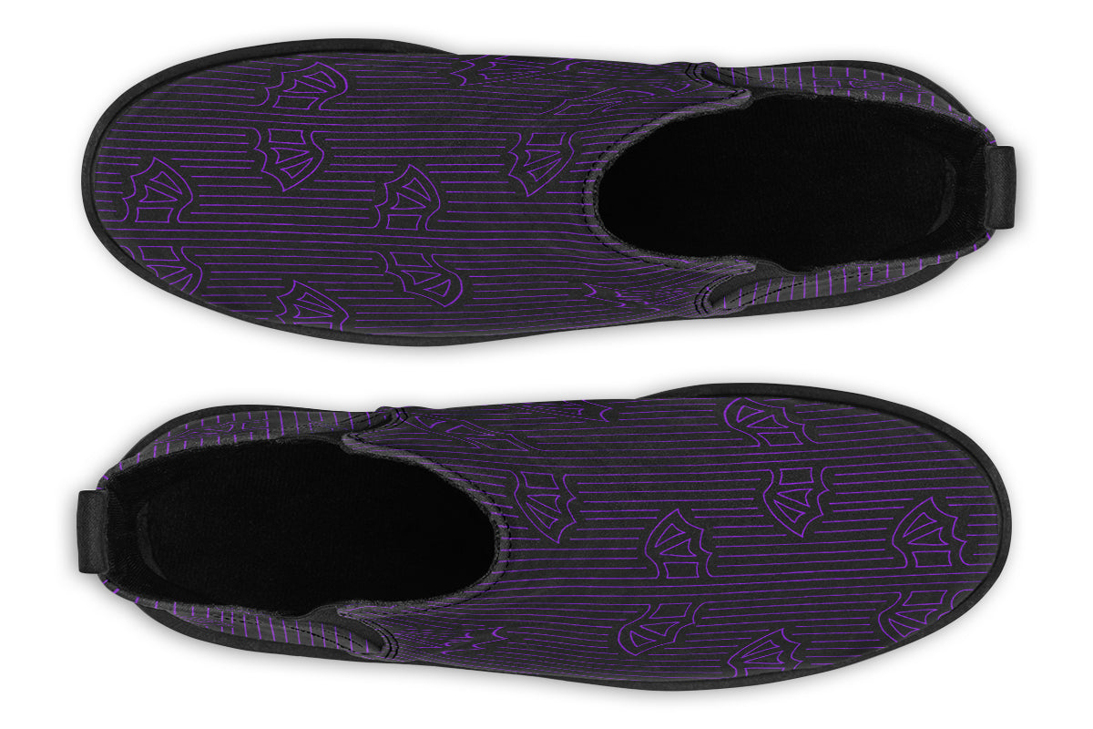 Strike a balance between minimalism and goth aesthetic with the ANTIBRAND Nocturne Lines Chelsea Boots. Featuring a bold black-and-white linear batwing-inspired pattern, they’re perfect for those who want standout footwear with clean, alternative styling.