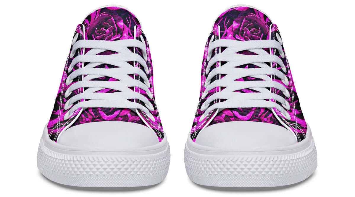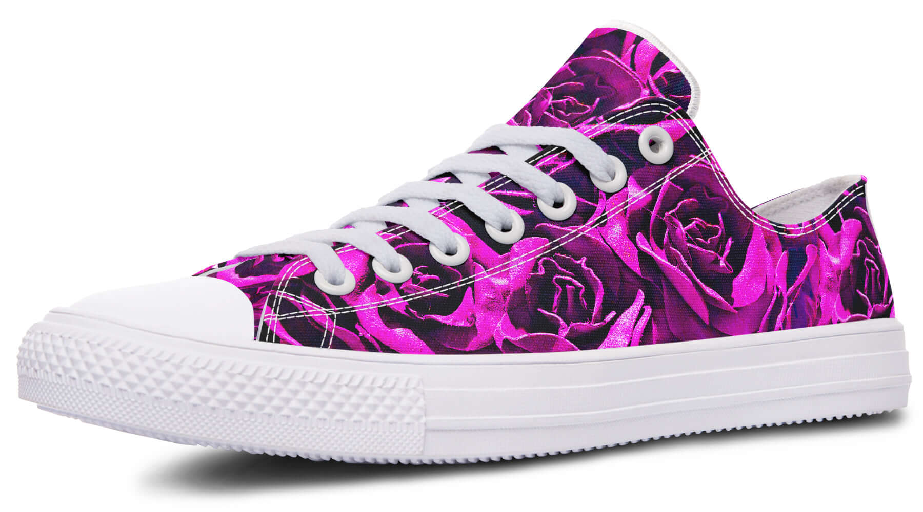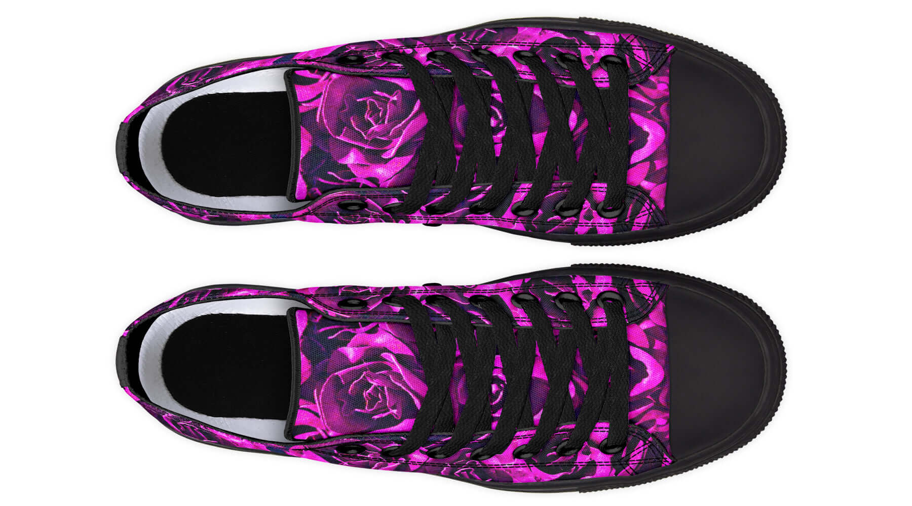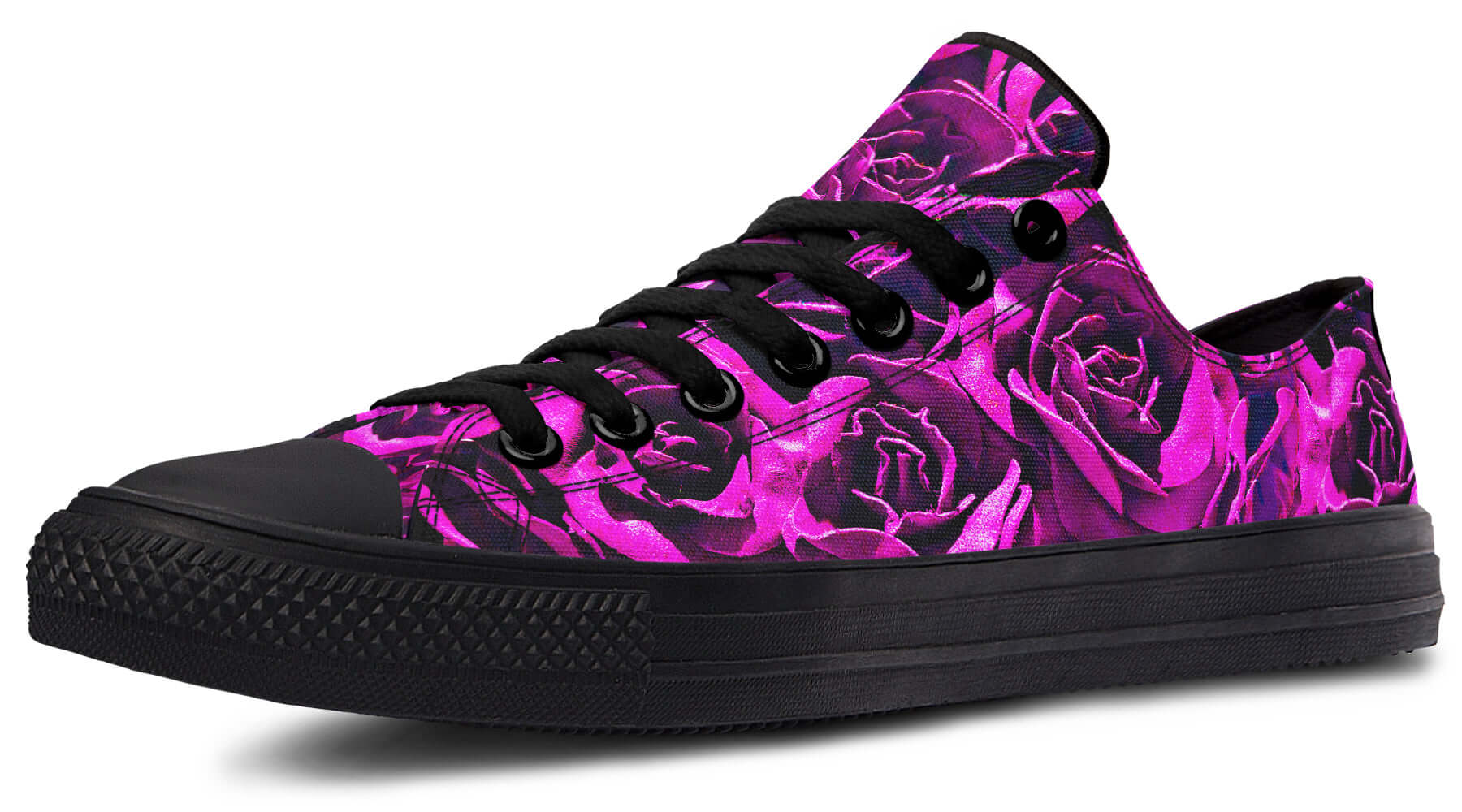 Step out with confidence in the Pink Roses Low Tops, where dark romance meets everyday comfort. These gothic canvas trainers are drenched in vibrant pink rose blooms over a stark black base—ideal for adding floral drama to your look.
