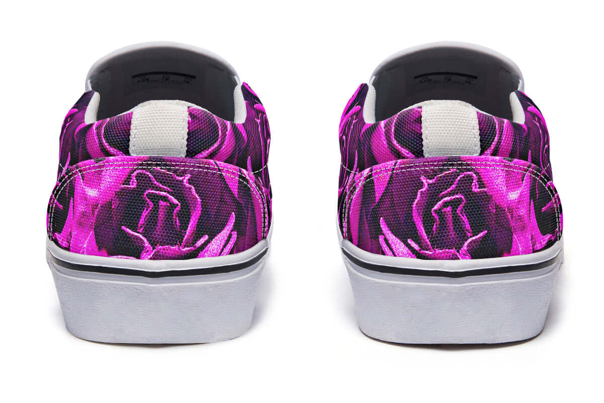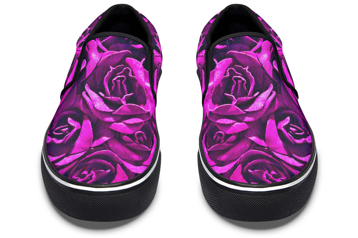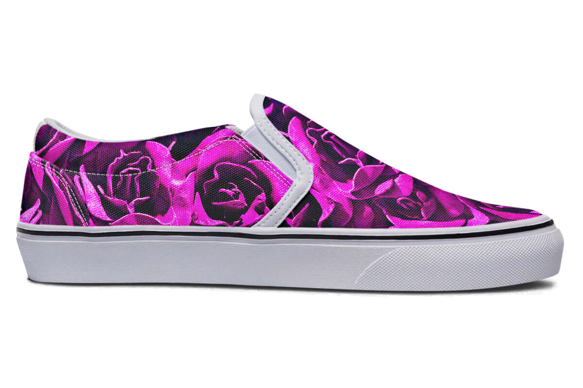 Step into bold blooms with the Pink Roses Canvas Slip-On Trainers by ANTIBrand. These striking slip-ons feature a vivid magenta rose design over a rich black background—perfect for lovers of floral goth vibes and effortless style.