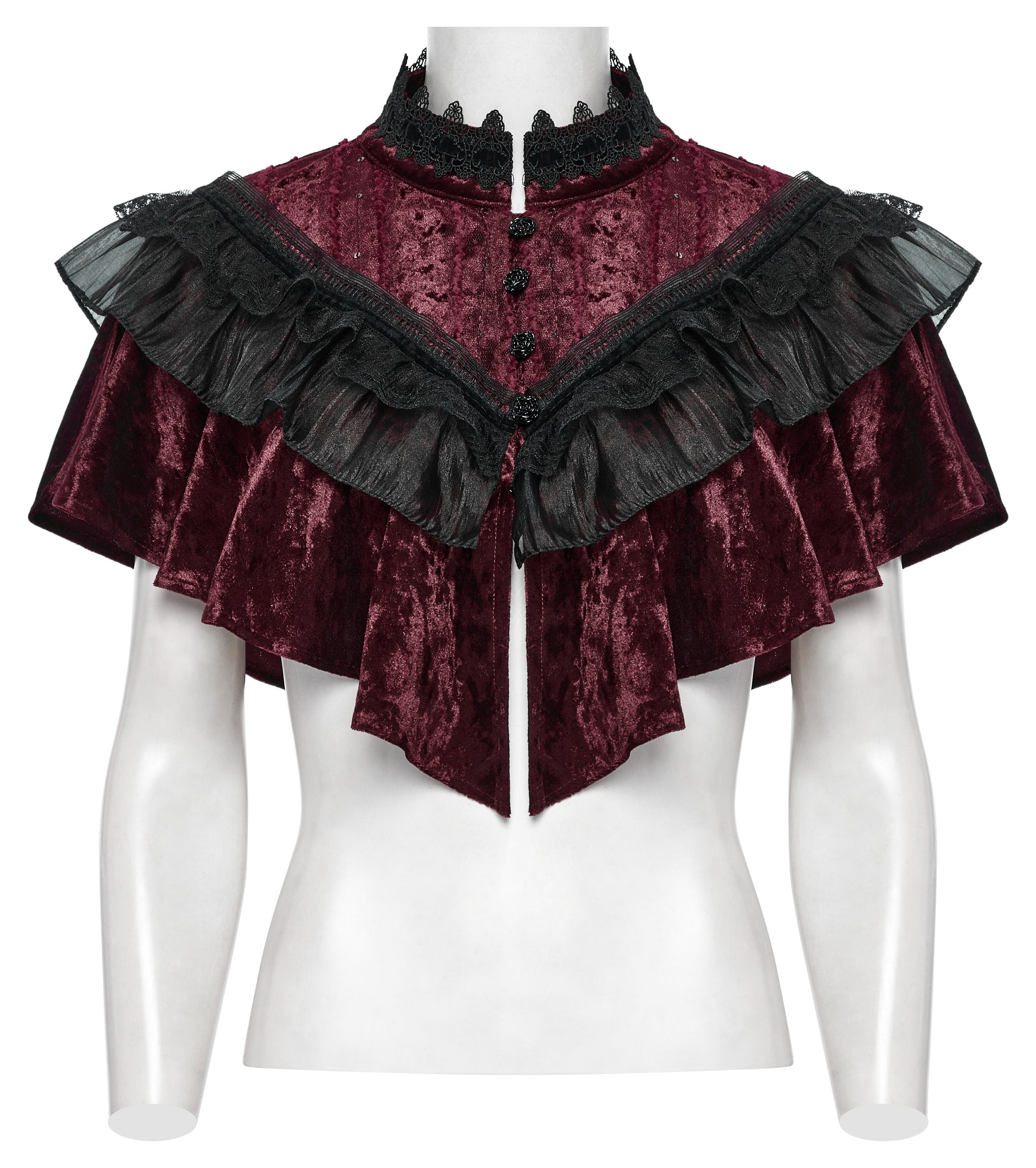 Add a regal finishing touch to your outfit with the Punk Rave Elysia Velvet Ruffle Goth Shawl – Crimson. Crafted from soft, elastic velvet in a rich crimson hue, this dramatic shawl features a layered ruffle trim in contrasting black for a striking gothic aesthetic. The high collar is adorned with delicate lace edging, while the front showcases ornate rose-shaped buckles for a vintage touch. Perfect for layering over dresses, tops, or corsets to elevate your alternative look.