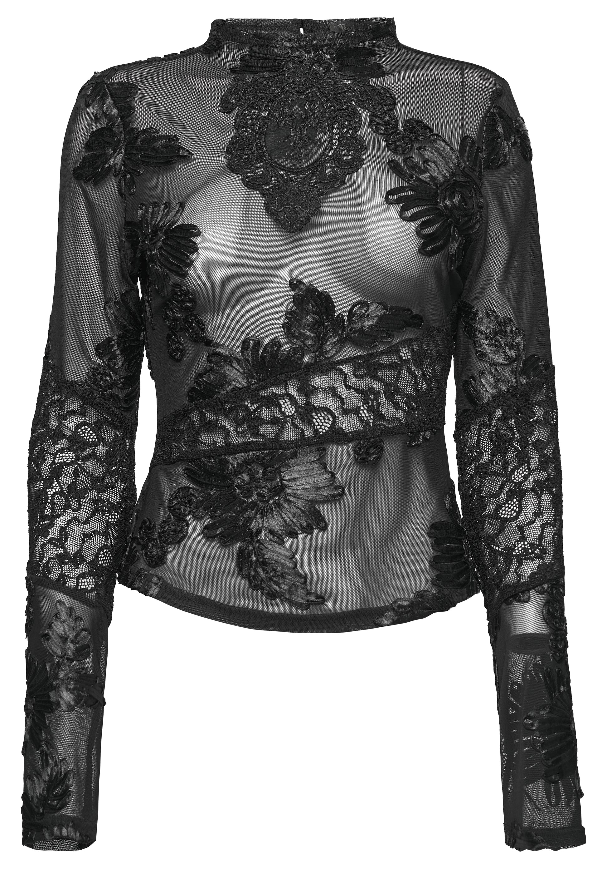 Sheer drama meets delicate decadence in the Punk Rave Goth Lace Undershirt. Crafted from soft, stretchy mesh and adorned with elaborate floral embroidery, this high-neck black undershirt is a daring, elegant layering piece. Wear it under corsets or pair it with a sleek bralette for a look that blends Gothic romance with bold sensuality.