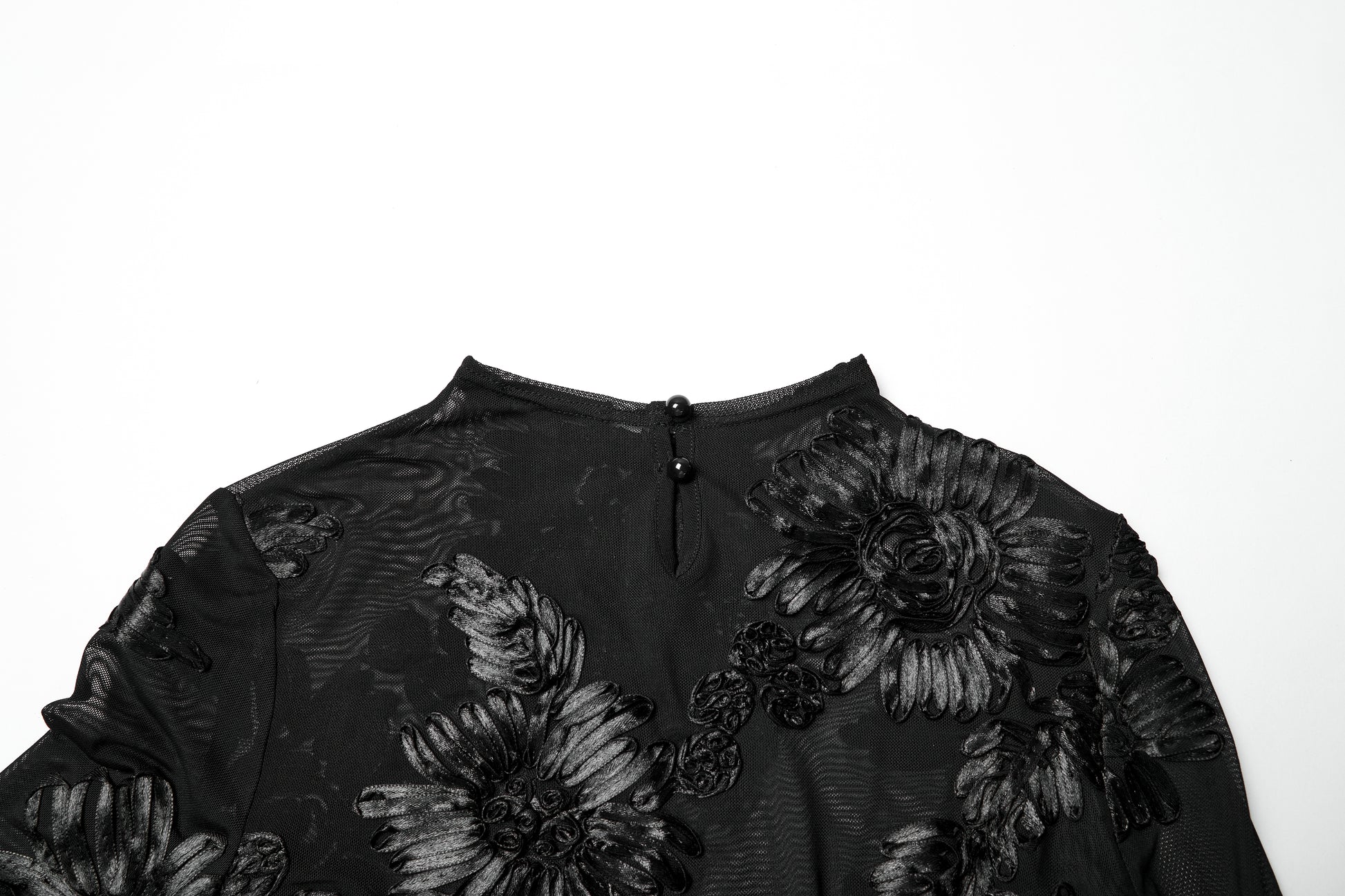 Transparent black mesh with intricate floral lace appliqué