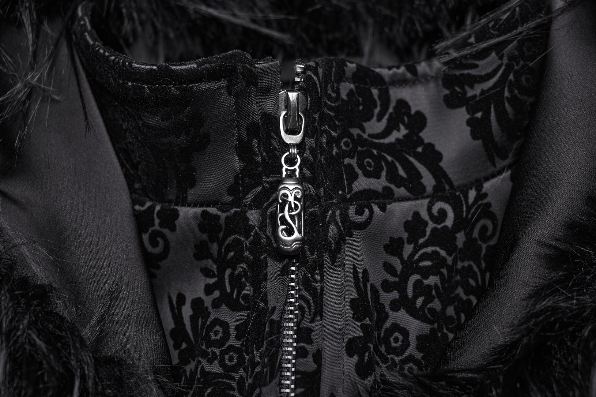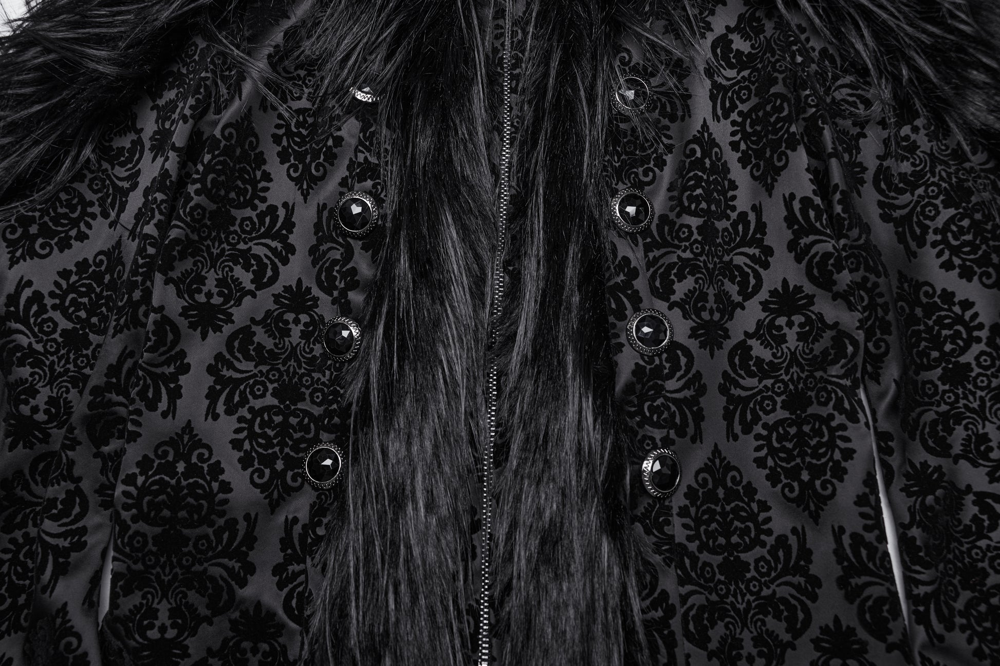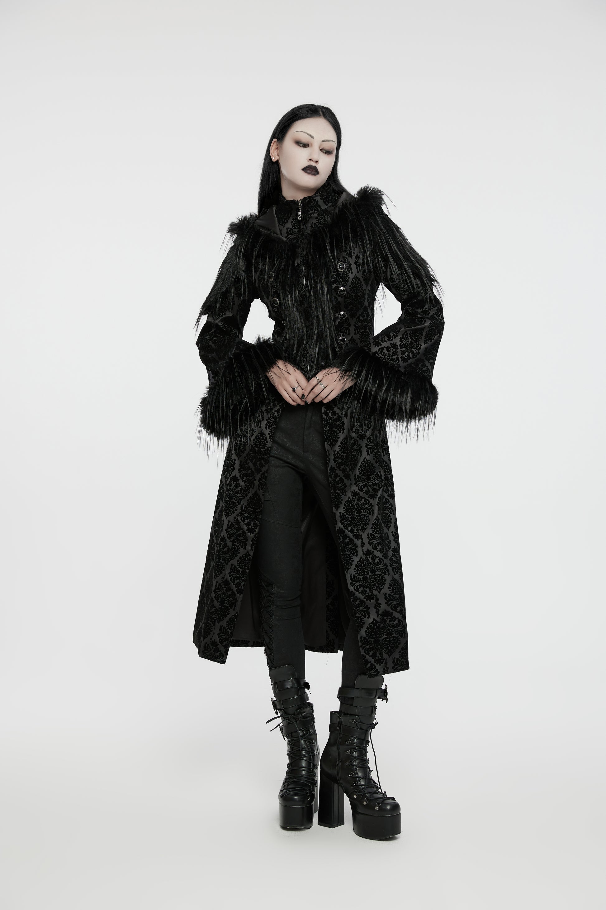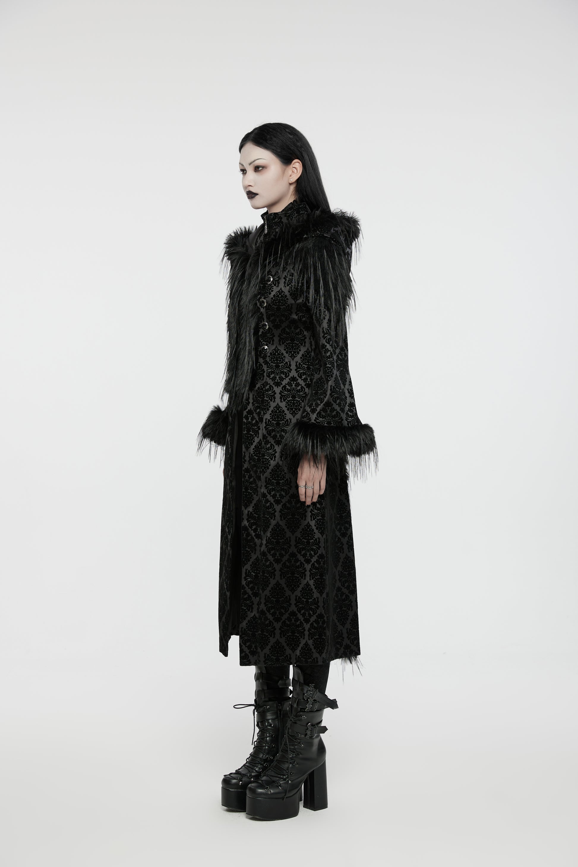 This luxurious black longline coat features intricate gothic jacquard patterning paired with a plush faux fur trim across the shoulders and cuffs. Sculpted to flatter, the coat has a fitted silhouette and a dramatic hood to complete the darkly regal look. Statement metal button fastenings and delicate velvet texture make it the perfect piece for those who want warmth without sacrificing witchy drama.