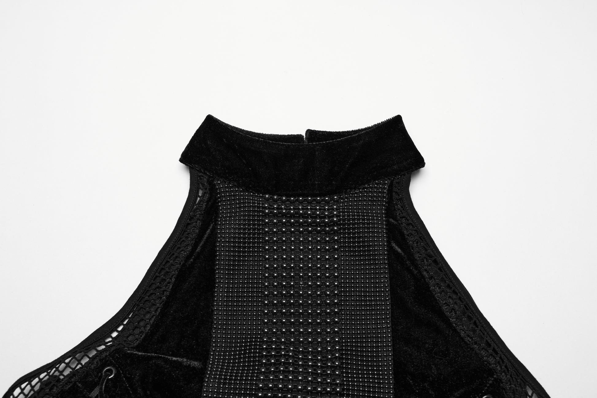 Turn heads at any dark soirée with the Punk Rave Selene Velvet Mesh High Slit Goth Dress – Black. This striking gown is crafted from high-quality elastic velvet and sheer mesh for a luxurious yet daring effect. The halter neck design creates a sleek, minimalist silhouette, while the front showcases intricate bead decorations for an eye-catching focal point. A sheer mesh centre panel and daring thigh-high slit bring a seductive edge, while the corset-style lace-up back ensures a perfect fit. Perfect for gothic glamour, alternative events, and dramatic evening wear.