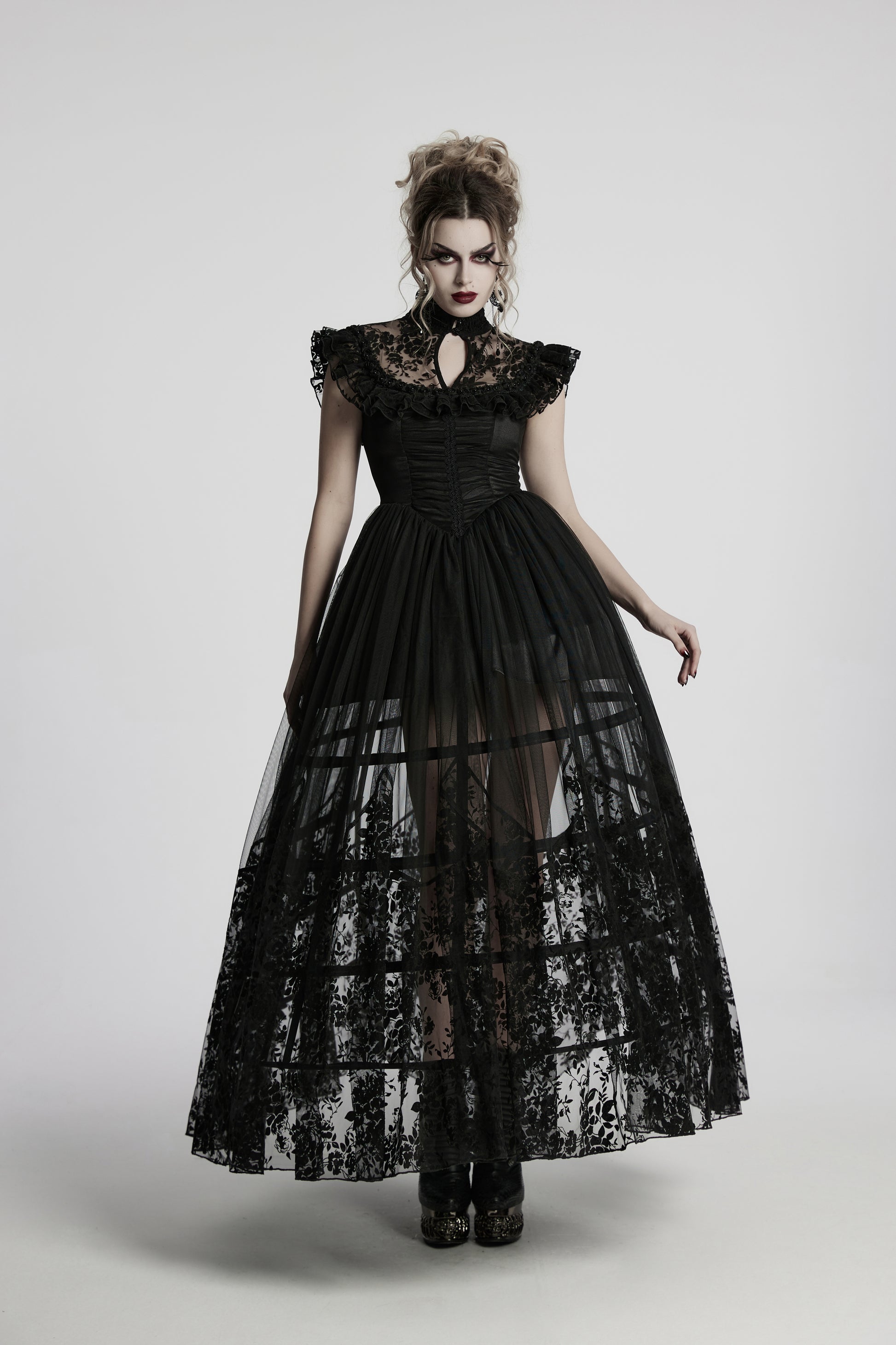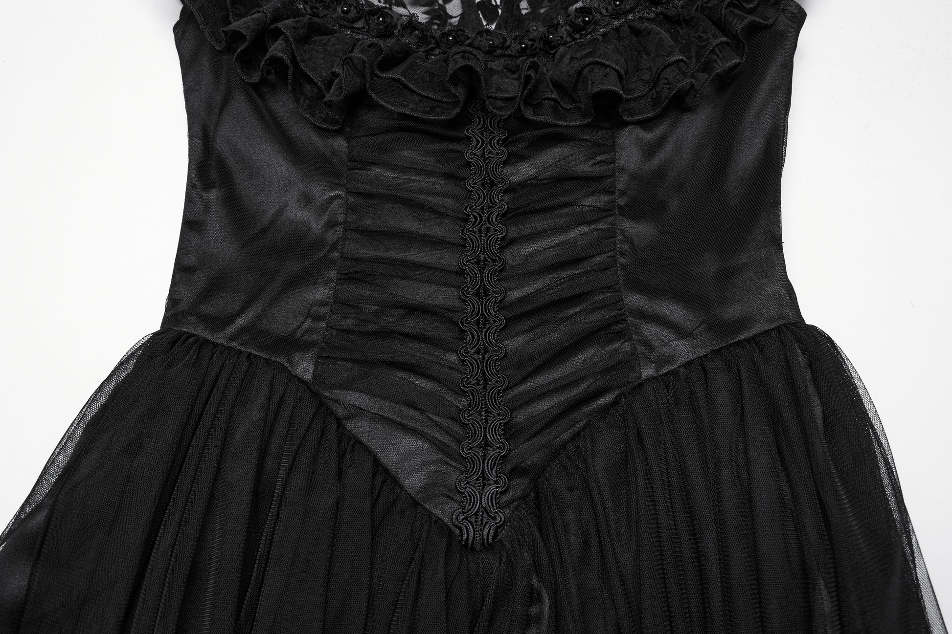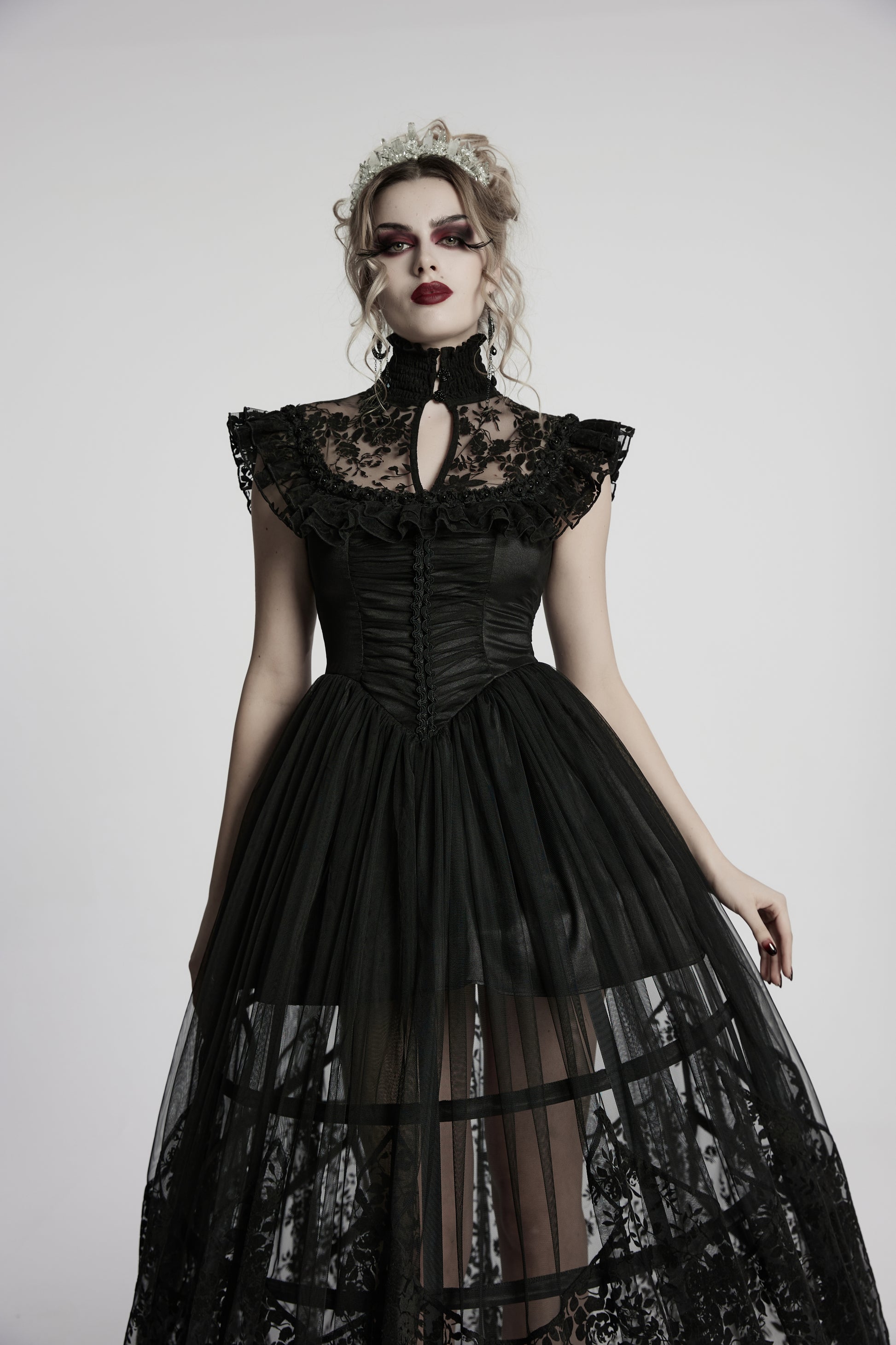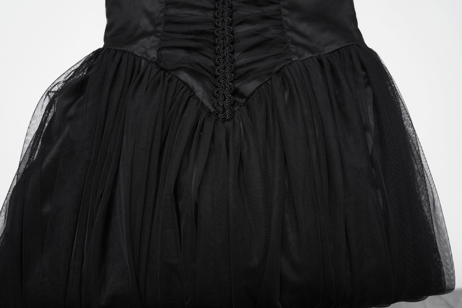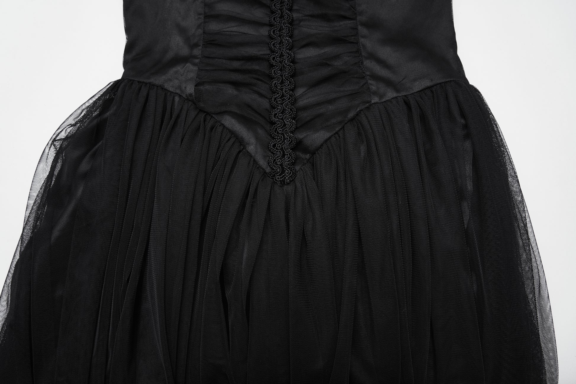 The flowing mesh skirt enhances movement and drama, making it perfect for gothic soirées, alternative fashion events, or any moment you want to embody mysterious grace. This statement dress invites you to own the night with confidence and poise.