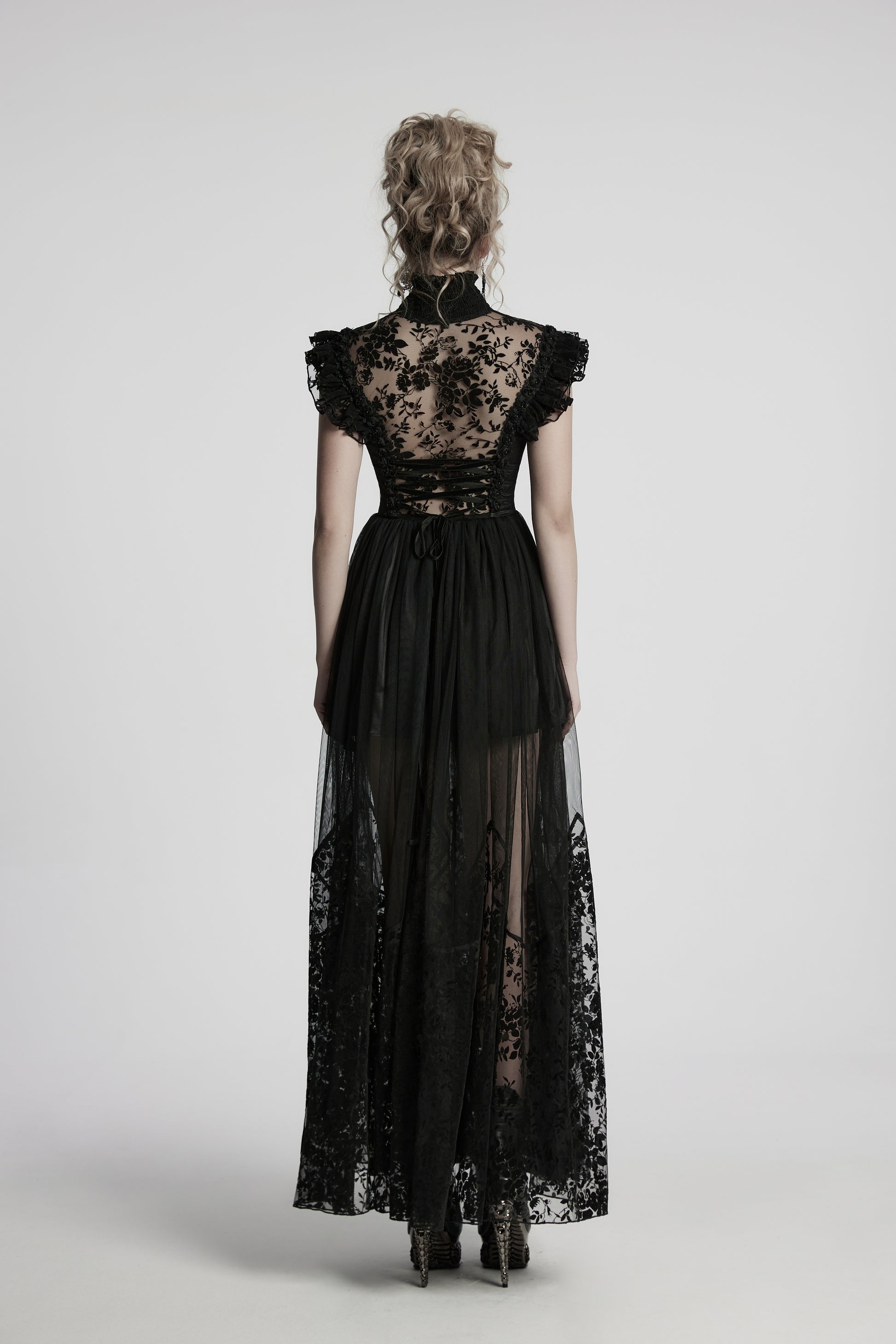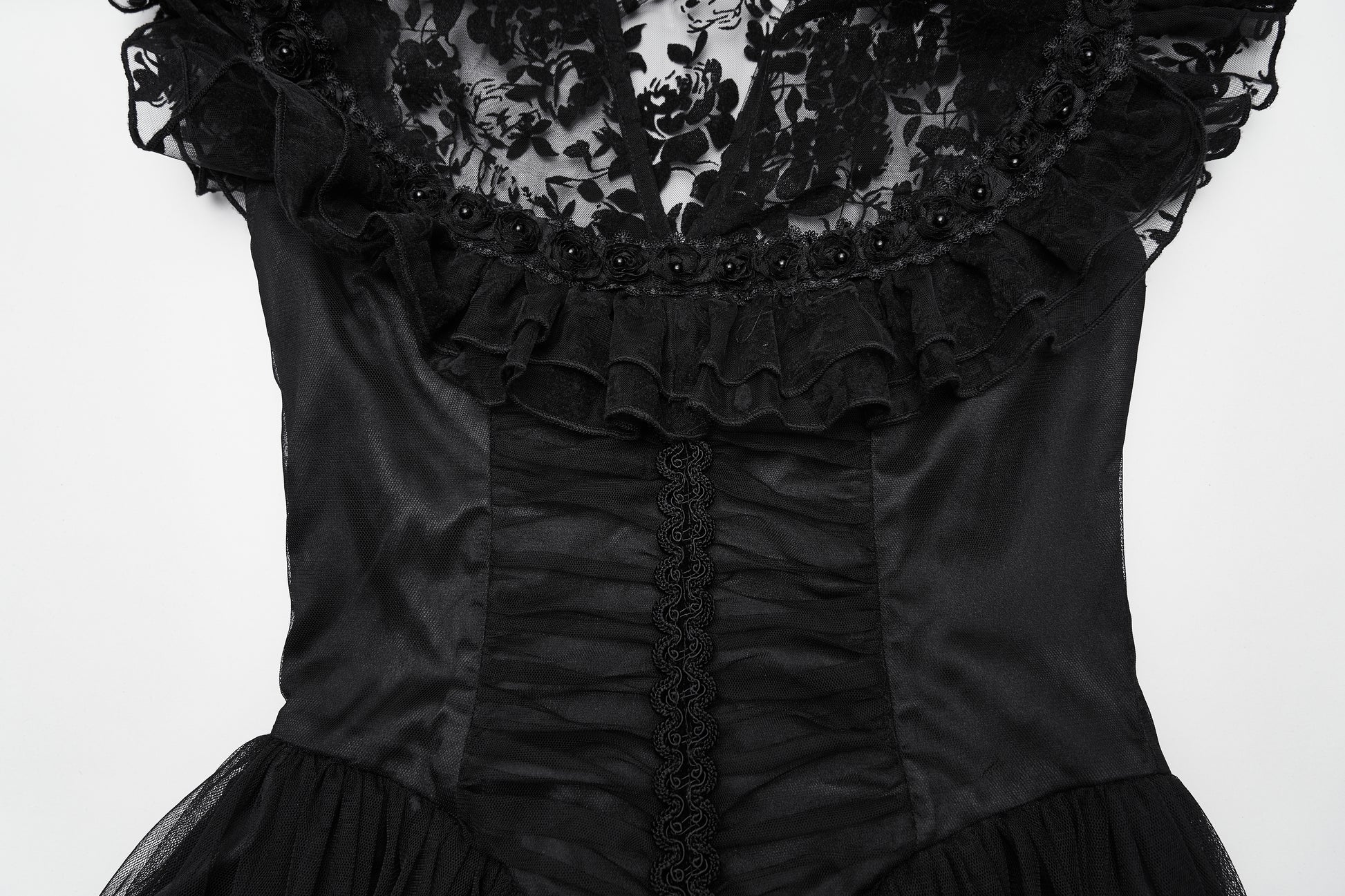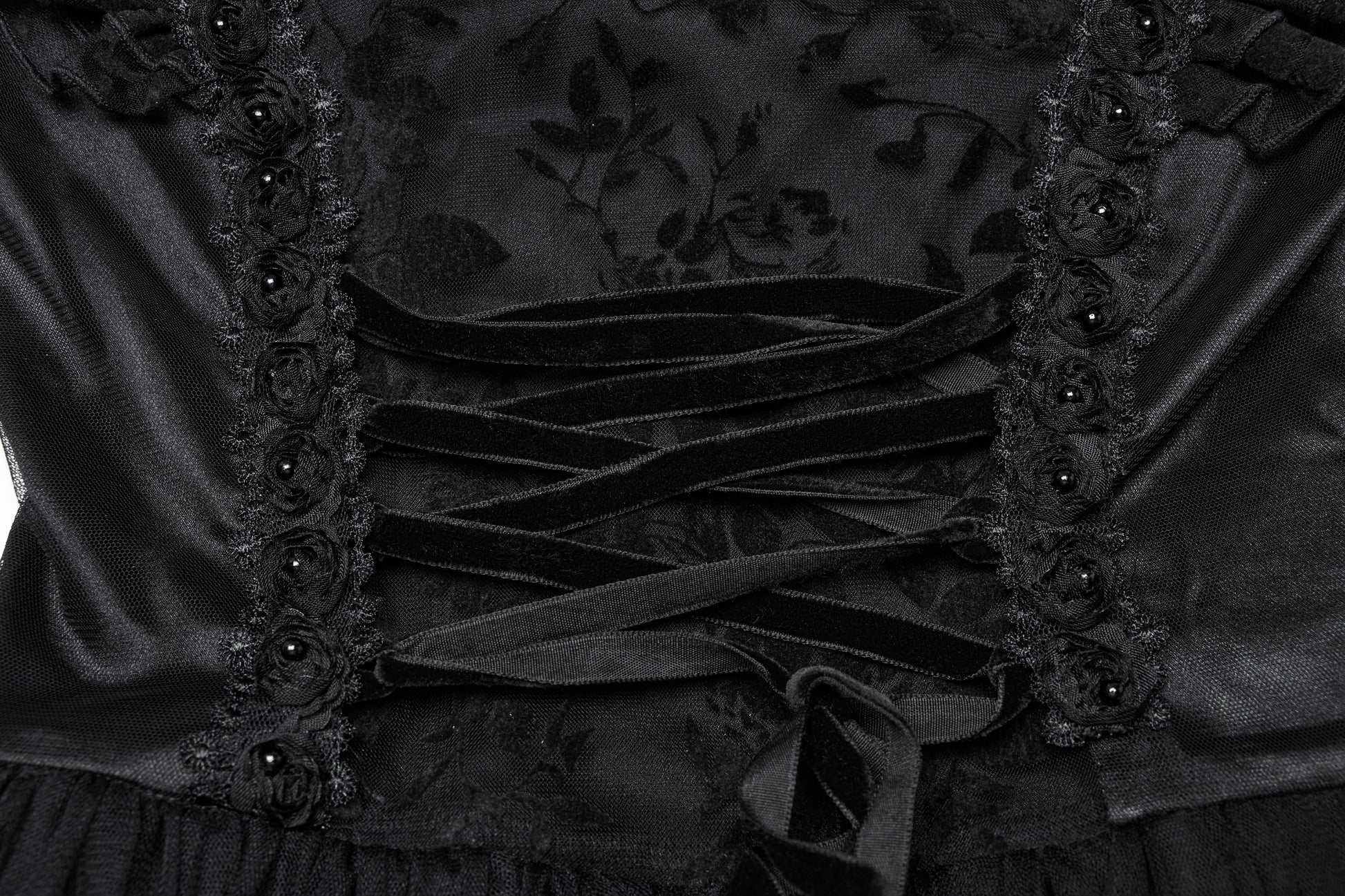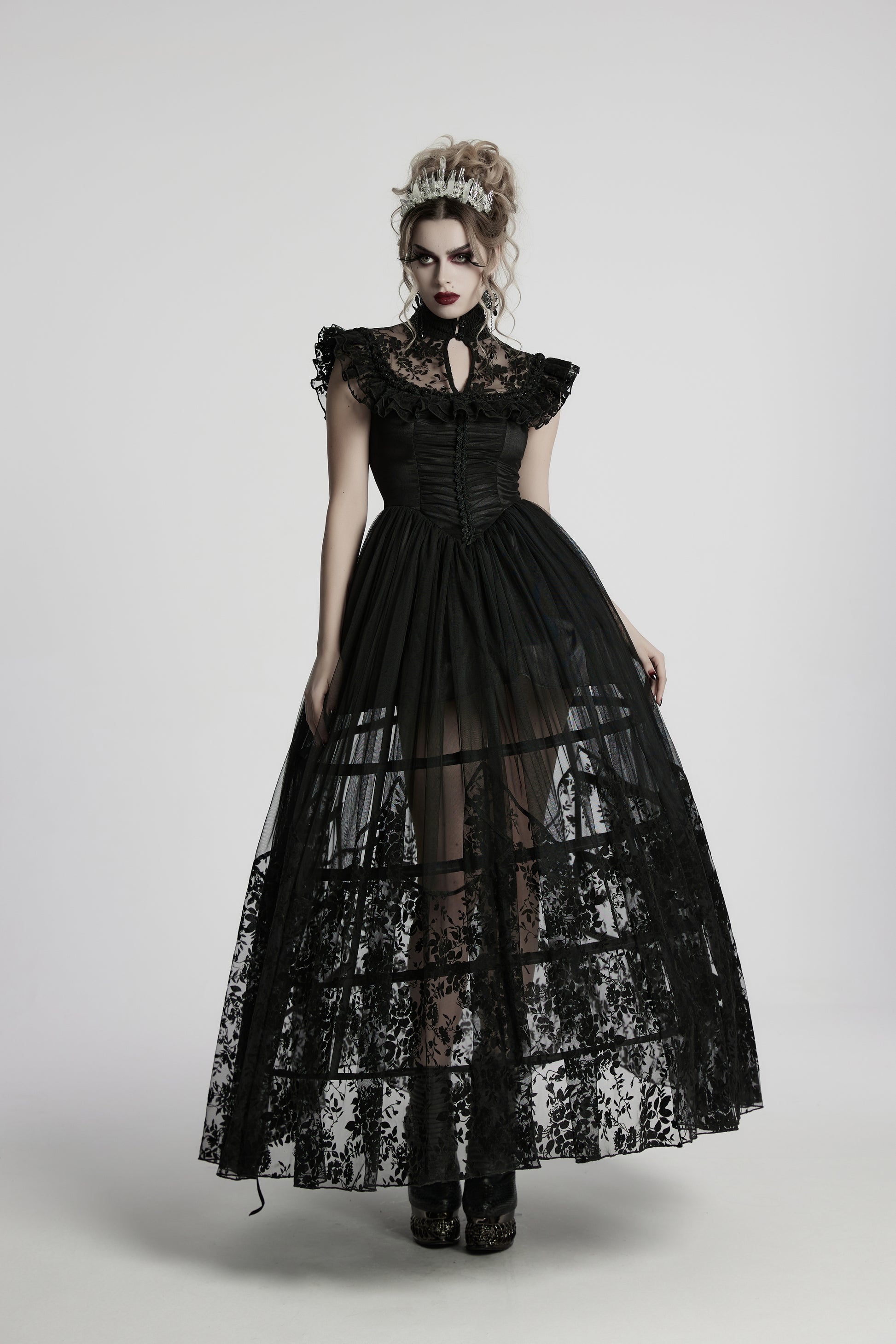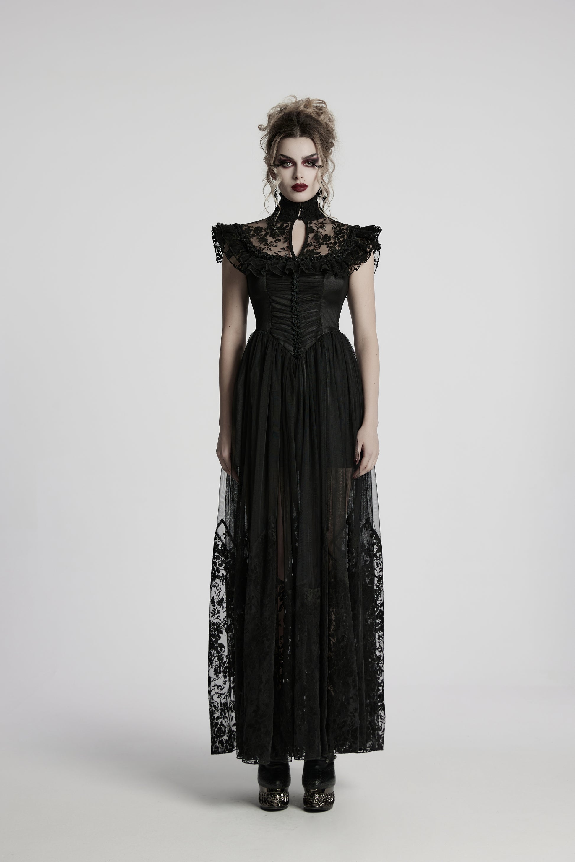 The flowing mesh skirt enhances movement and drama, making it perfect for gothic soirées, alternative fashion events, or any moment you want to embody mysterious grace. This statement dress invites you to own the night with confidence and poise.
