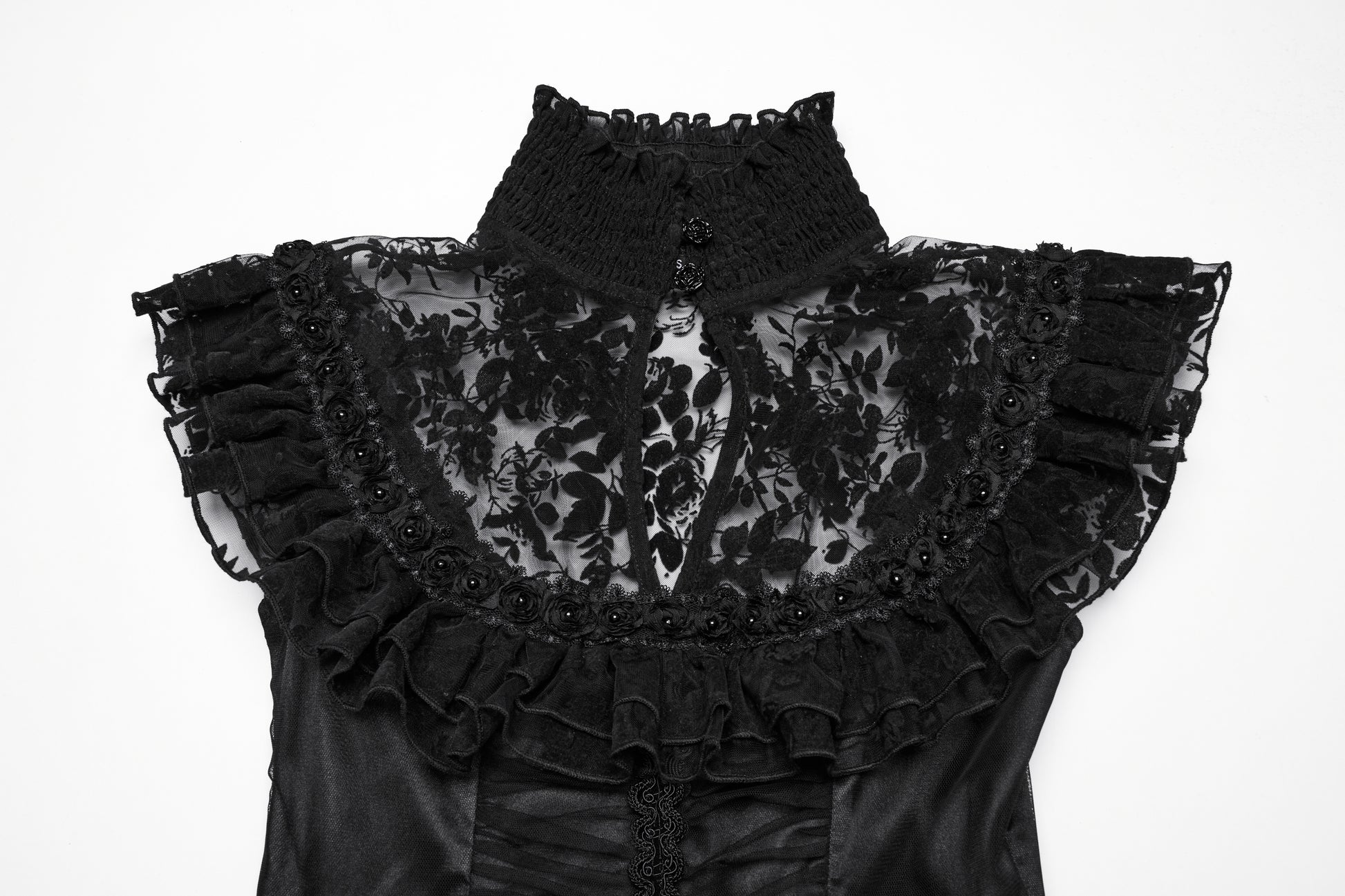 Step into ethereal elegance with the Punk Rave Seraphina Goth Flying Sleeve Dress – a mesmerising blend of romance and dark allure. Crafted from luxurious flocking mesh and satin, this long dress features intricate velvet floral patterns that cascade over a sheer silhouette, creating a spellbinding effect. The high, stand-up layered collar with keyhole detail adds a refined, Victorian-inspired touch, while the corset-style bodice cinches the waist for a flattering shape. Delicate lace ruffles edged with roses and pearls complete the look, giving the piece an opulent finish that whispers of midnight enchantment.
