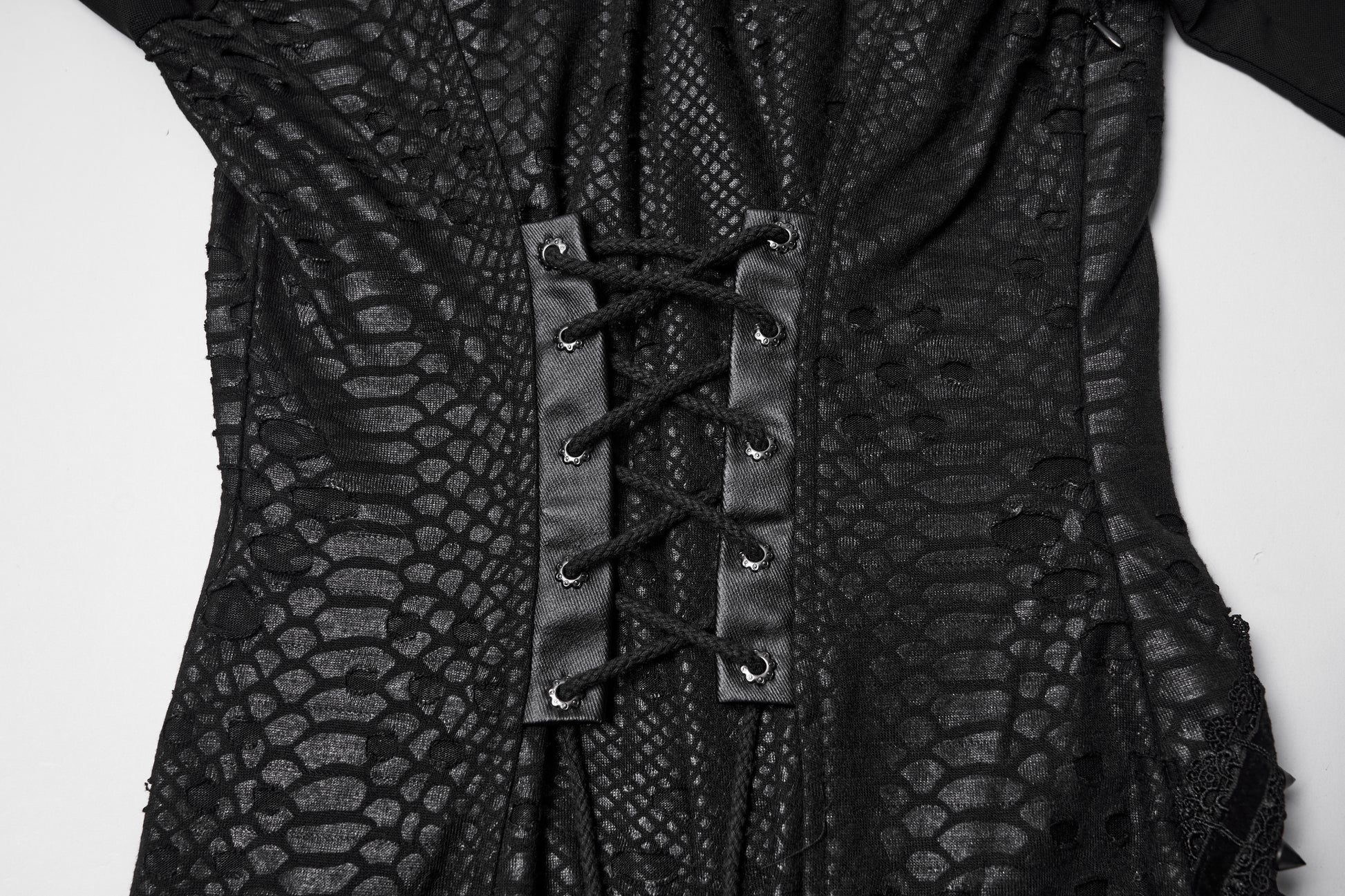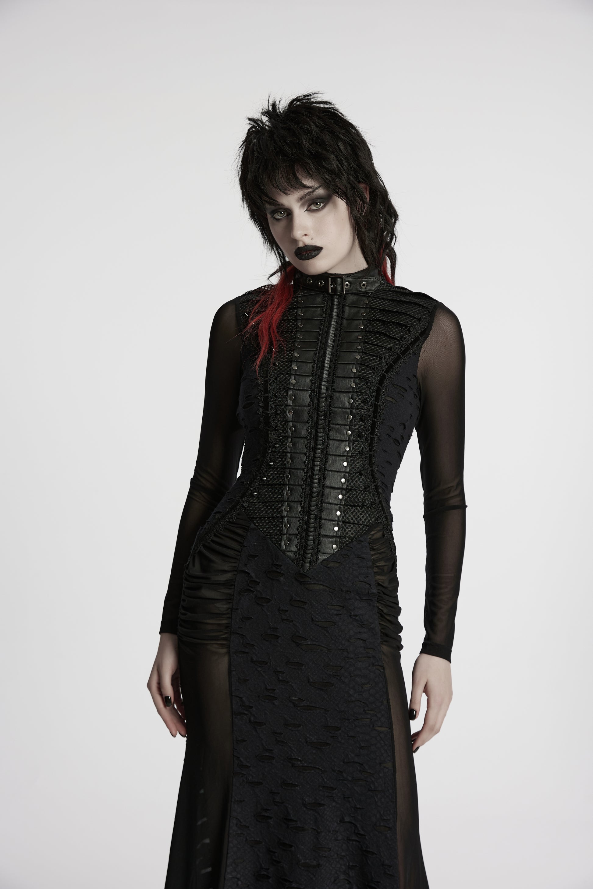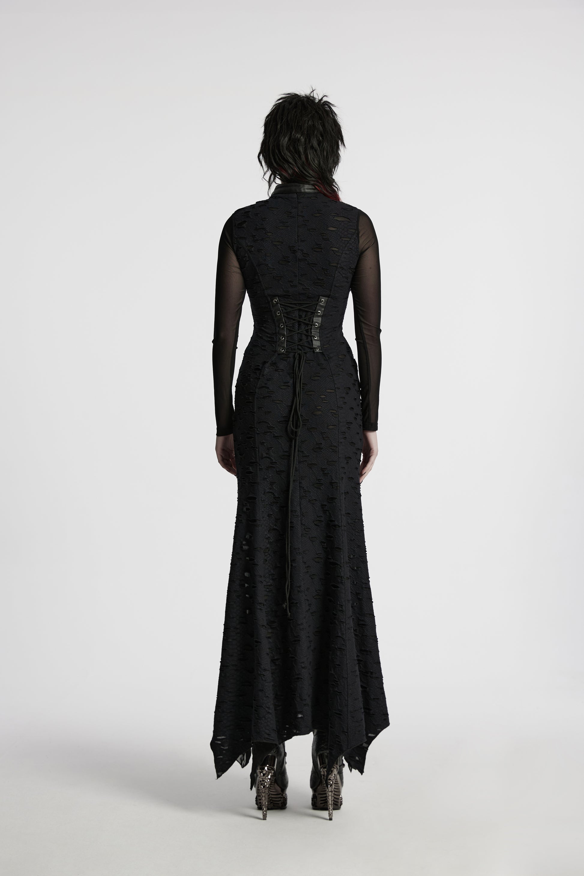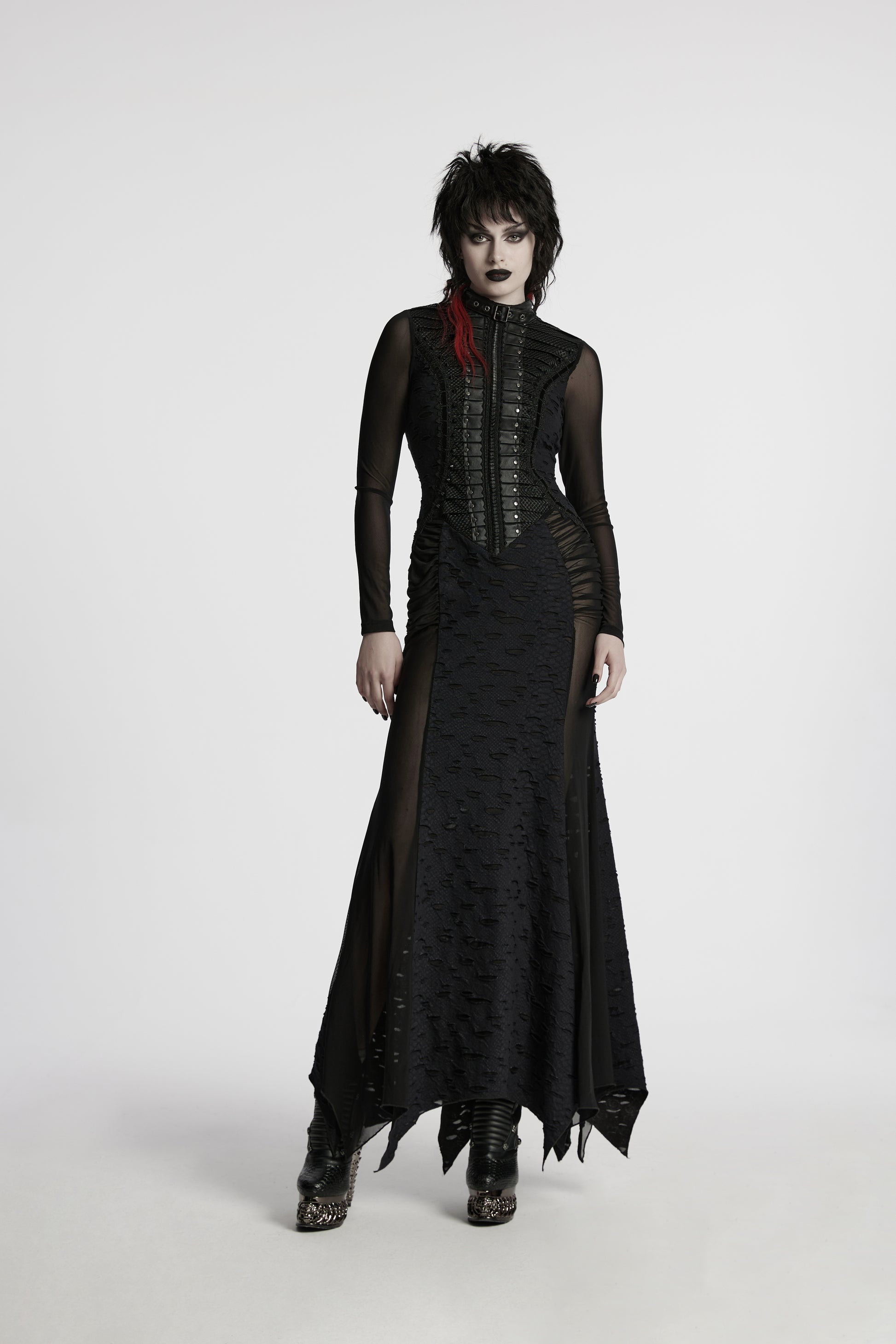 Step into the spotlight with the Punk Rave Seraphine Spinal Lace Panel Maxi Dress – Black, a show-stopping design that fuses gothic elegance with a bold, structured silhouette. Crafted from tattered-effect composite honeycomb mesh and elastic mesh, the dress features a pleated front panel enriched with spinal webbing details and lace inserts for a striking, textural finish. The waistline is accentuated with lace and spike embellishments, while the back features a corset-style lace-up for a perfect fit. Finished with a high neck and an invisible back zipper for easy wear, this full-length gown is perfect for dramatic entrances at alternative events.