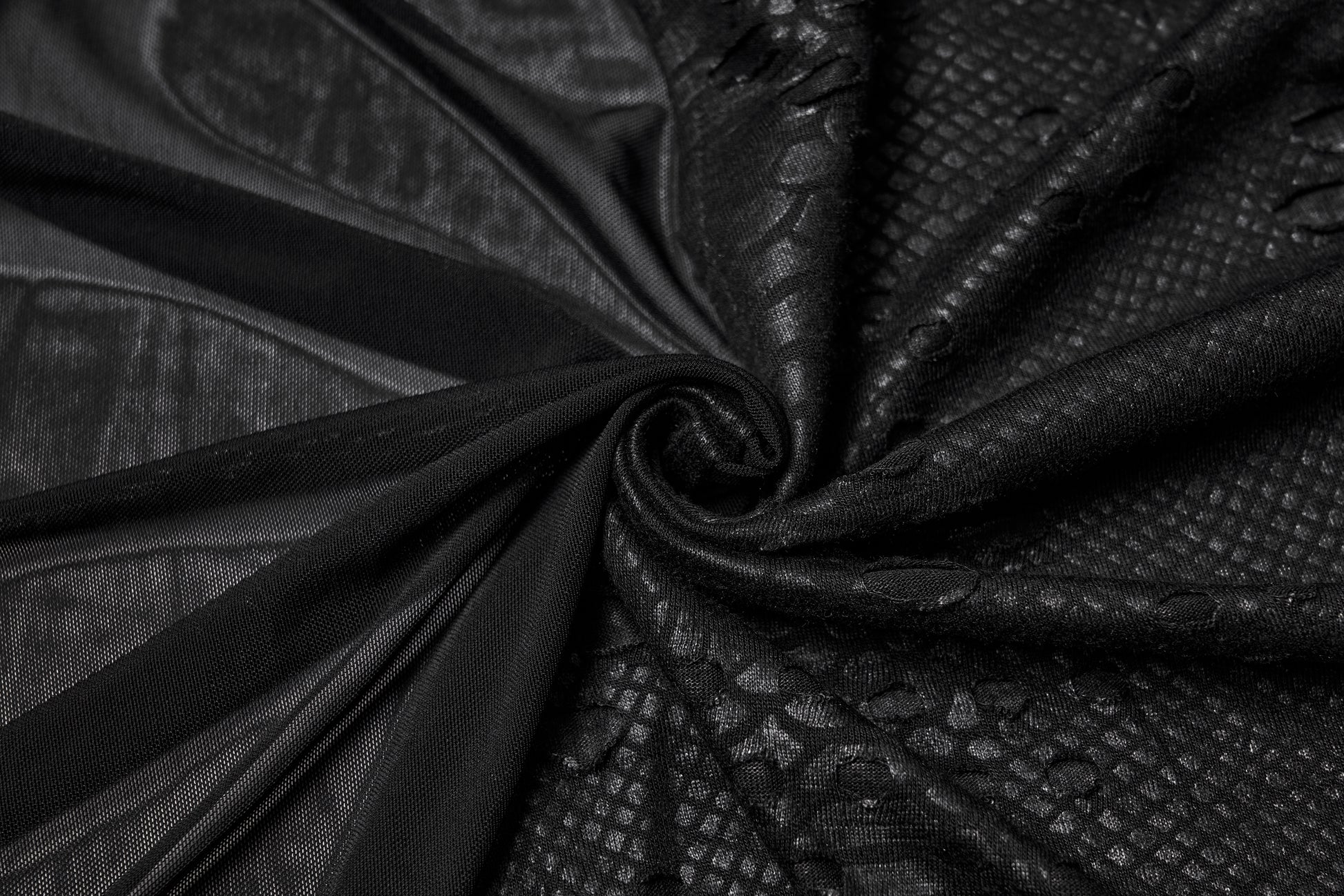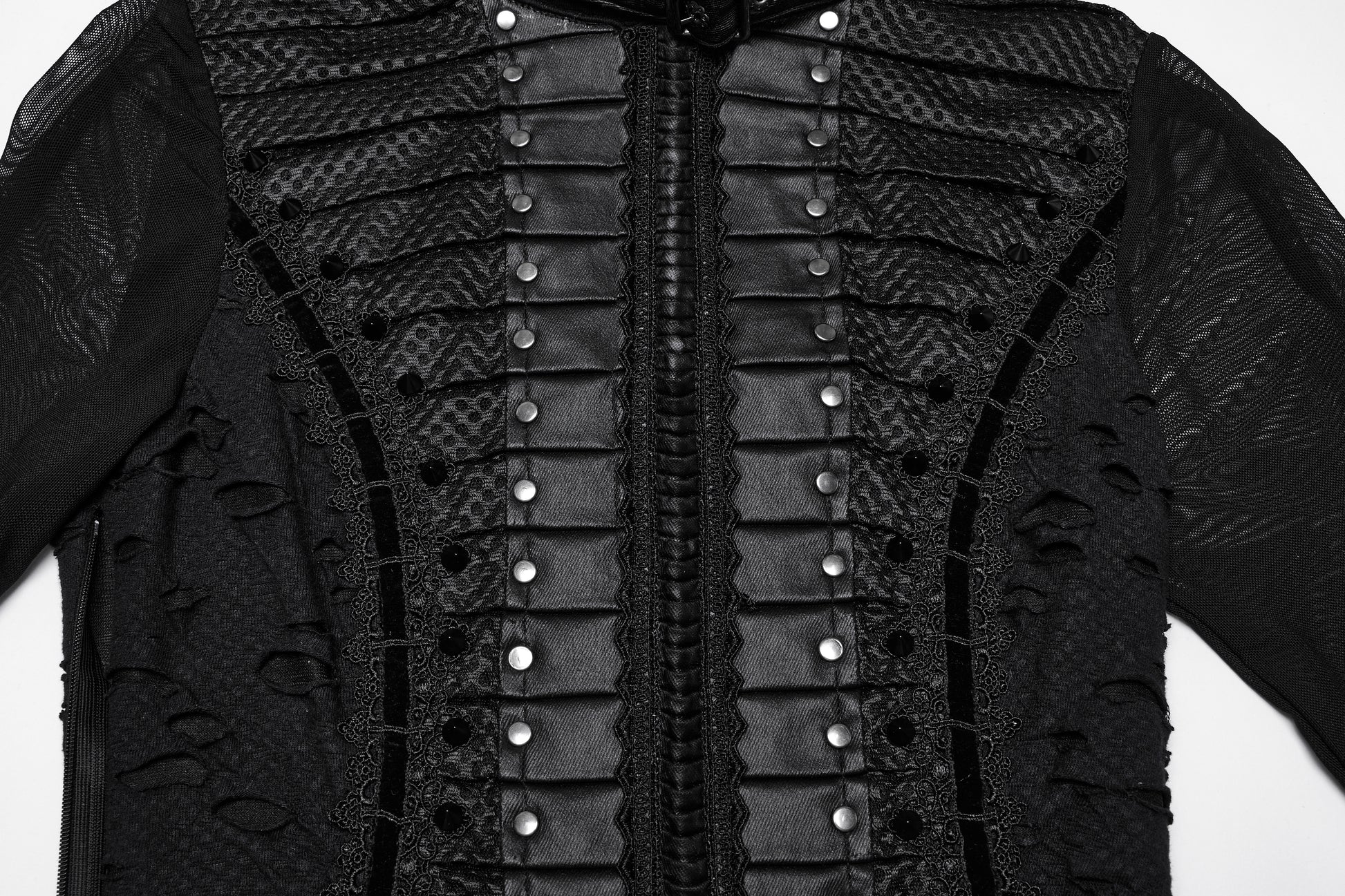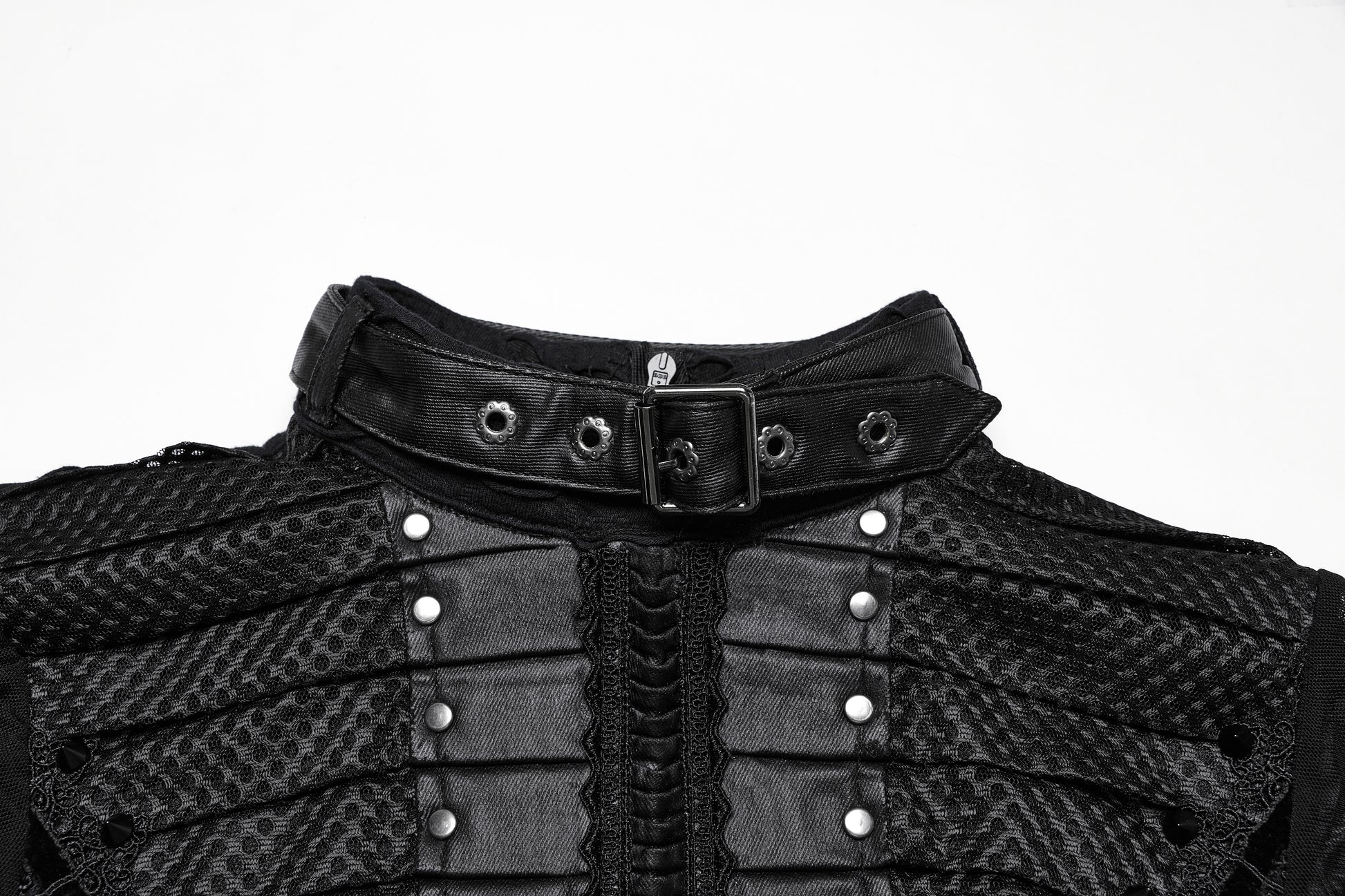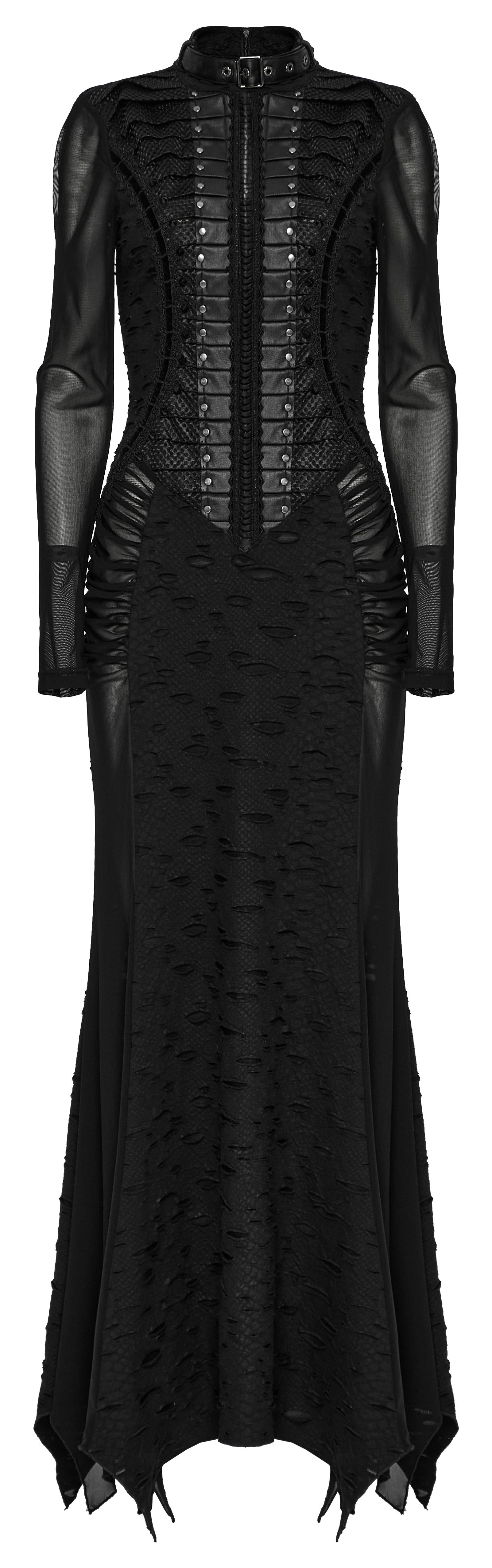 Step into the spotlight with the Punk Rave Seraphine Spinal Lace Panel Maxi Dress – Black, a show-stopping design that fuses gothic elegance with a bold, structured silhouette. Crafted from tattered-effect composite honeycomb mesh and elastic mesh, the dress features a pleated front panel enriched with spinal webbing details and lace inserts for a striking, textural finish. The waistline is accentuated with lace and spike embellishments, while the back features a corset-style lace-up for a perfect fit. Finished with a high neck and an invisible back zipper for easy wear, this full-length gown is perfect for dramatic entrances at alternative events.