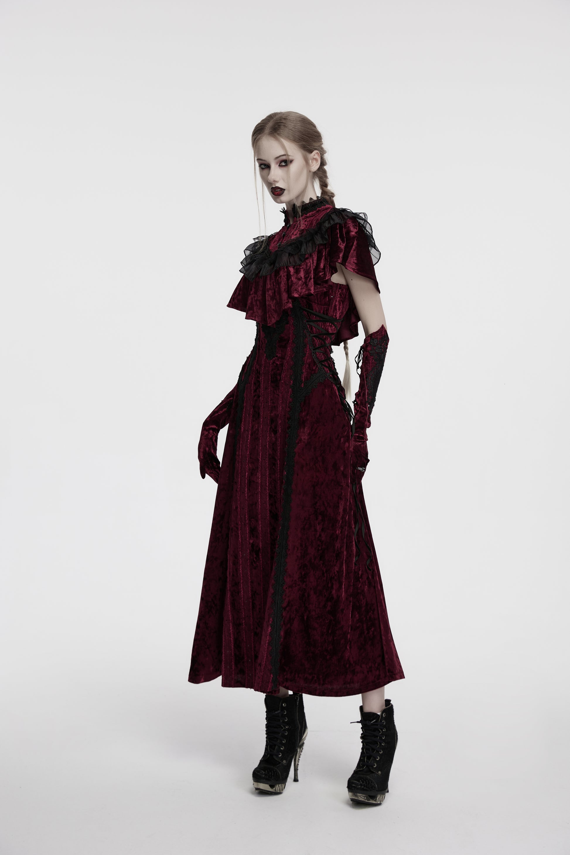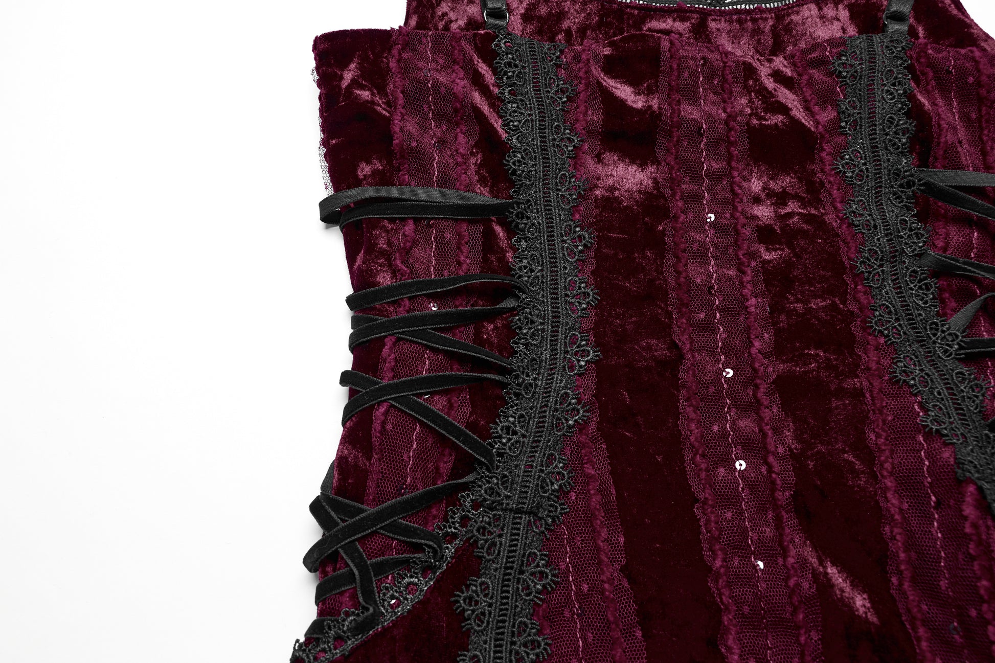 Channel aristocratic elegance with the Punk Rave Vivienne Velvet Lace Panel Goth Slip Dress – Burgundy. Crafted from rich embroidered velvet with a sultry stretch, this regal slip dress brings vintage opulence into the modern goth wardrobe. Intricate metal-accented lace panels elongate the silhouette, while the delicate lace-trim neckline frames the décolletage beautifully. Adjustable side straps enhance the fit and add subtle flair, and a concealed back zip makes for effortless wear. A masterpiece for romantic goths, witchy evenings, and alternative formal occasions.