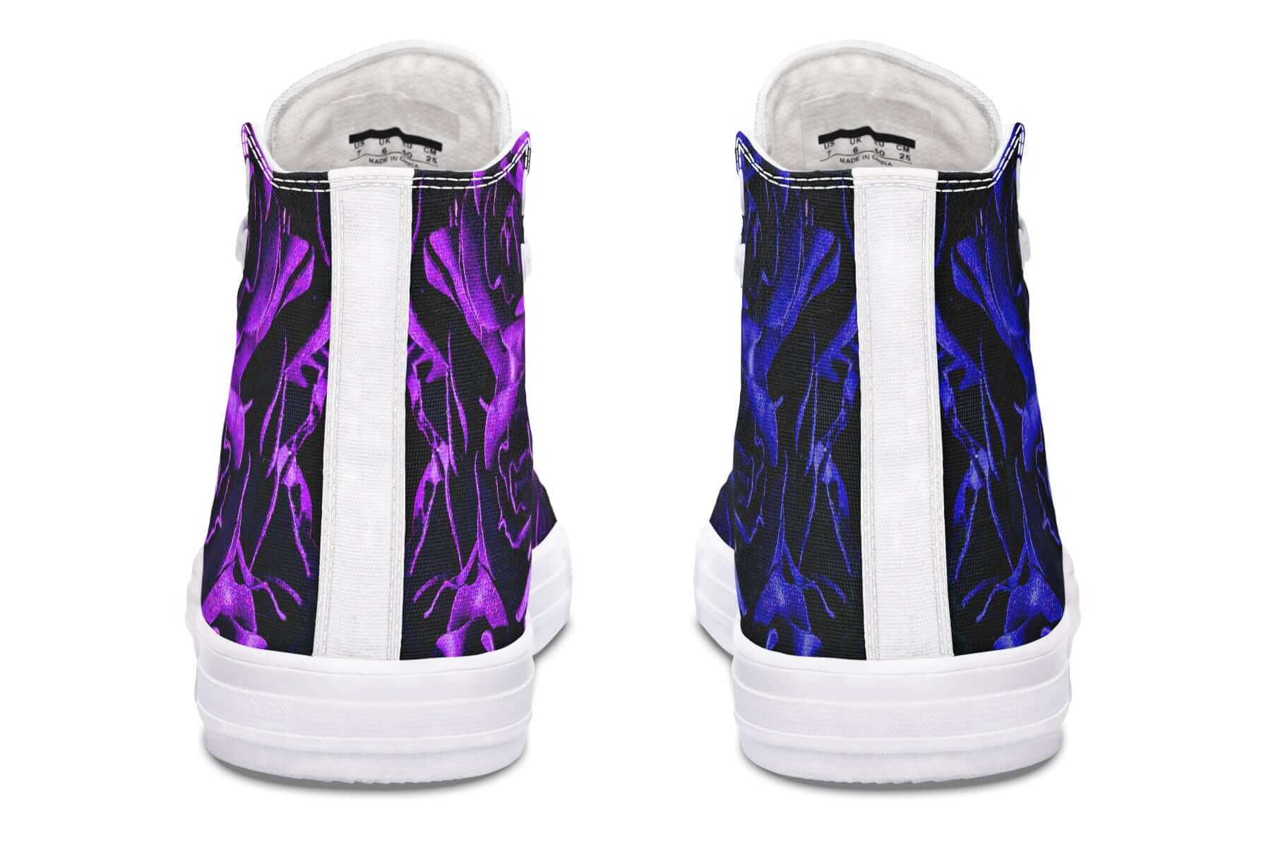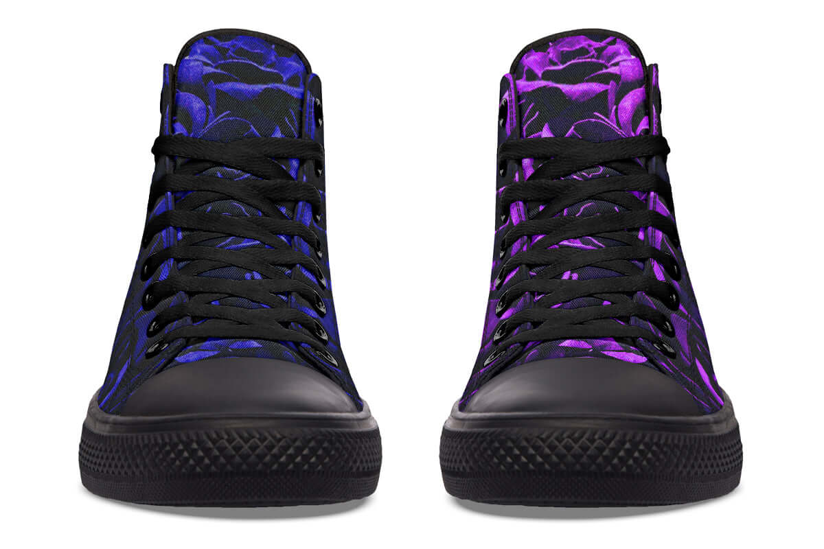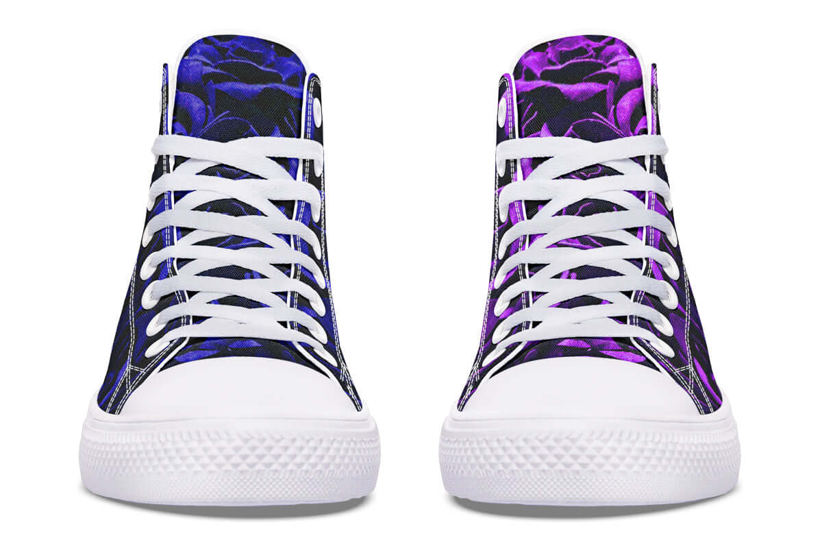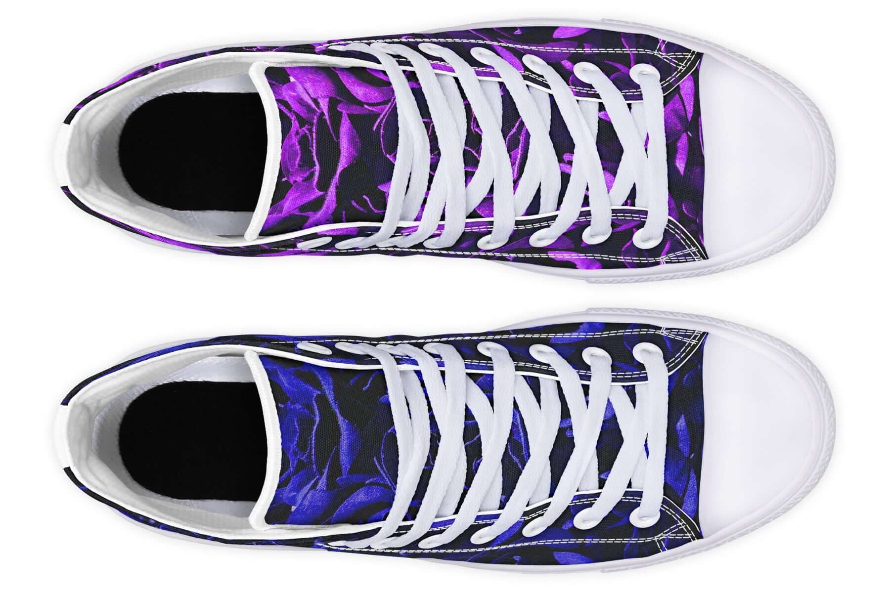 Gothic elegance meets floral power in the Purple & Indigo Roses High Tops by ANTIBrand. These statement trainers blend bold purple and electric indigo roses over black canvas for a captivating, asymmetrical look – each shoe a unique piece of wearable art.