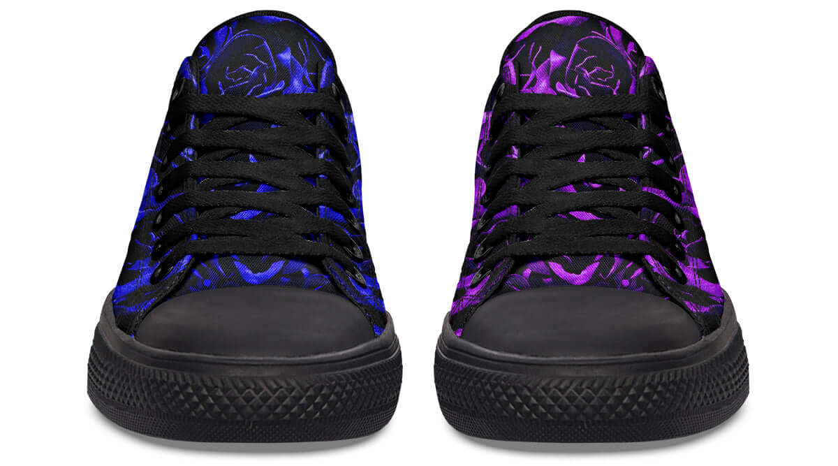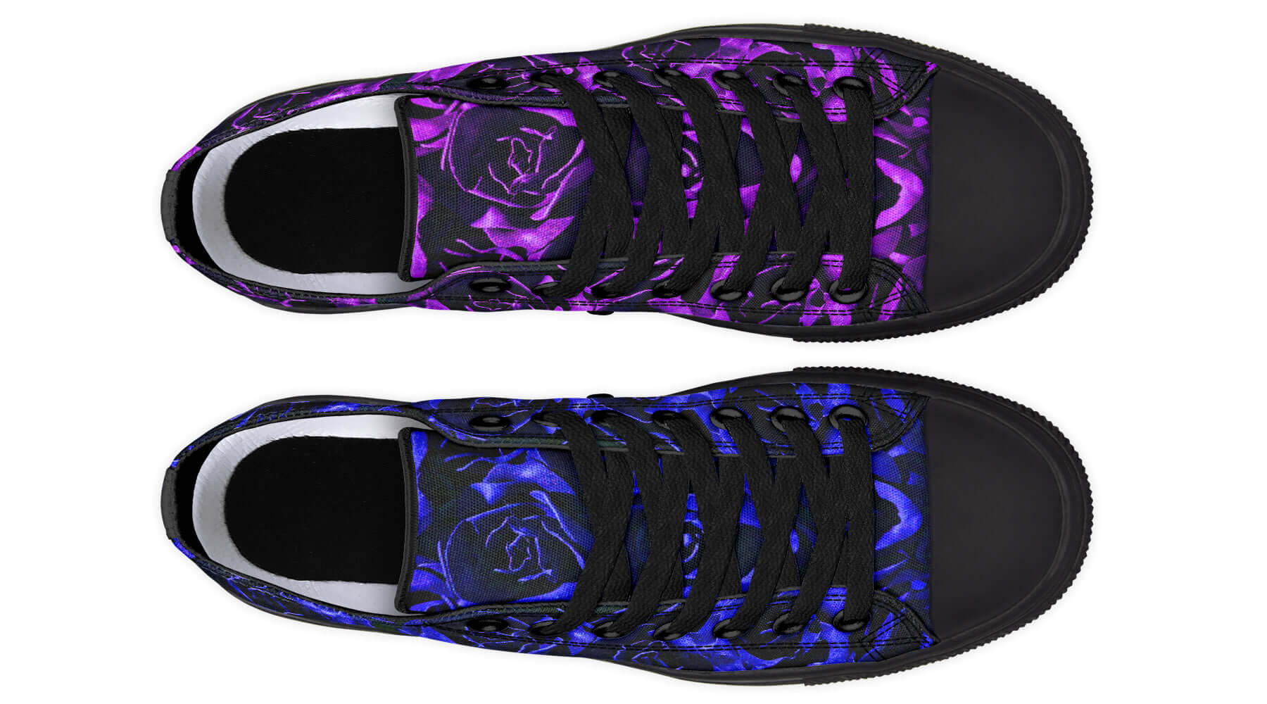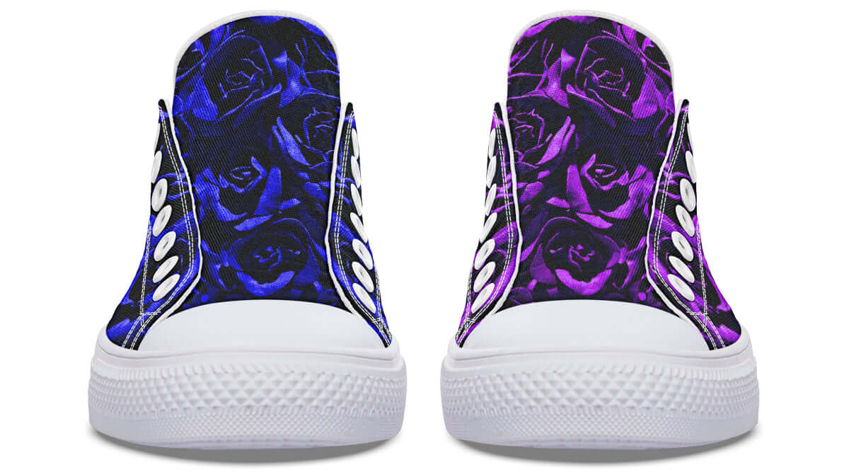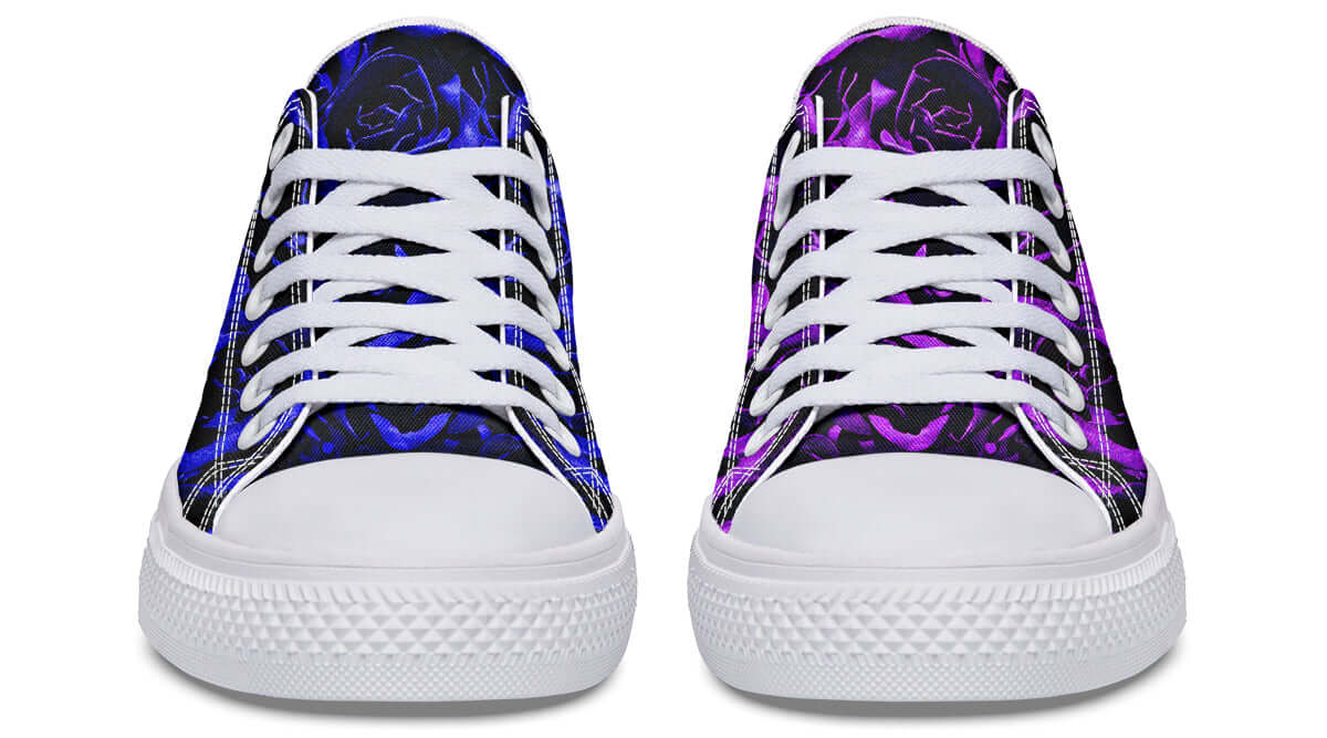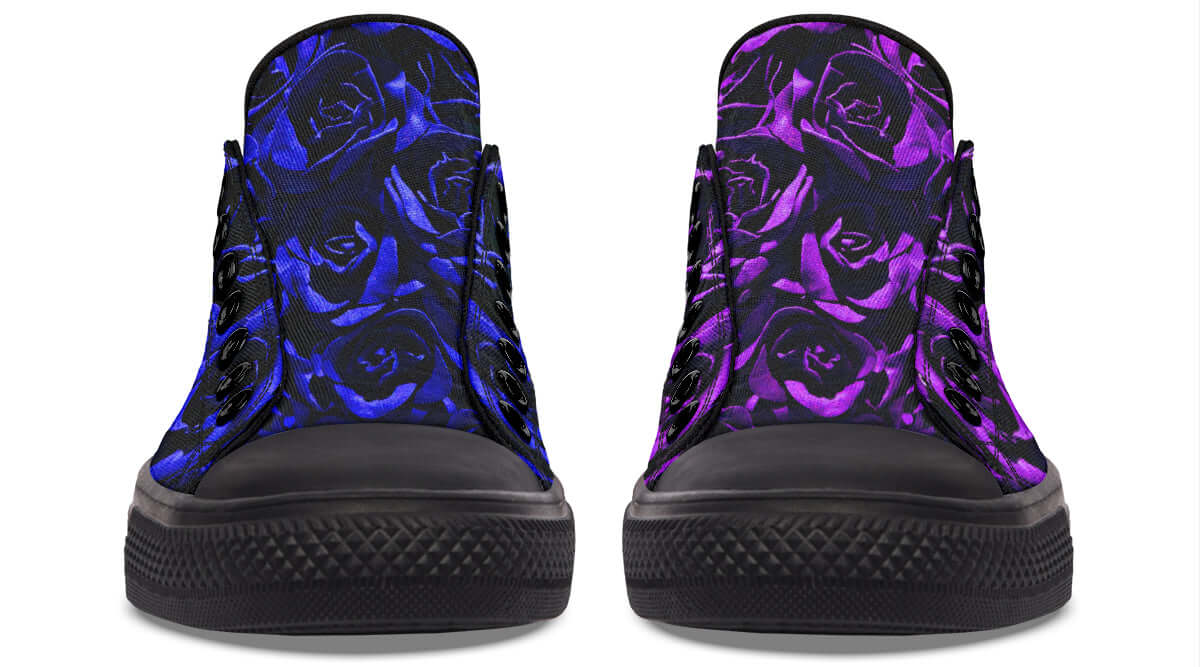 Dark romance blooms with the Purple & Indigo Rose Low Tops by ANTIBrand. These canvas trainers combine gothic aesthetics with everyday edge, featuring a bold split rose print – one shoe in indigo, the other in purple.